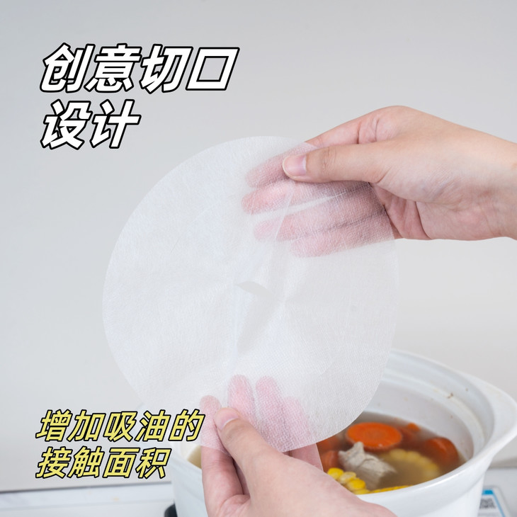 纸面上独特的切口 不仅可以更快地吸附表面浮油 还能贴合汤面,不会漂到边缘 这种设计非常科学 切口能增加吸油的接触面积 提升吸油效率