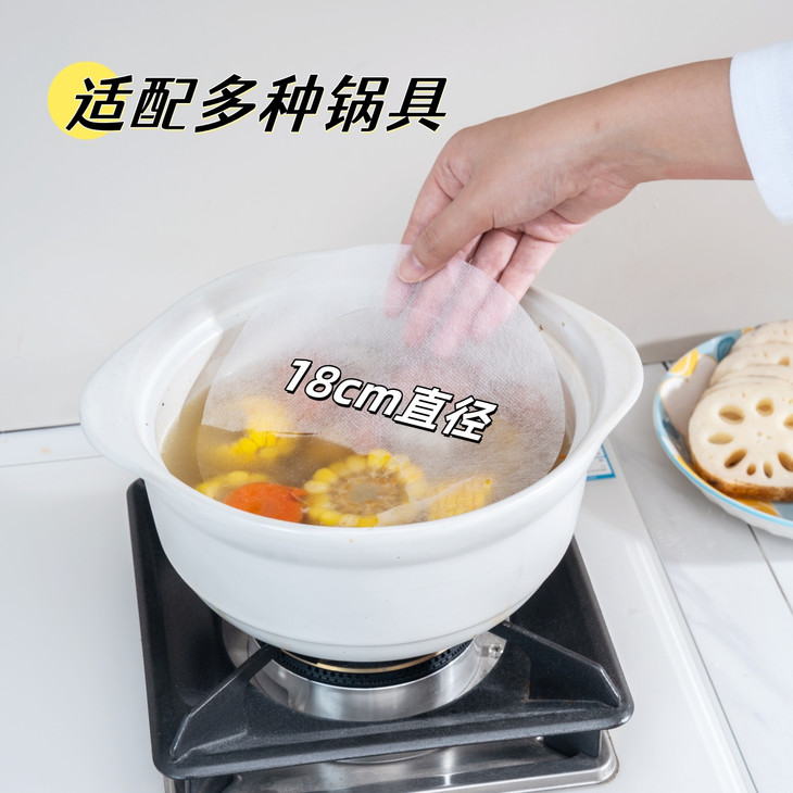 🔄 亮点5:18cm直径,适配多种锅具 吸油纸的18cm大直径设计 非常贴心地考虑到了各种家用锅具的大小 无论你用的是20cm的奶锅、小汤锅 还是更大的煲汤锅,都能轻松适用 实际测量下来 这个尺寸刚刚好覆盖汤面 几乎适合家里所有锅具使用