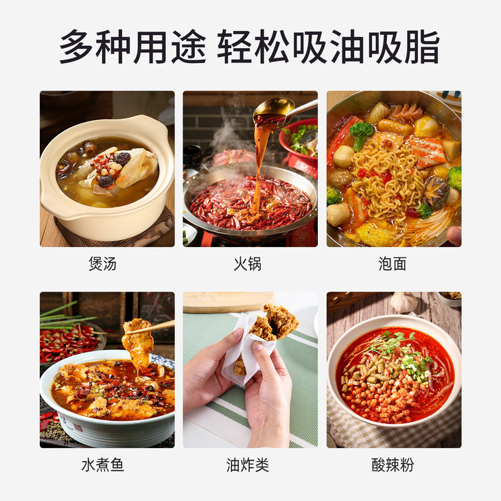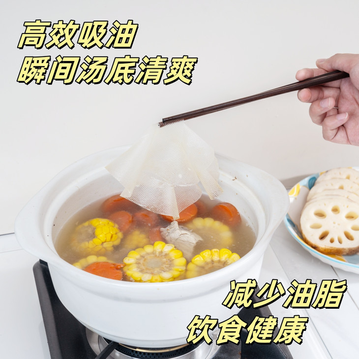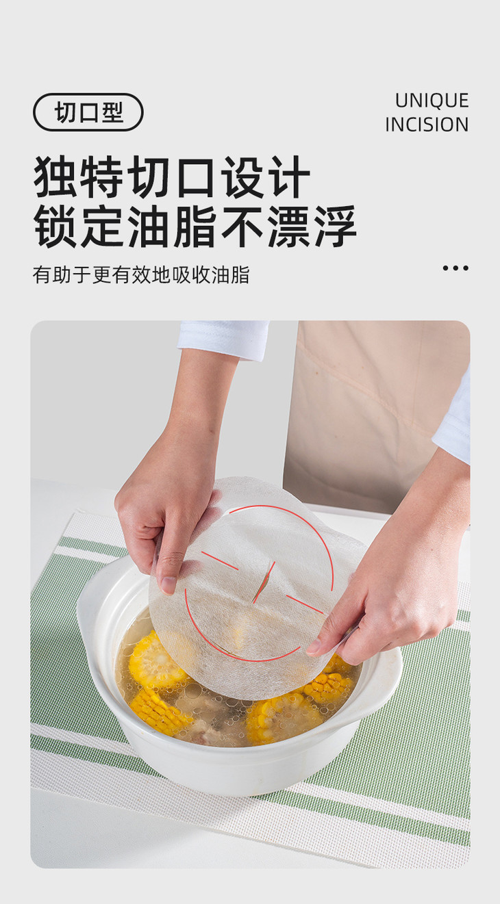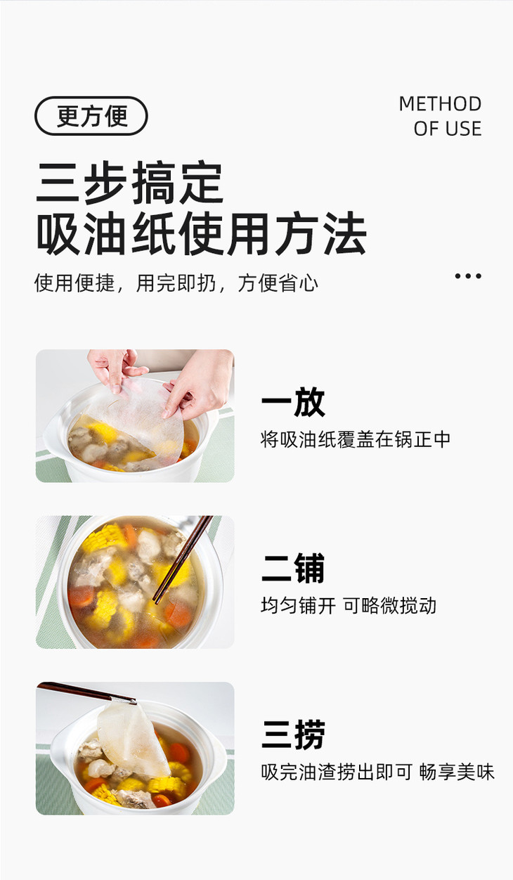 📦 亮点6:简单方便,一步去油不麻烦 我们平时在厨房里忙活 最怕的就是复杂的操作 好在这款吸油纸的使用方法特别简单! 步骤如下: ①煲汤快结束时,将吸油纸平铺放在汤的表面 ②用筷子轻轻按压,让吸油纸贴合浮油 ③静待10-15秒后,将吸油纸取出,丢弃即可