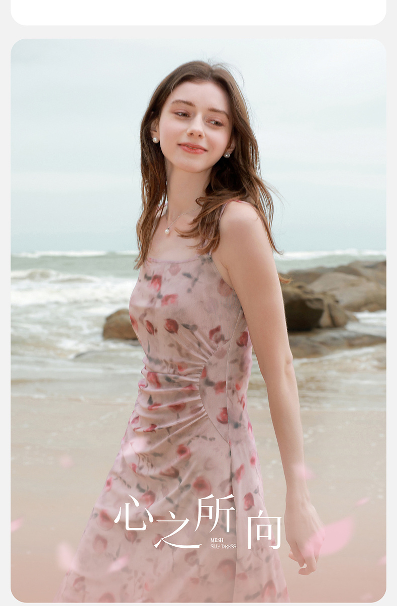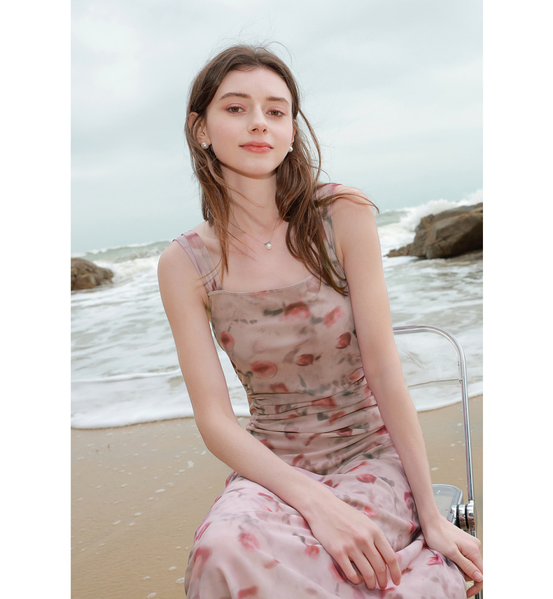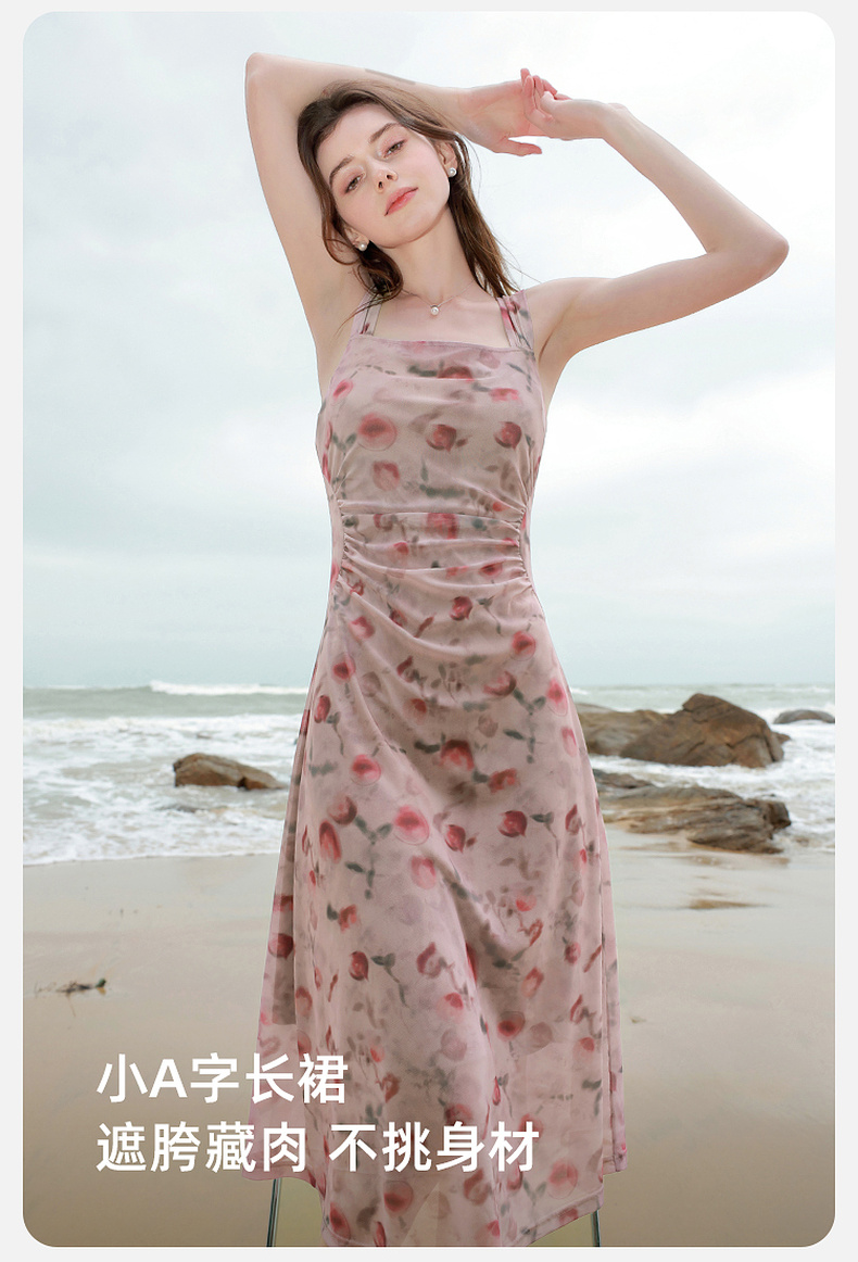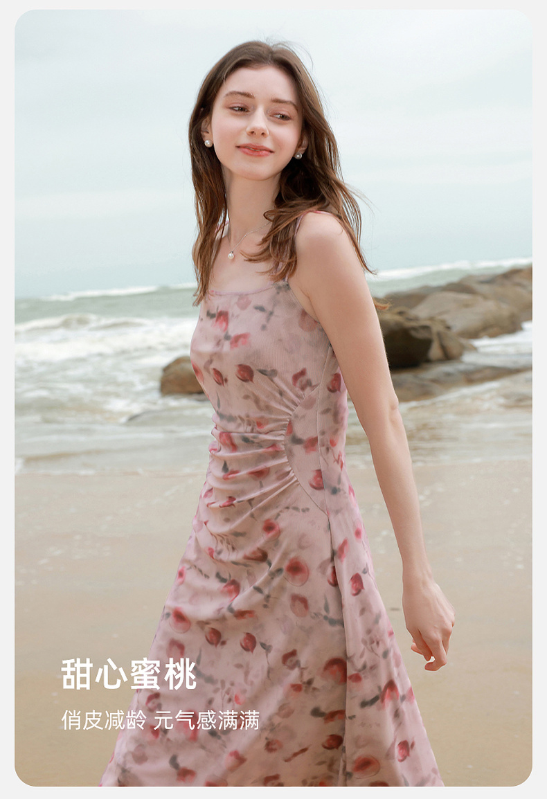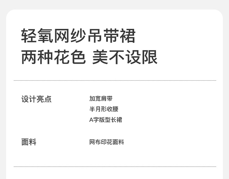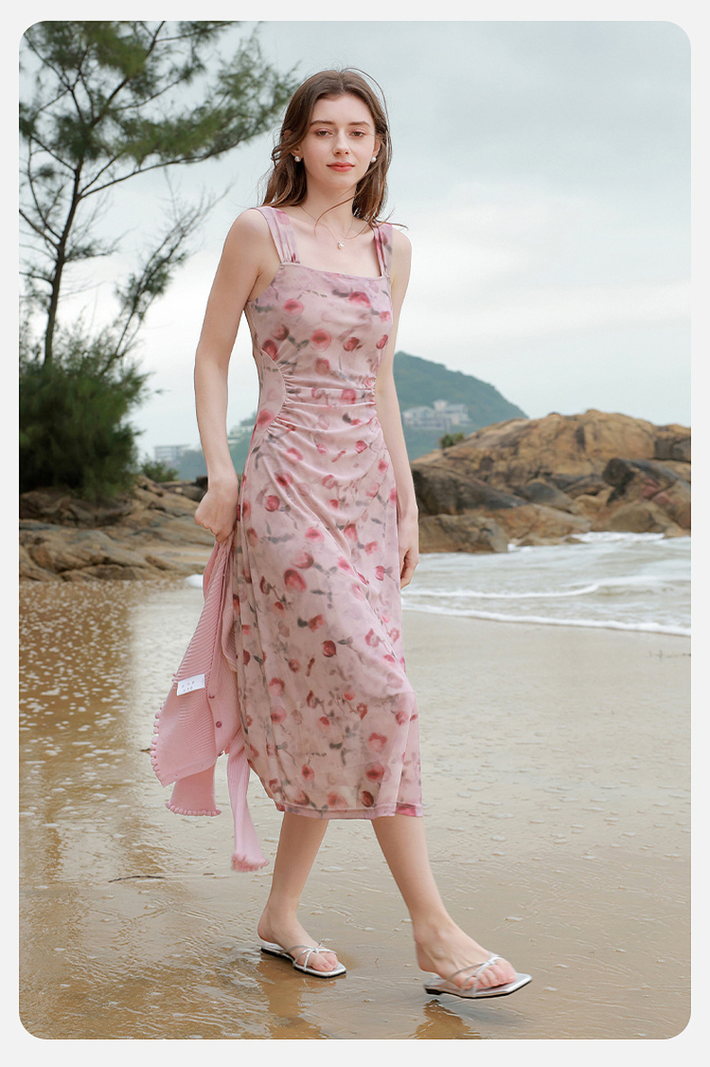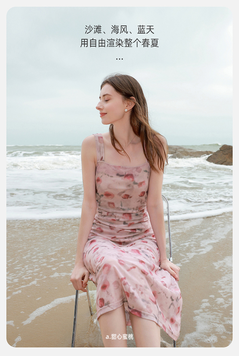三彩2026春季新款网纱印花吊带裙方领收腰A字连衣裙F