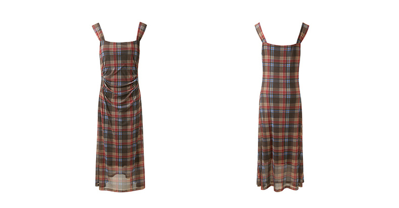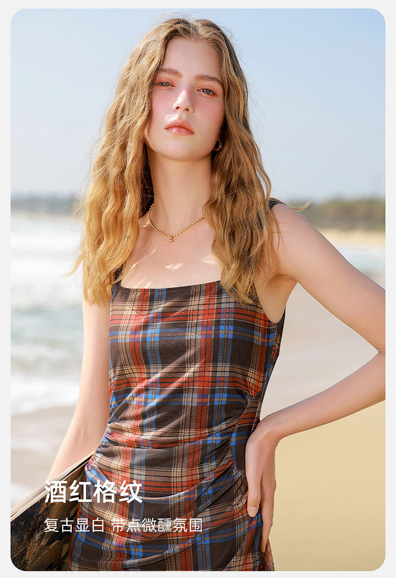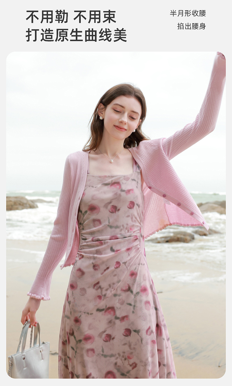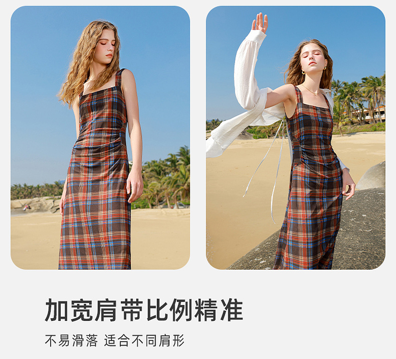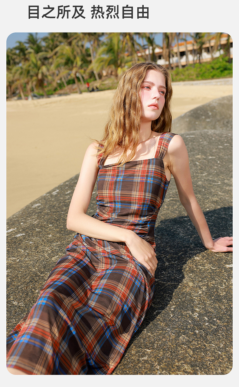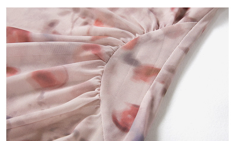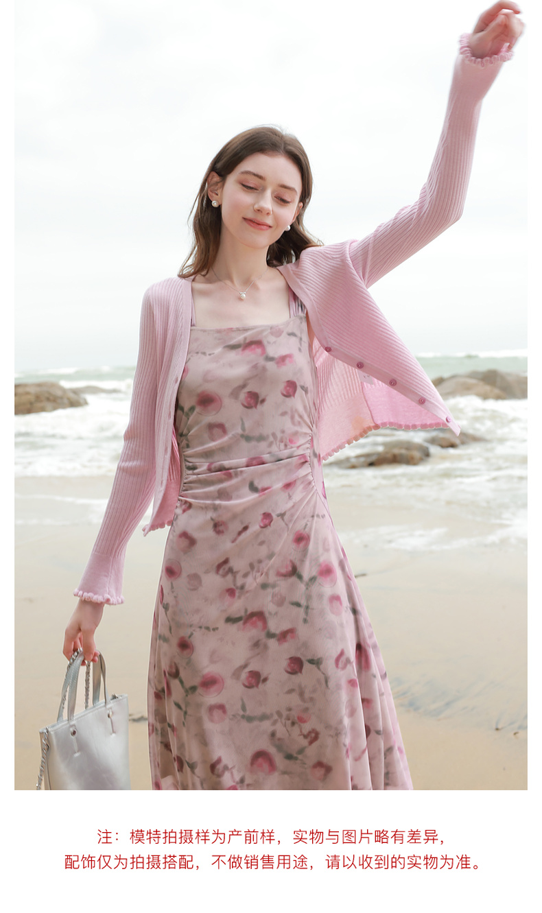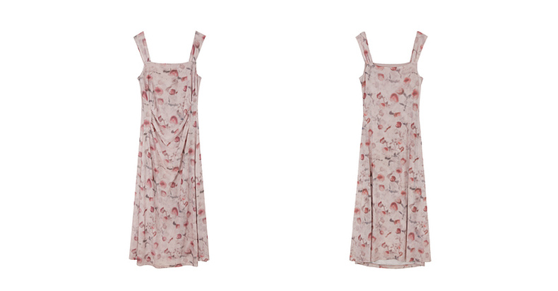 三彩2026春季新款网纱印花吊带裙方领收腰A字连衣裙F