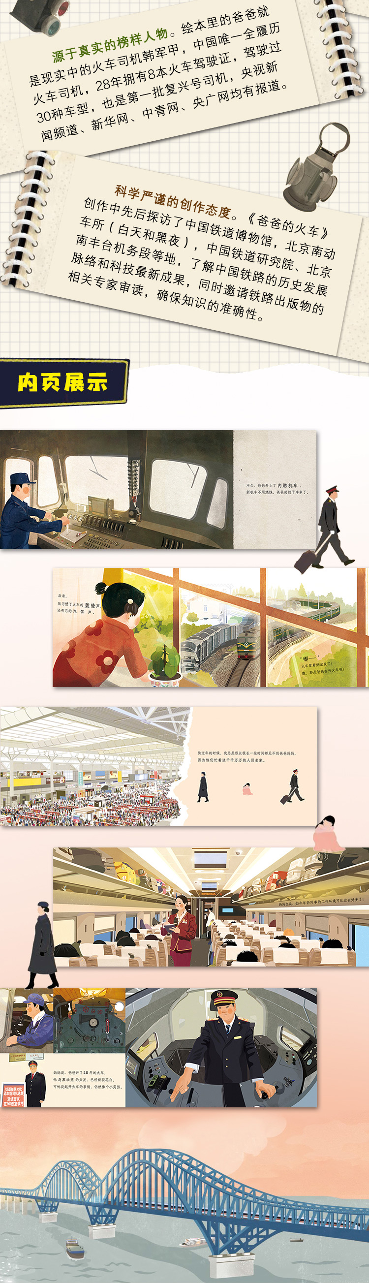 2、源于真实的榜样人物。绘本里的爸爸就是现实中的火车司机韩军甲,中国*全履历火车司机,28年拥有8本火车驾驶证,驾驶过30种车型,也是*批复兴号司机,央视新闻频道、新华网、中青网、央广网均有报道。