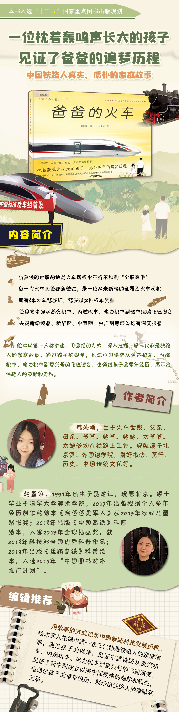 3、科学严谨的创作态度。《爸爸的火车》创作中先后探访了中国铁道博物馆,北京南动车所(白天和黑夜),中国铁道研究院、北京南丰台机务段等地,了解中国铁路的历史发展脉络和科技*成果,确保知识的准确性。