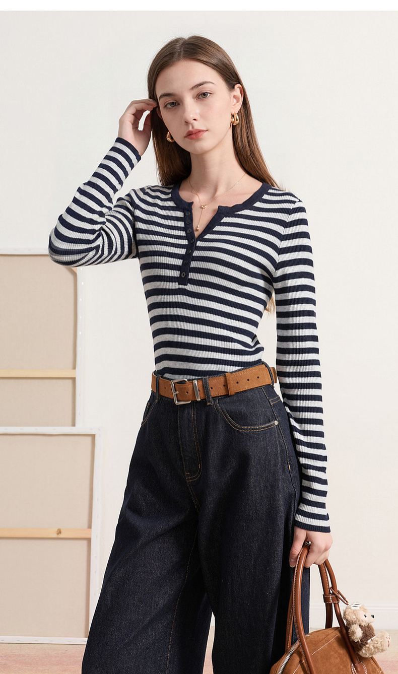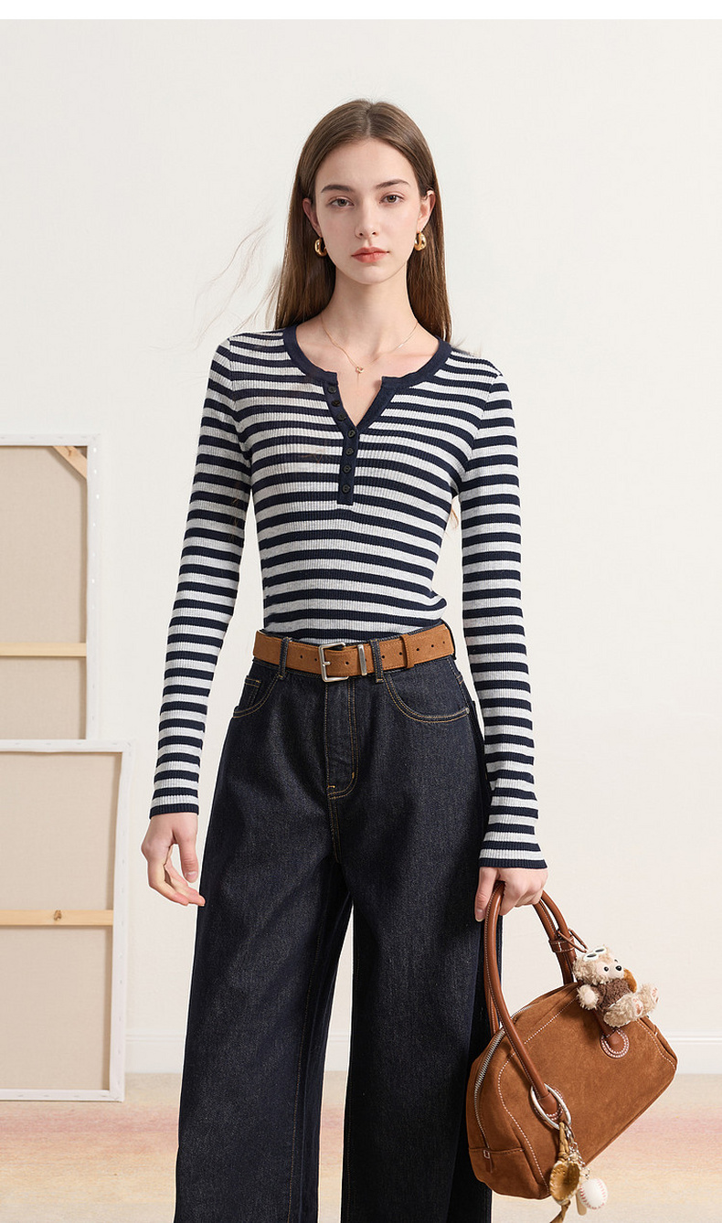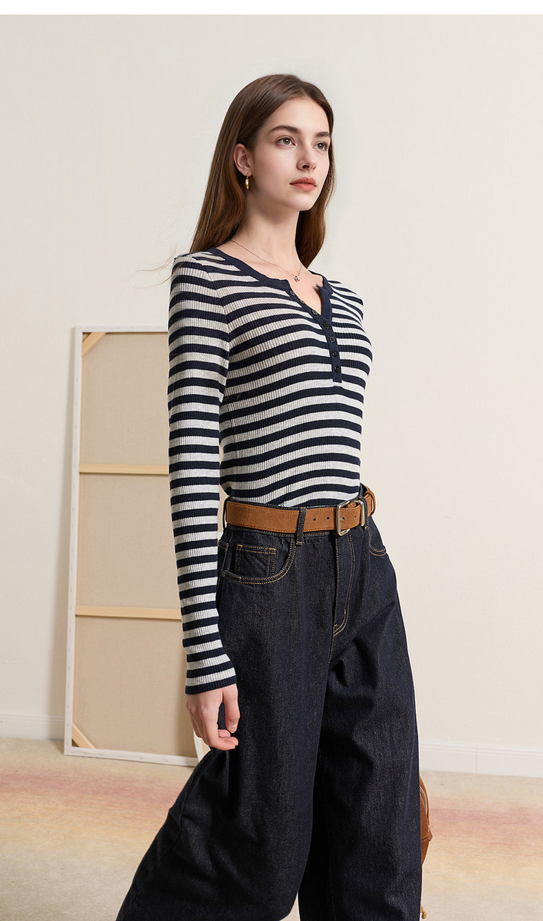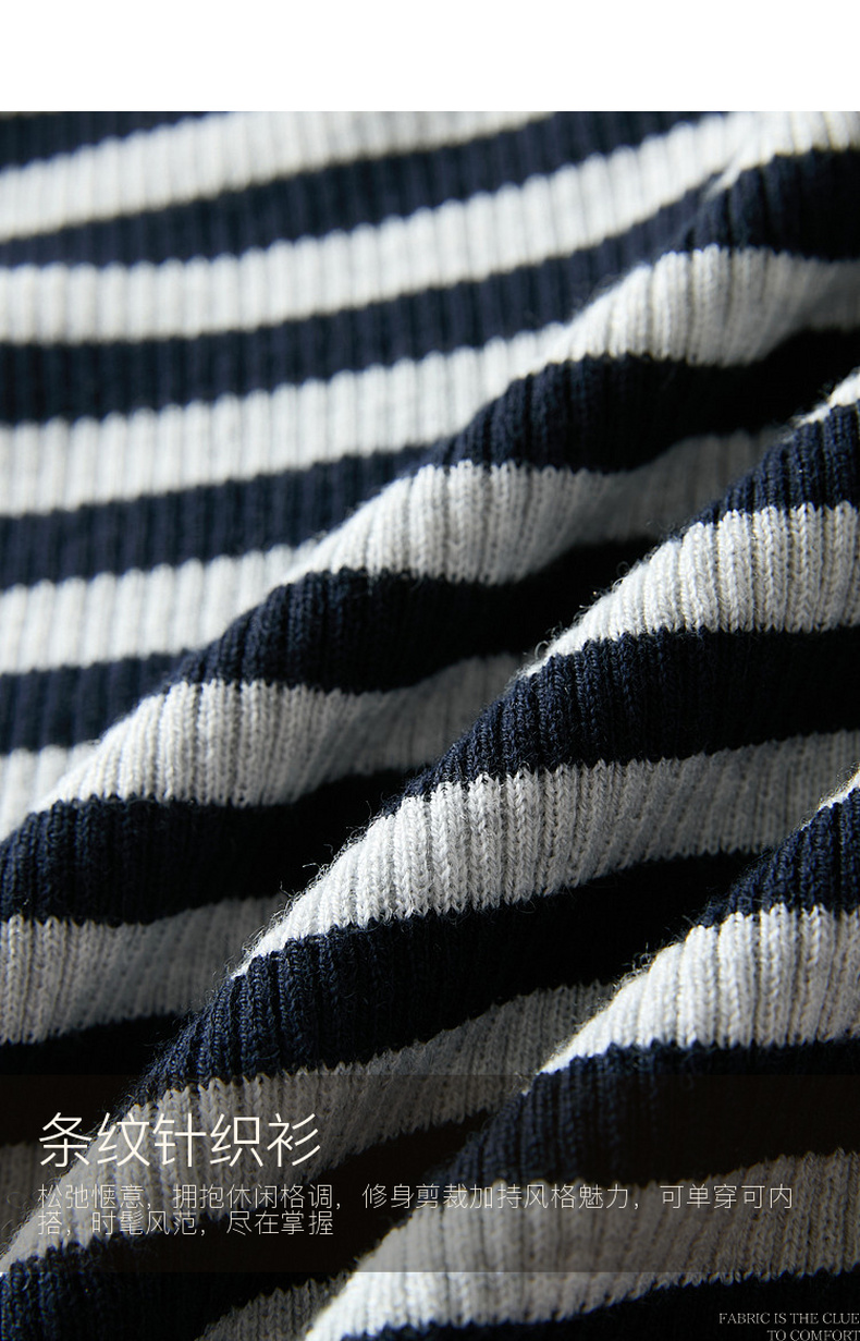 三彩2026春季新款条纹针织衫修身毛衫内搭简约长袖打底衫M