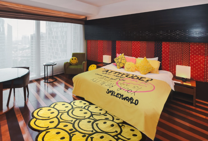 他们还和凯悦旗下的奢华酒店:上海新天地安达仕,合作了推出了SMILEY Home联名主题房