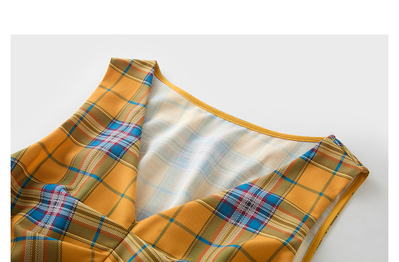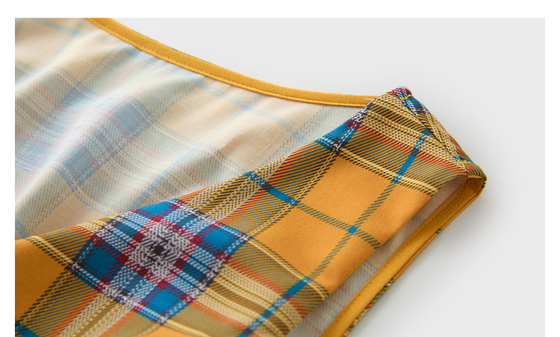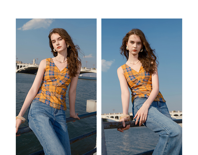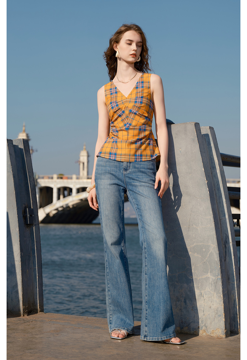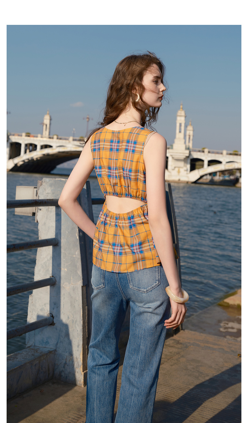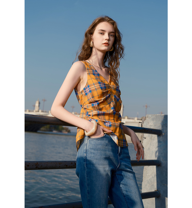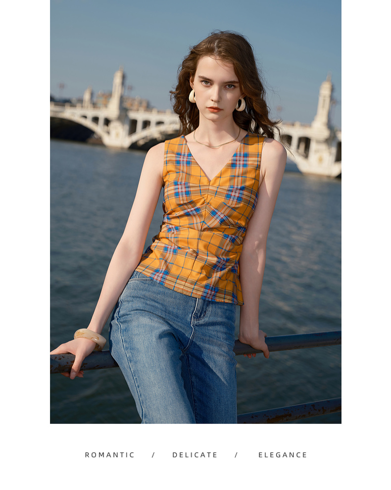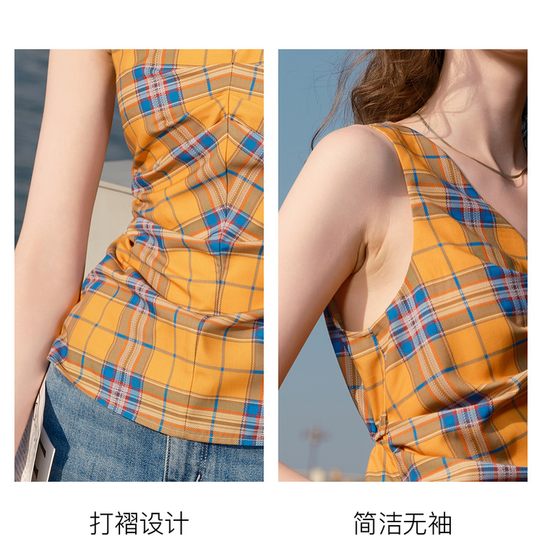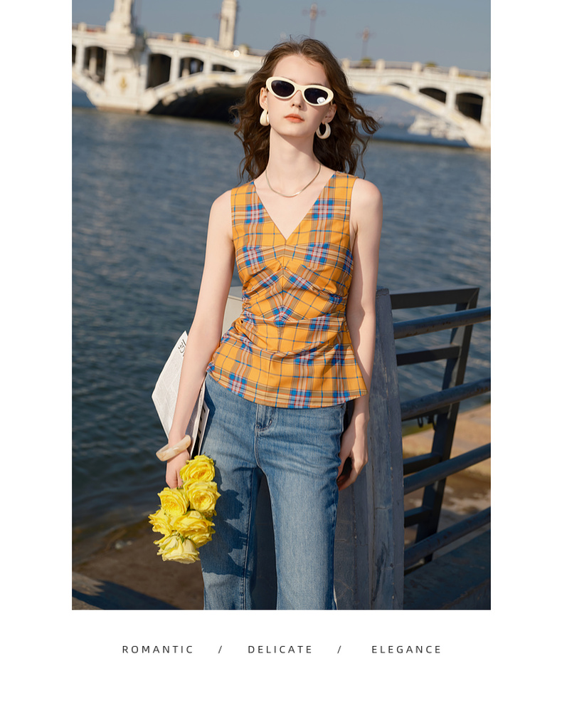 三彩独醒2025夏季新款格纹小衫打褶V领无袖上衣修身休闲F