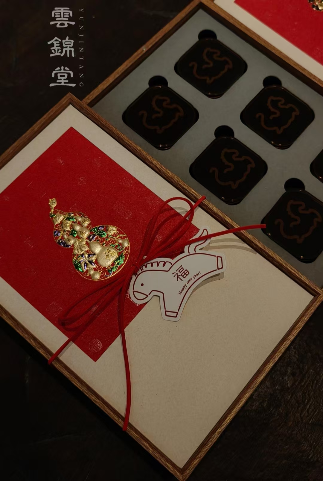 雲锦堂,值此马年之际,我们以马元素为创作灵感,融合传统文化与吉祥福禄,寓意美好。这款马年沉香礼盒采用金丝楠木制作,红色镶金边设计。