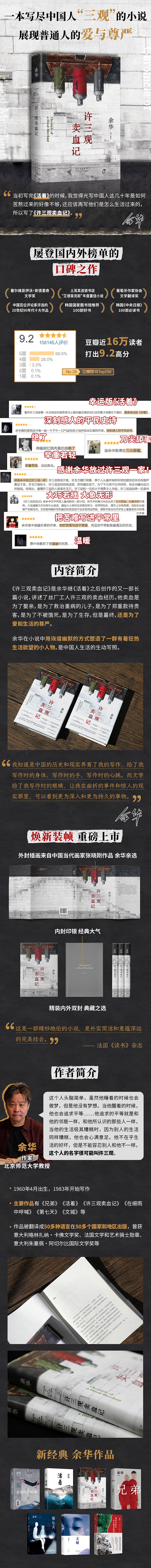 《许三观卖血记》属于我们现在所能读到的ZUI令人激动的叙述作品之一,它和我们读到的欧洲文很不同,没有倒叙、内心独白、心理描写等叙述特点……余华保留了这种对于欧洲读者来说十分陌生的文化,正是这一点使他的作品显得异乎寻常的珍贵。——《法兰克福评论报》