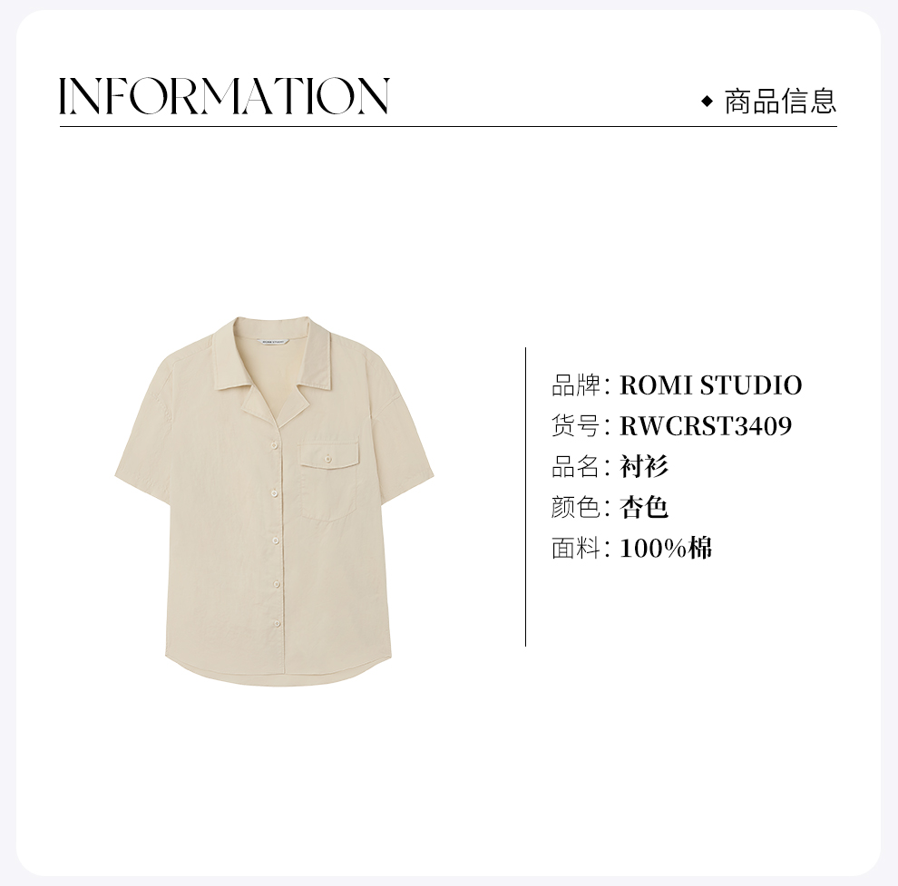 ROMI STUDIO“简约复古”轻薄干爽纯棉宽松翻领短袖衬衫 RWCRST3409【发货时间:25-30天】