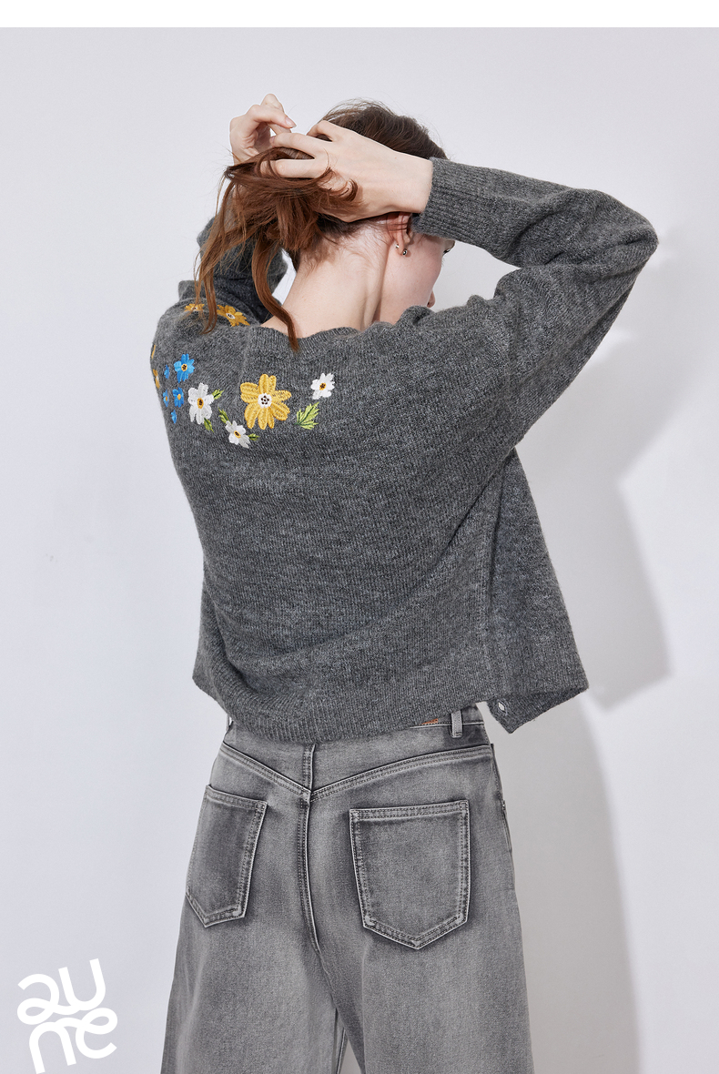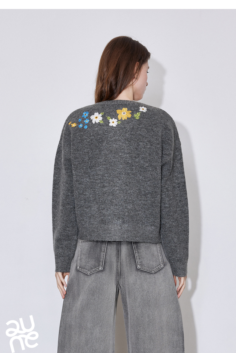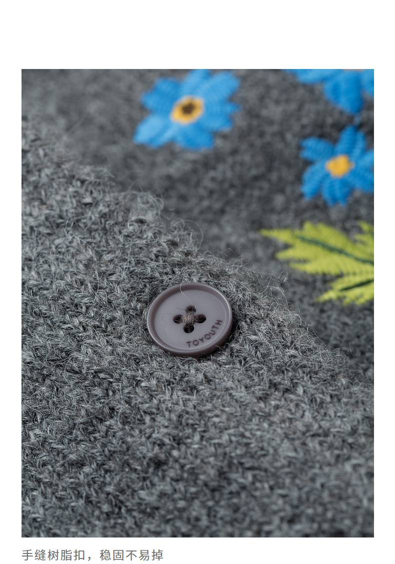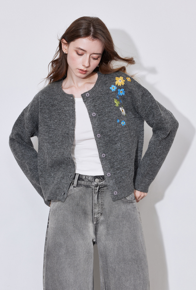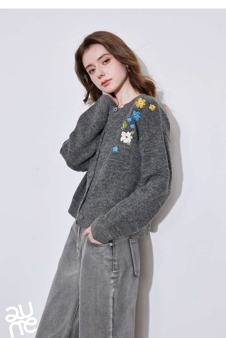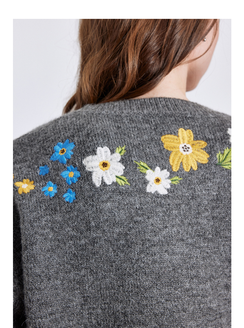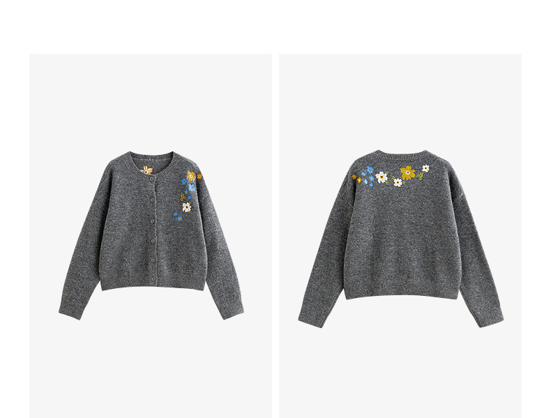 初语 花灰色毛衣开衫女 花朵绣花保暖针织衫小外套外搭
