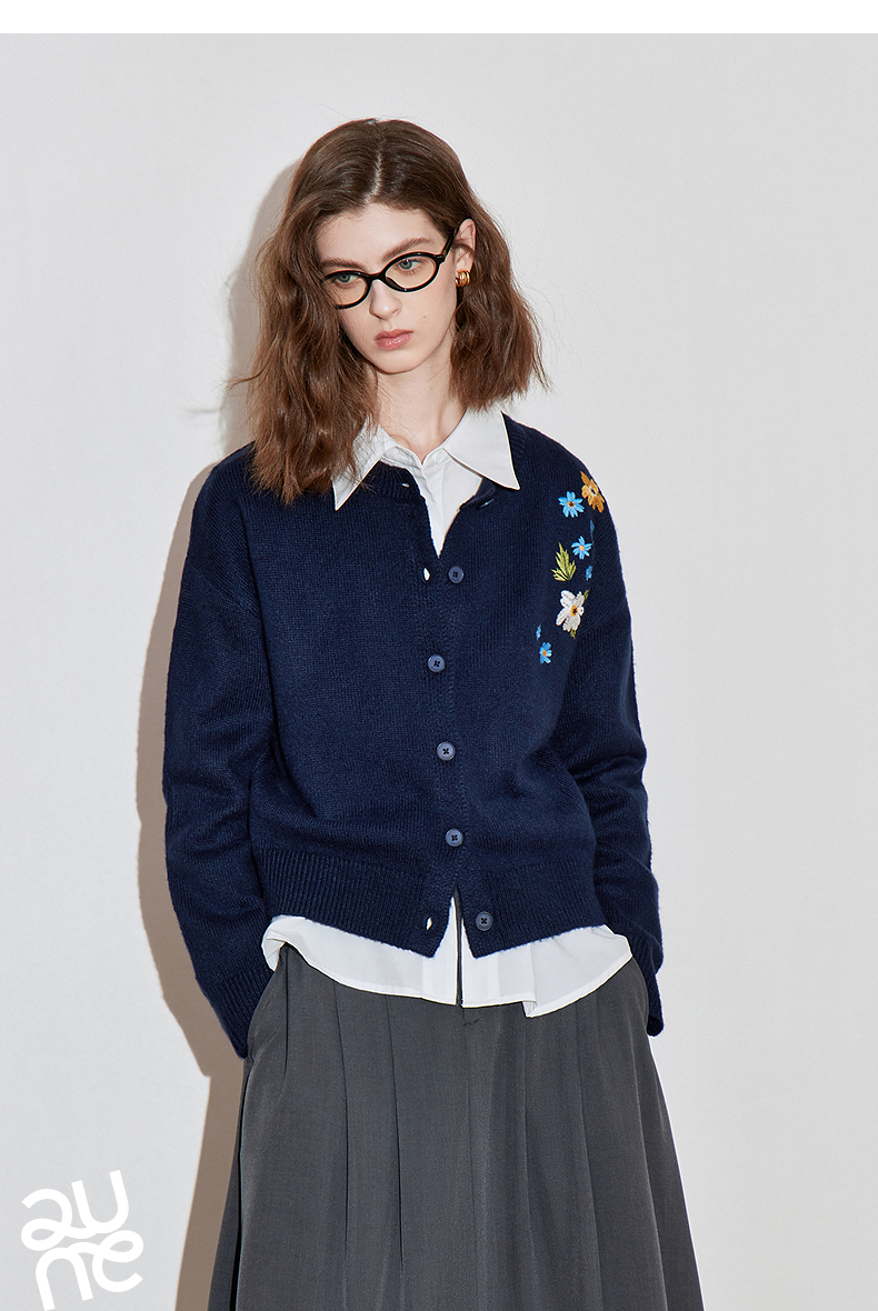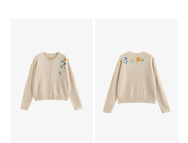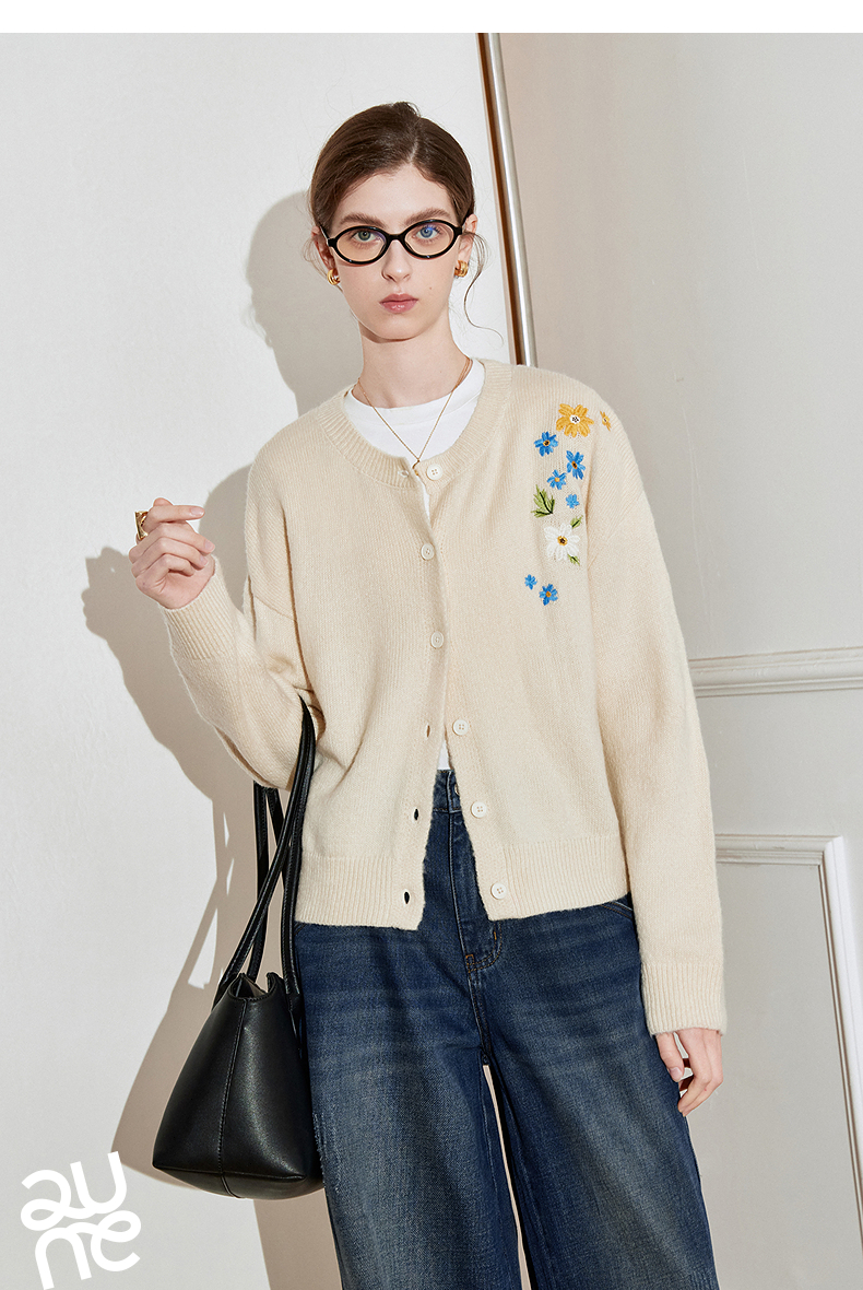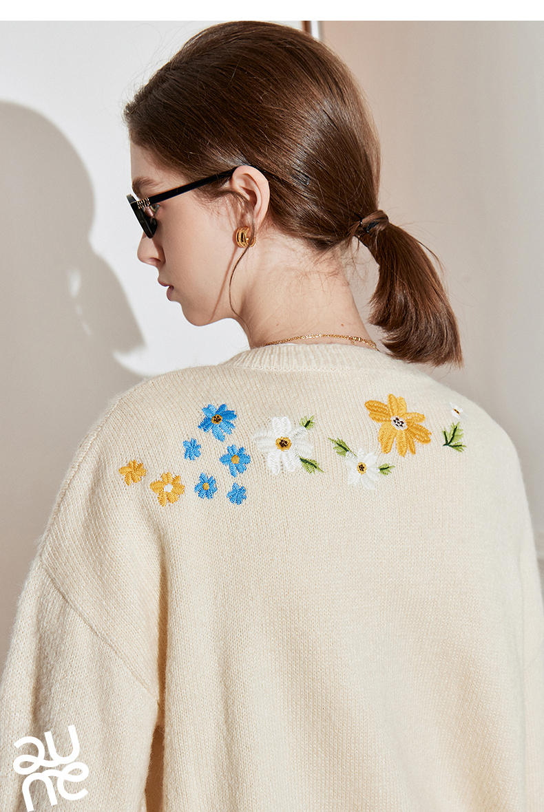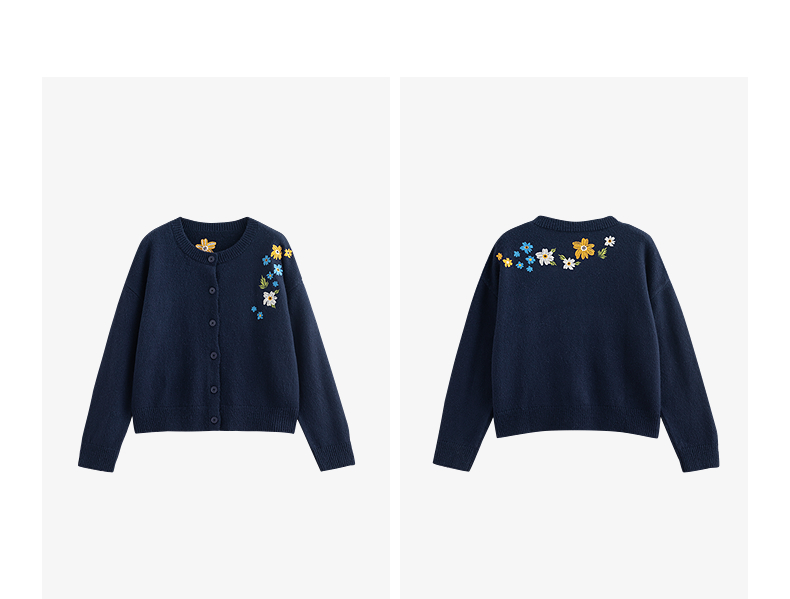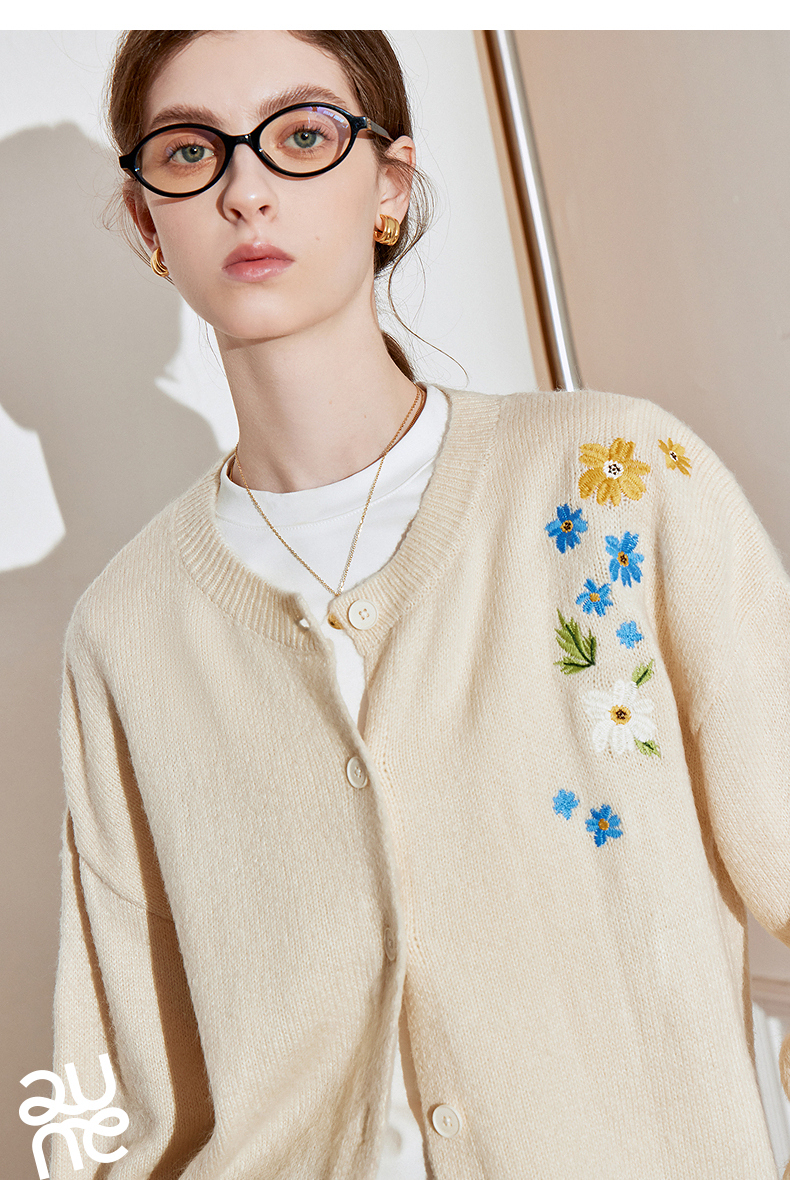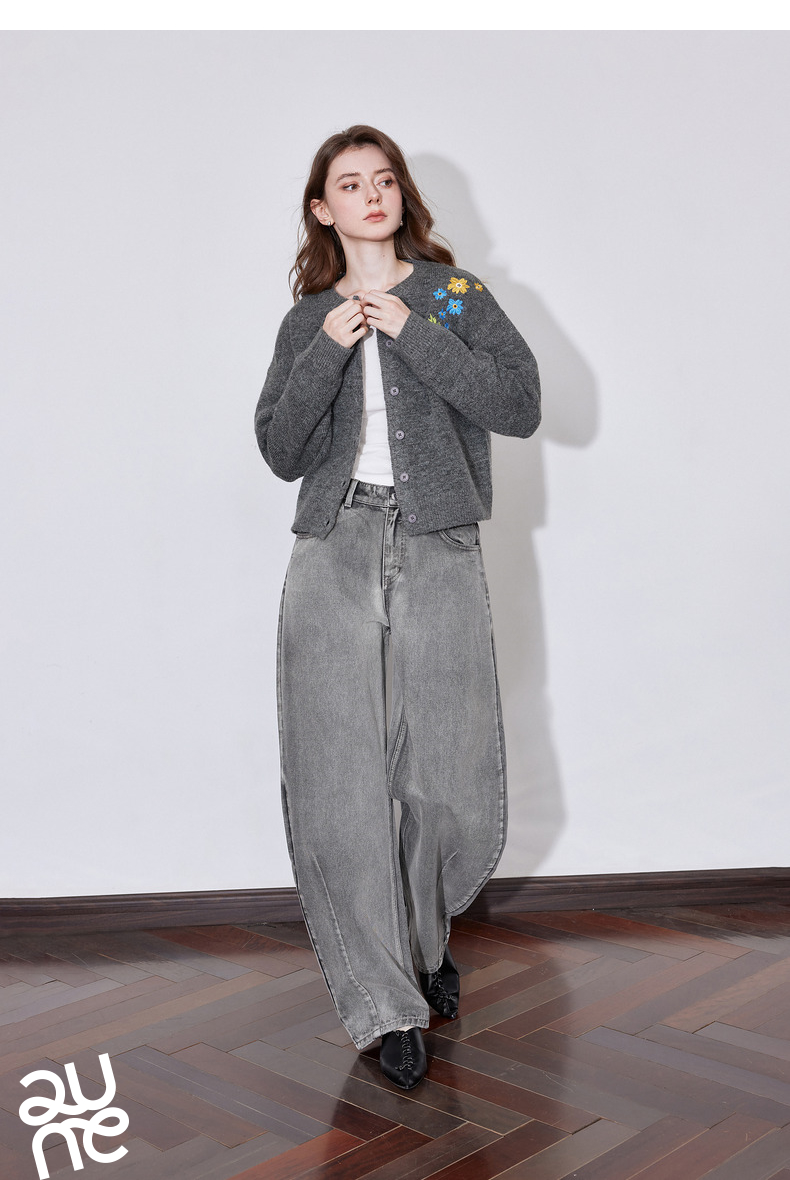 初语 花灰色毛衣开衫女 花朵绣花保暖针织衫小外套外搭
