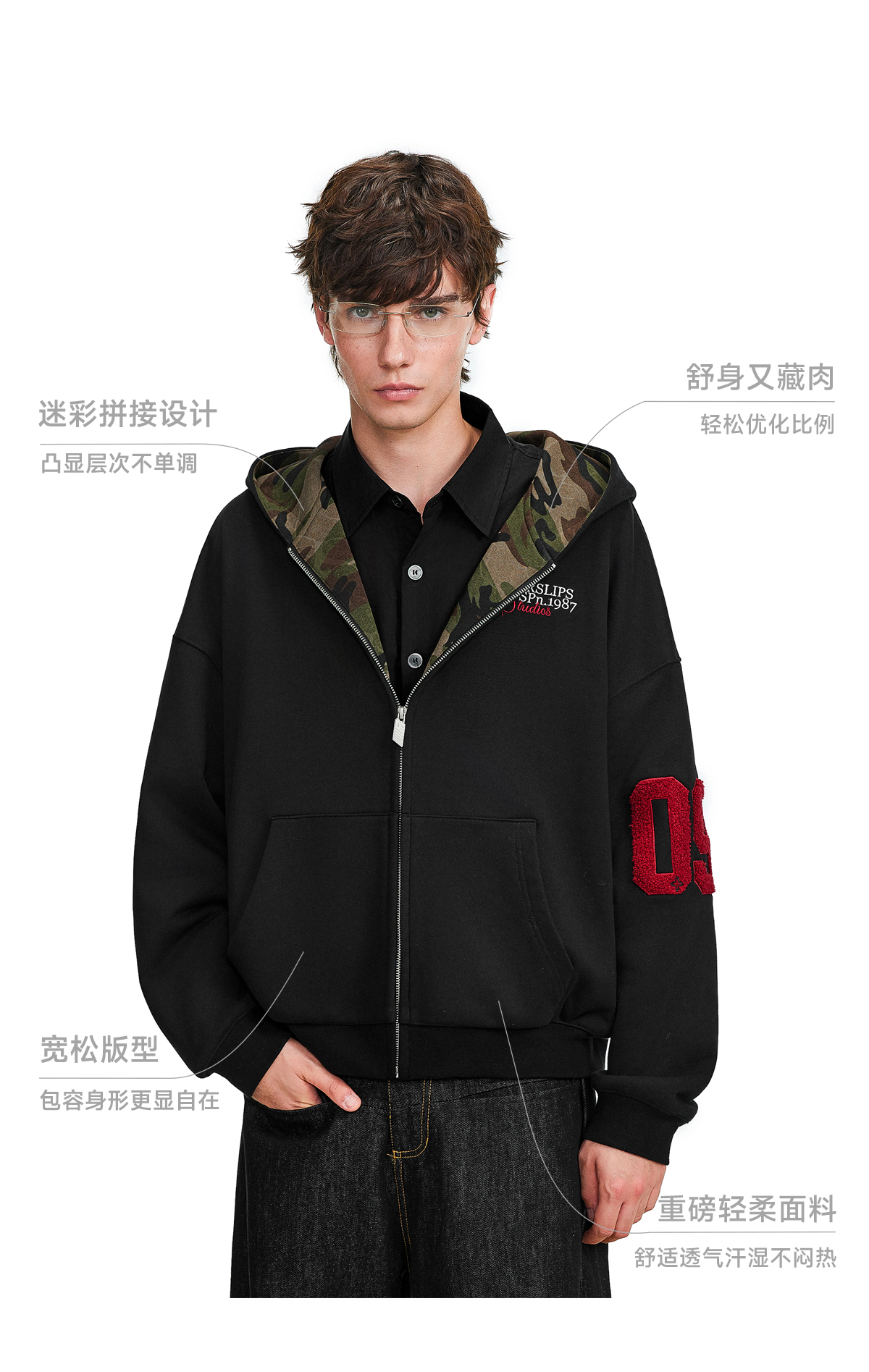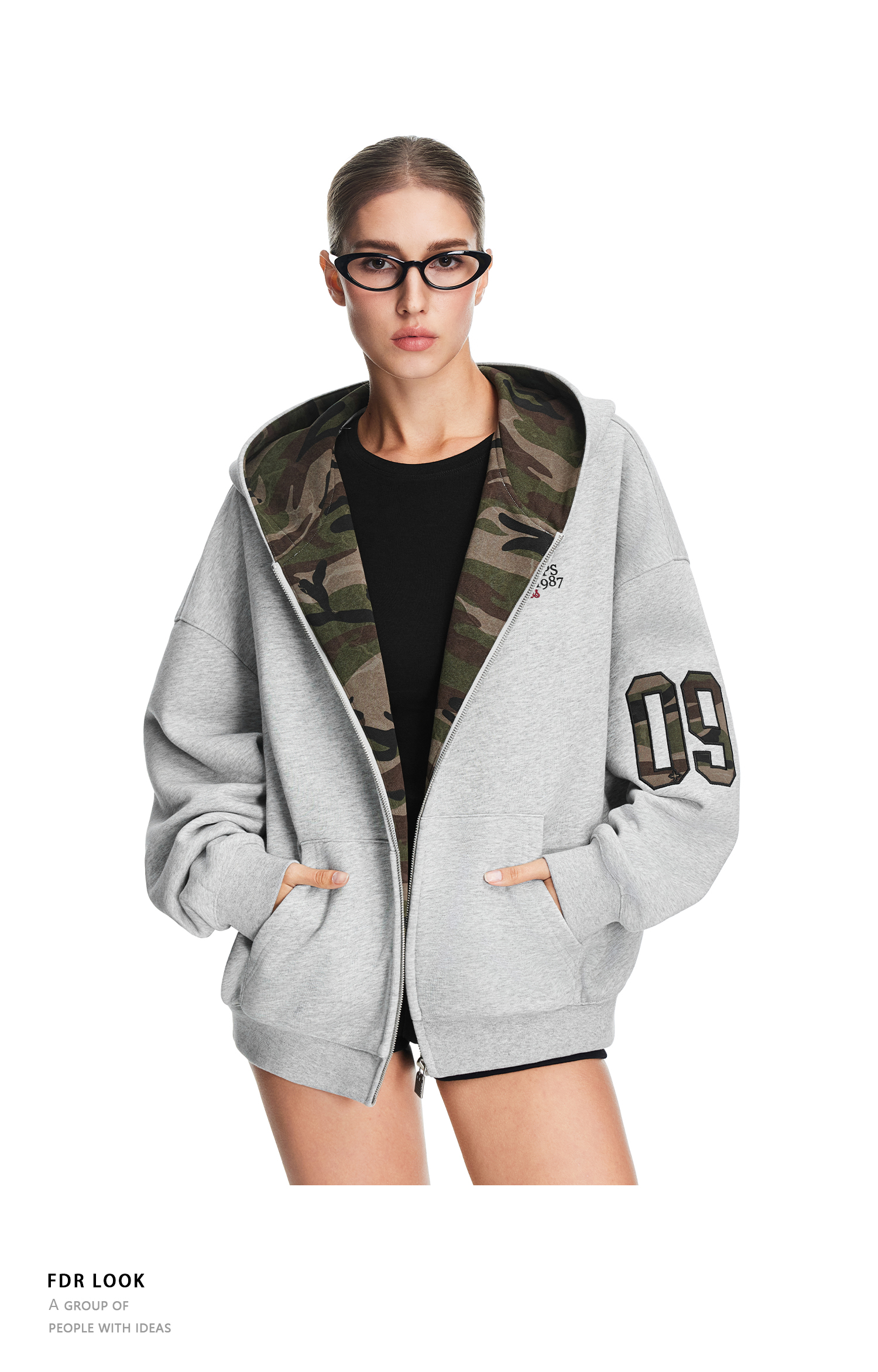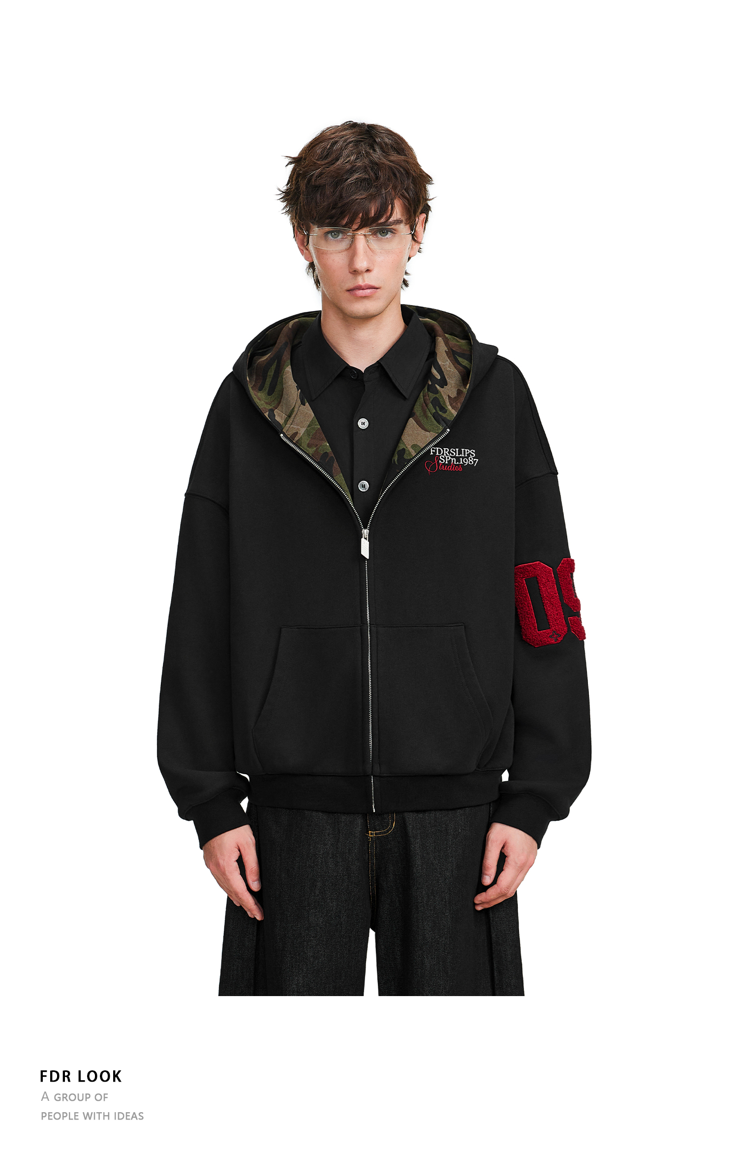 FDR官方店 拼接迷彩拉链连帽卫衣外套男女秋季宽松情侣装帽衫上衣