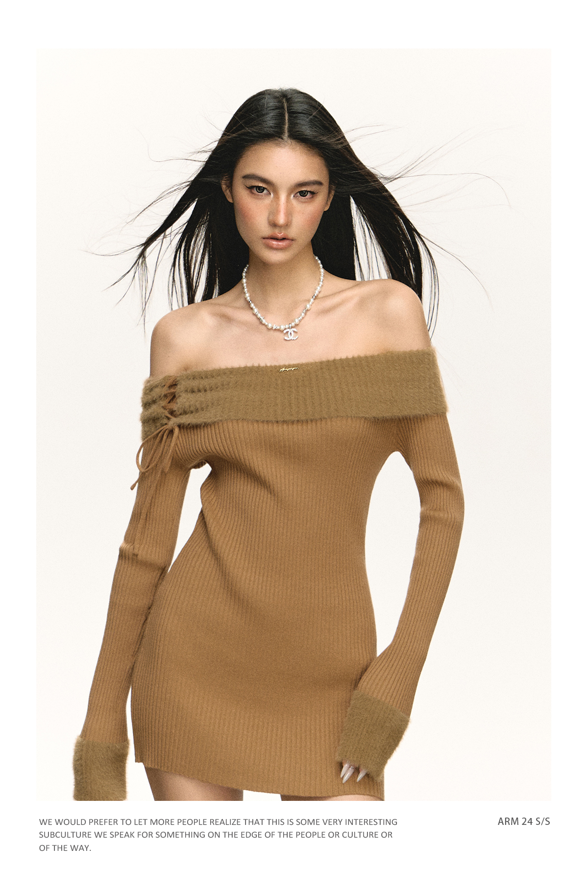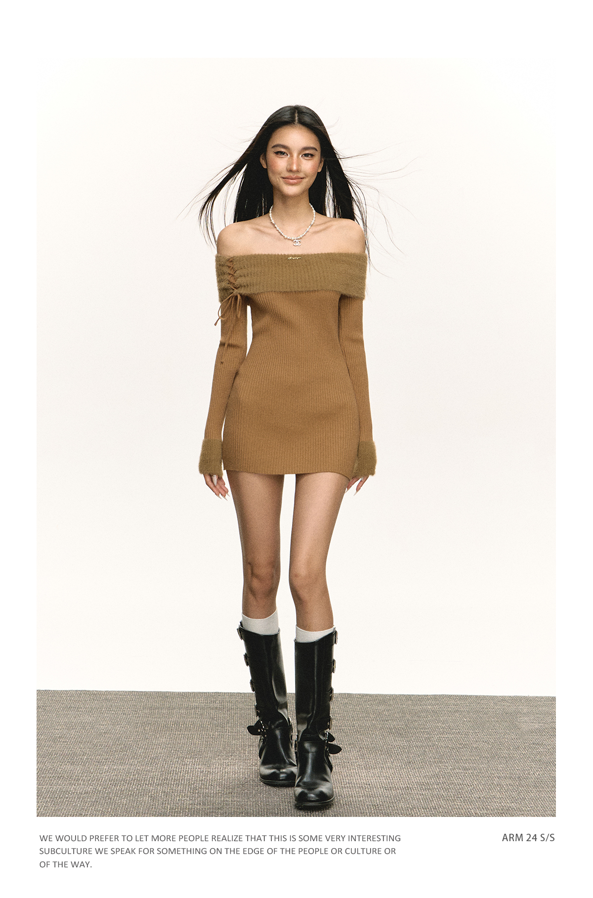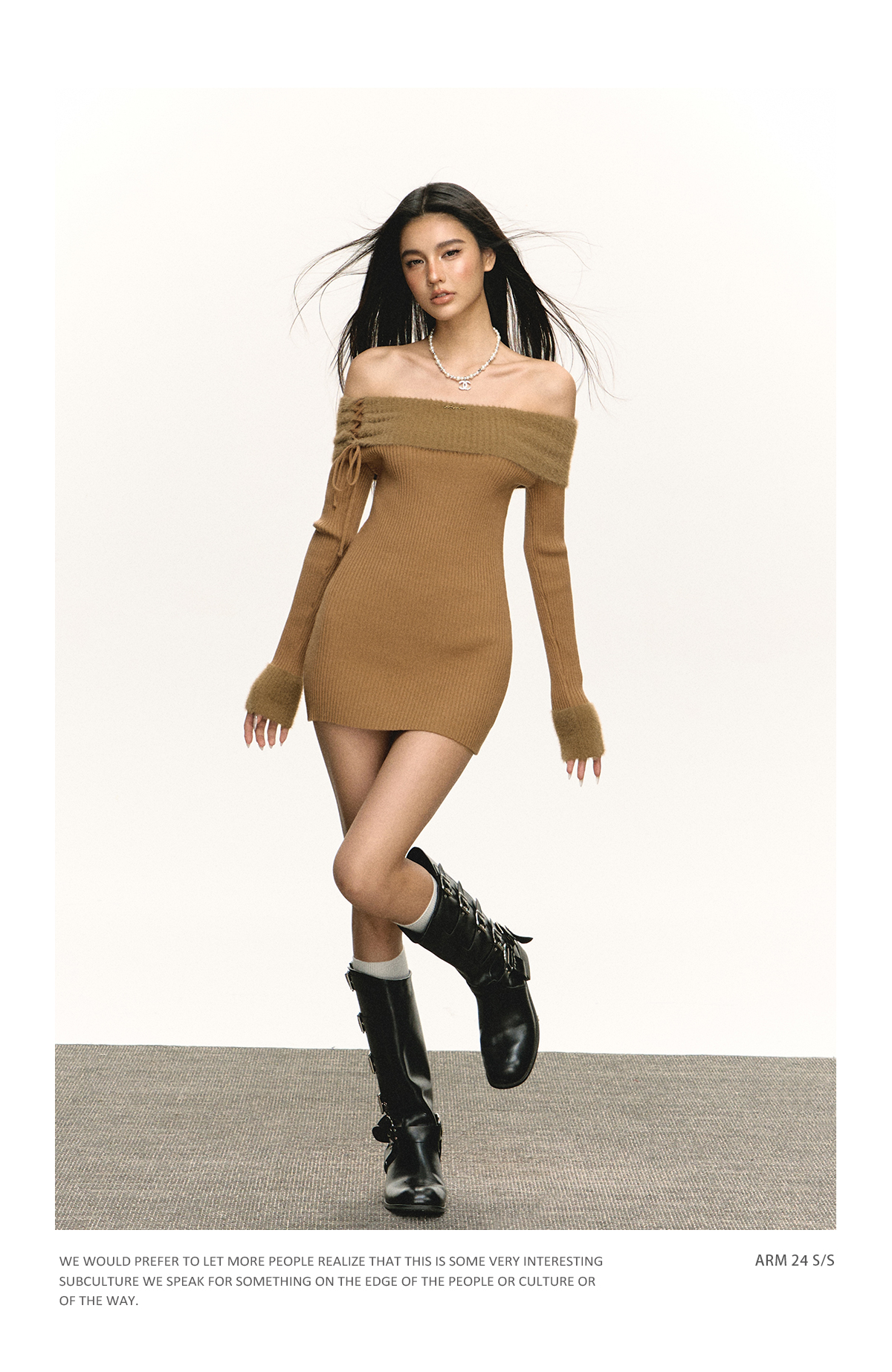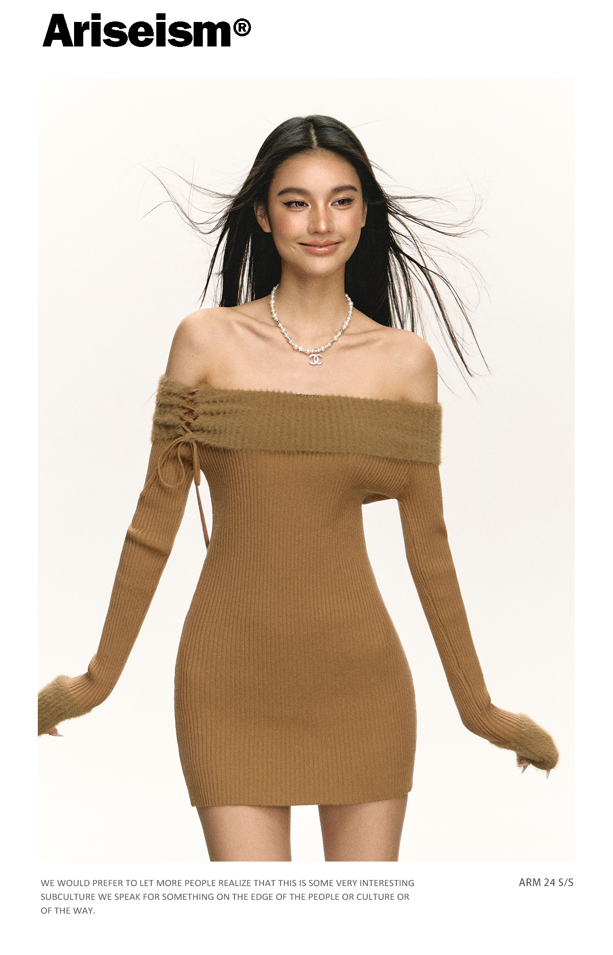 Ariseism 美式复古设计感一字肩连衣裙女春季新款长袖修身裙子