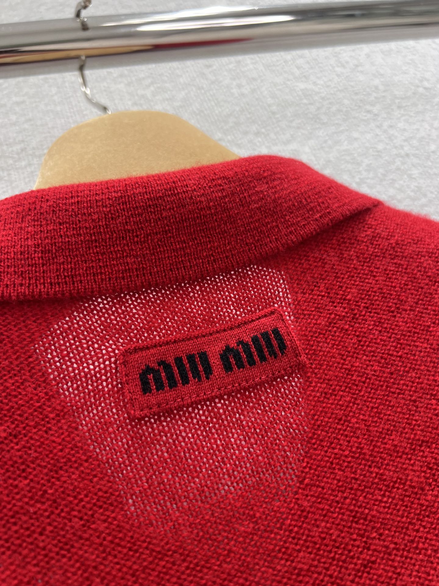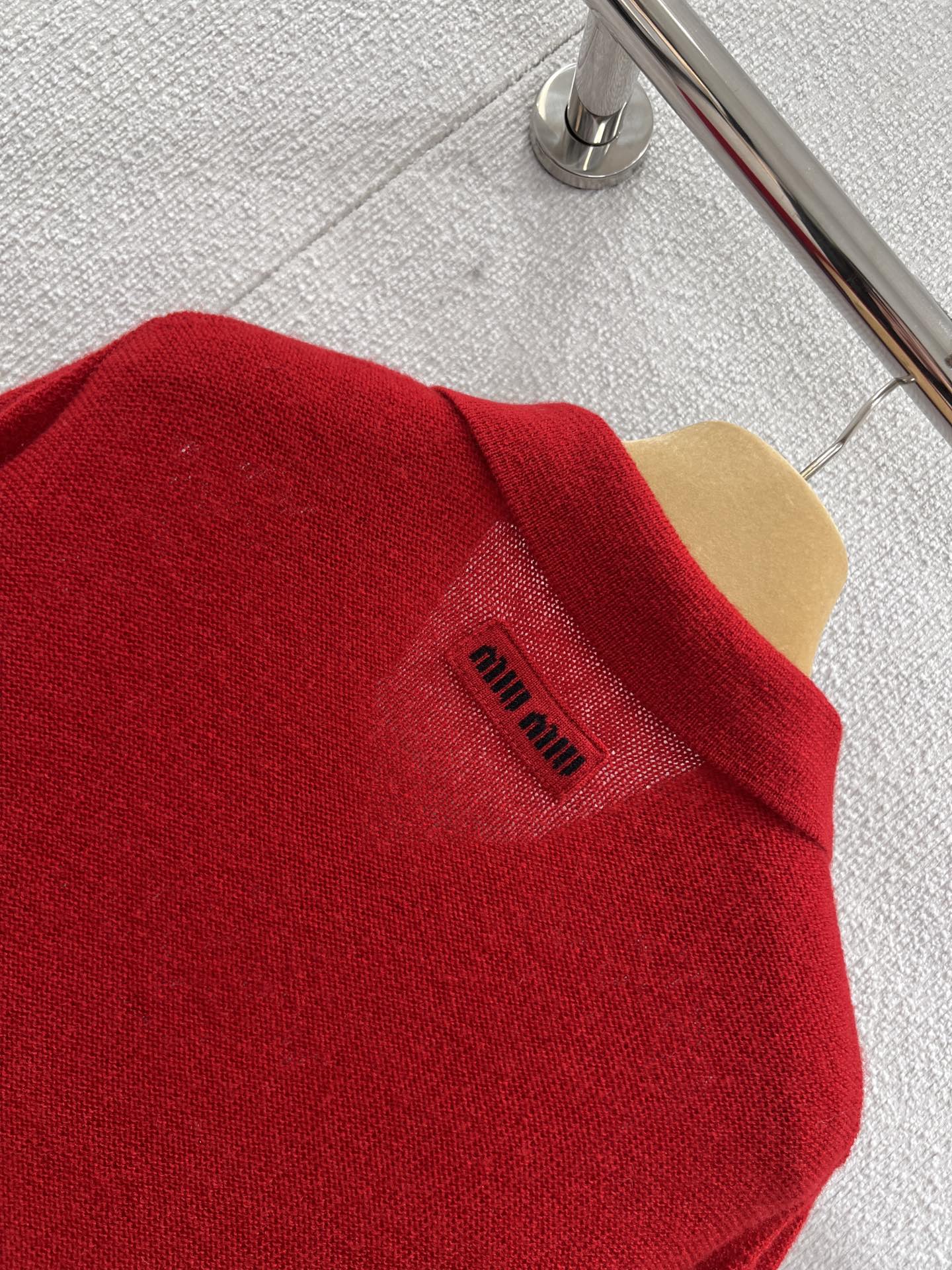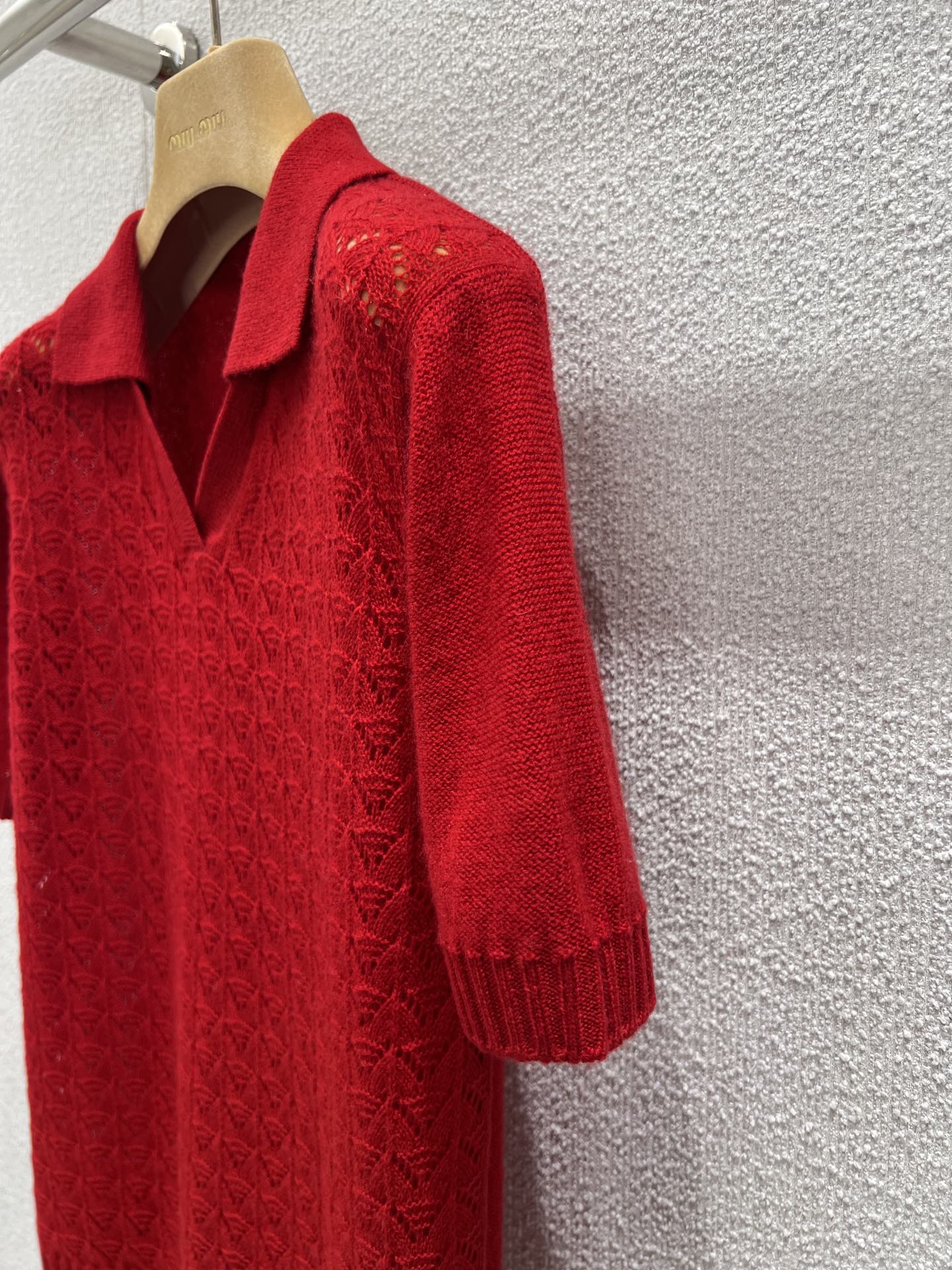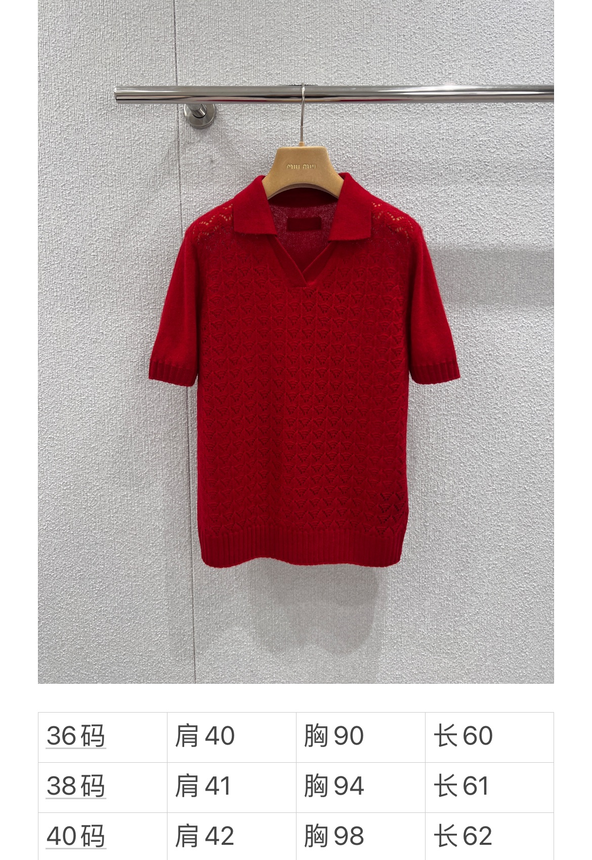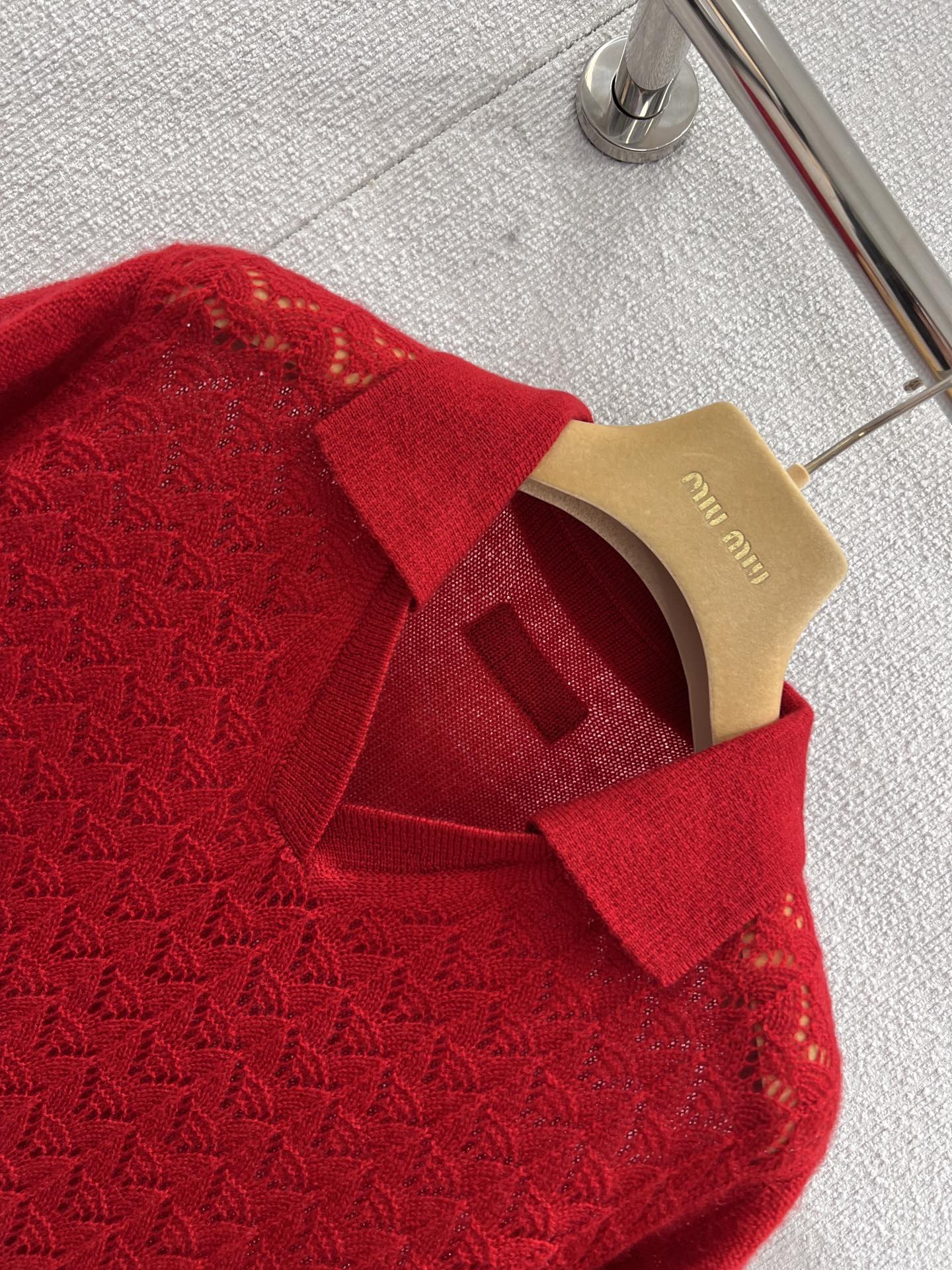 Miumi* 26Ss早春新款 红色山羊绒针织POLO衫丨⚠独家yb开发!顶级高版出品!精选珍稀山羊绒面料,经由细腻的镂空针织工艺打造,触感软糯亲肤的同时,让衣身呈现出通透的蕾丝纹理质感,轻透中透着精致的肌理层次。经典的POLO翻领设计保留了复古学院风的腔调,短袖剪裁适配早春的温度变化,宽松的衣身廓形弱化了身形束缚,营造出随性的松弛感。现货发售S/M/L