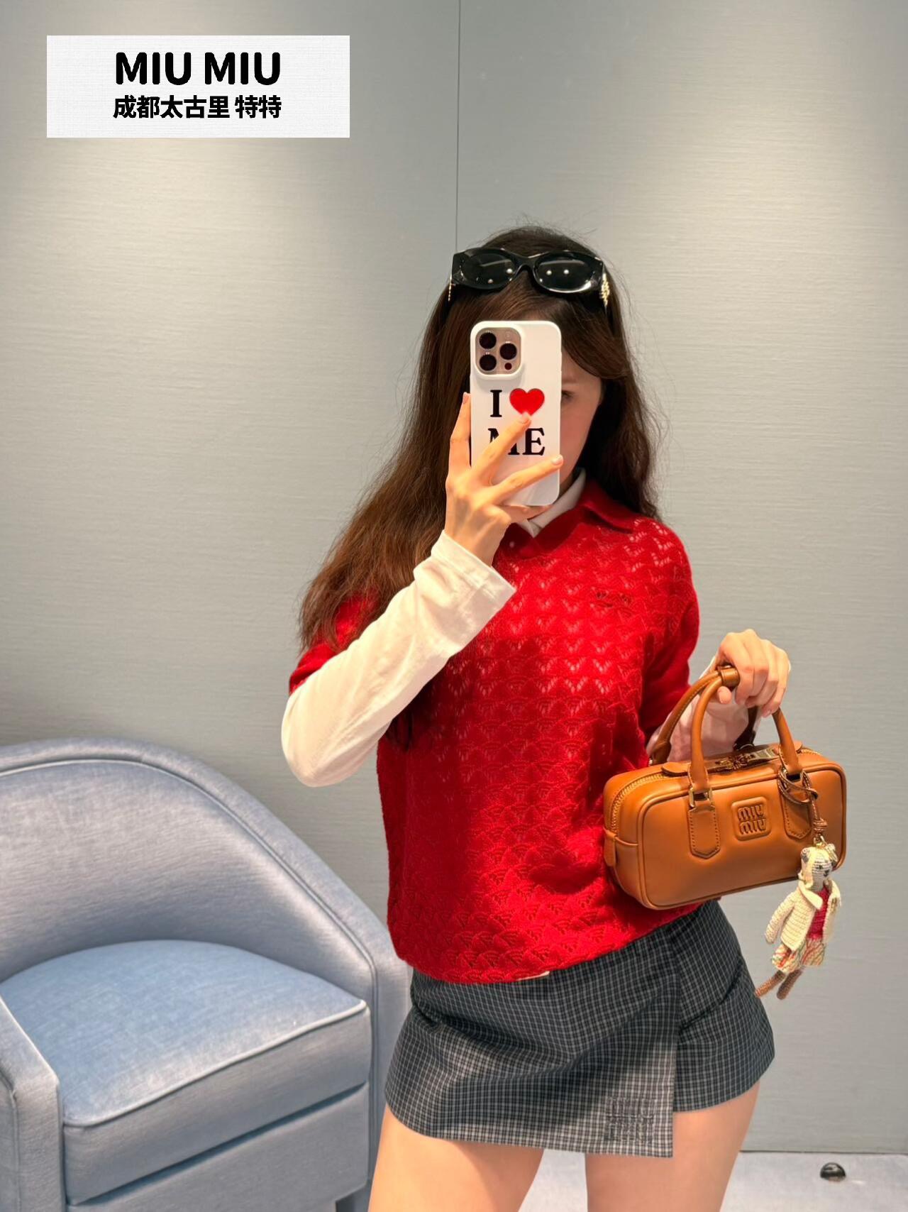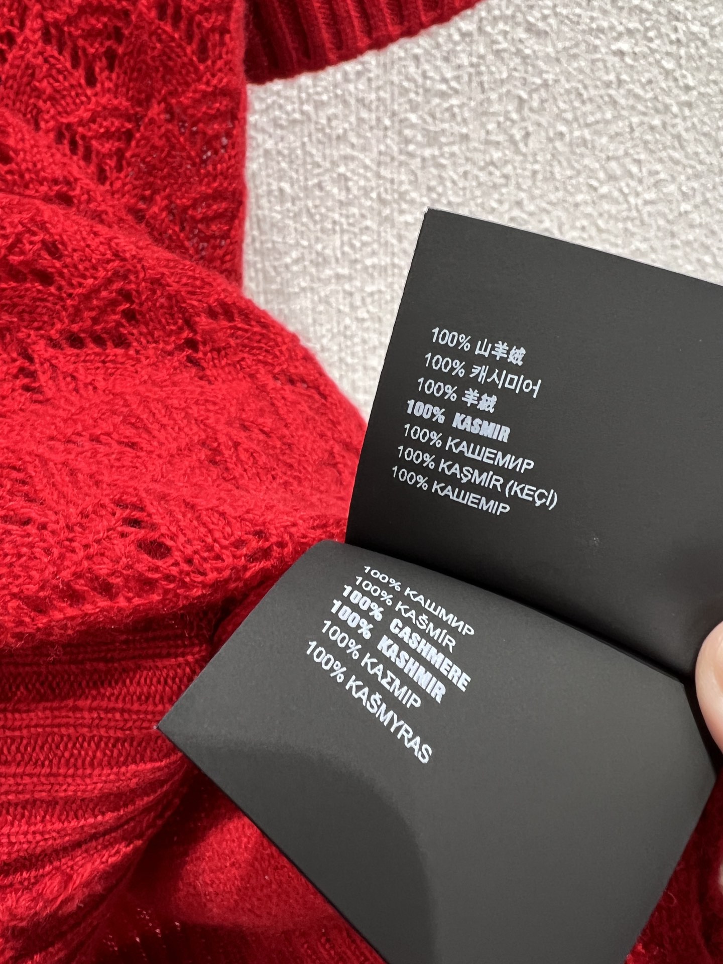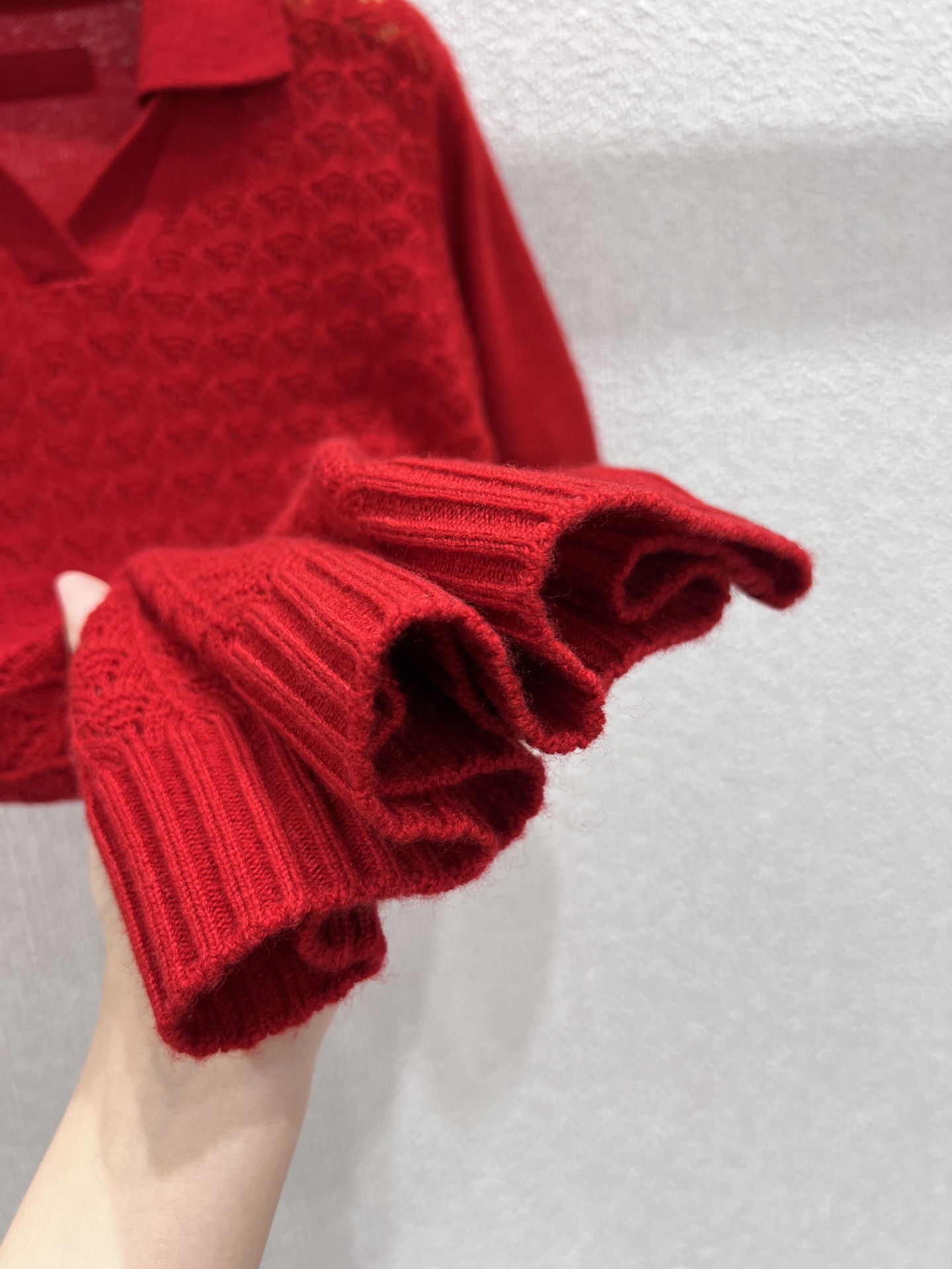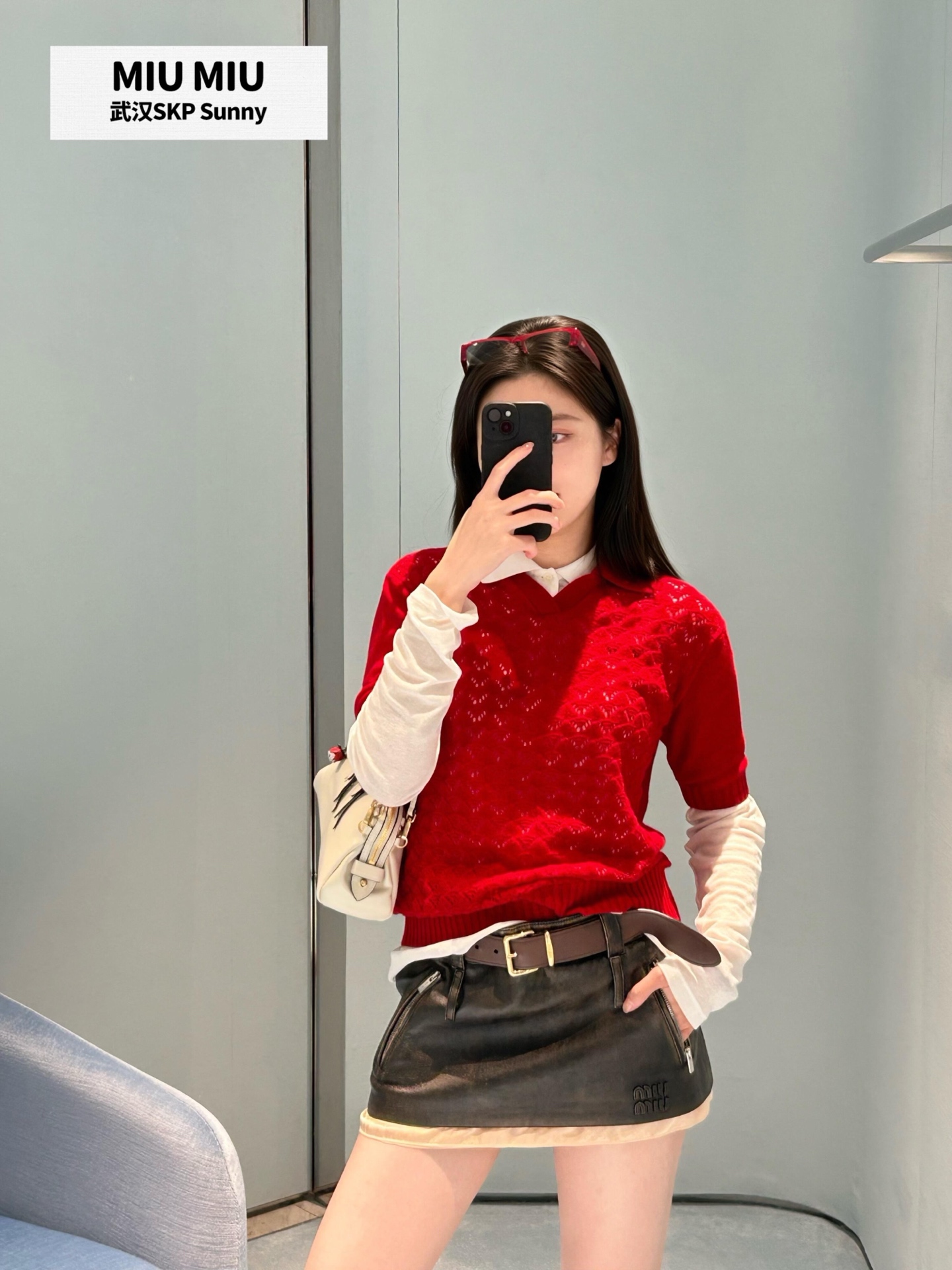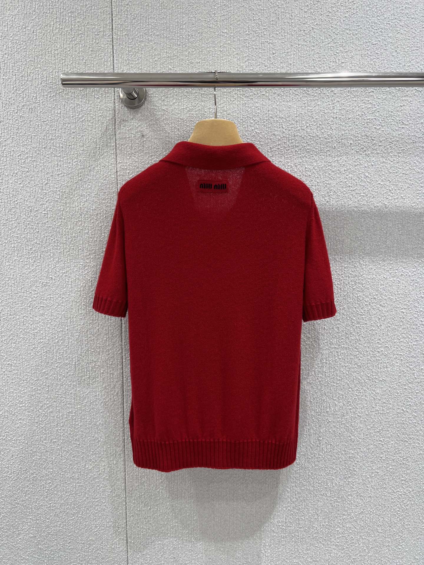 Miumi* 26Ss早春新款 红色山羊绒针织POLO衫丨⚠独家yb开发!顶级高版出品!精选珍稀山羊绒面料,经由细腻的镂空针织工艺打造,触感软糯亲肤的同时,让衣身呈现出通透的蕾丝纹理质感,轻透中透着精致的肌理层次。经典的POLO翻领设计保留了复古学院风的腔调,短袖剪裁适配早春的温度变化,宽松的衣身廓形弱化了身形束缚,营造出随性的松弛感。现货发售S/M/L