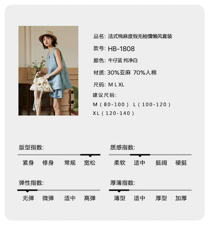 品名:法式棉麻度假无袖慵懒风套装 材质:30亚麻+70人棉 发货地:湖北 发货时间:下单后一般2-5天内发货(周末、节假日除外) 发货快递:中通快递(以实际发货为准,暂不支持指定快递) 运费政策:该商品全国部分地区包邮(新疆、西藏,港澳台不发货,请知悉) 售后政策:本品包装配件完整、未拆封、不影响二次销售支持7天无理由退换货(无运费险),拦截拒收无理由退换需扣寄出运费3元,请知悉 温馨提醒:因显示器像素差异与拍摄灯光原因,图片与实物颜色可能存在些许差异,具体请以收到实物为准。 |