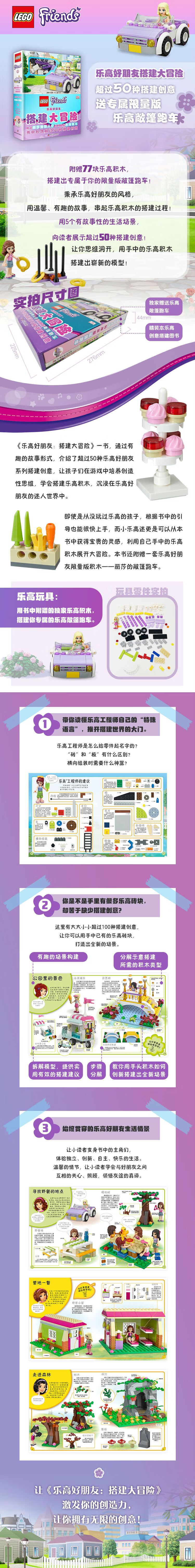 适读人群 :6+ 乐高玩具风靡世界60年,广受全球大朋友、小朋友的喜爱。不过,新手入门的乐高玩家,可能会在搭建的时候感觉力不从心。这时候,只要有乐高搭建师一点点的专业指导,你的创意就会像泉水般源源不断地涌现出来。 《乐高好朋友:搭建大冒险》这本书,正是专业乐高搭建师为普通玩家准备的一份入门礼物——有趣的乐高好朋友故事,配上超过50种搭建创意,以及非常实用的小贴士,可以激发你的灵感,启发你的想象,让你面对手中的乐高积木,不再无从下手。