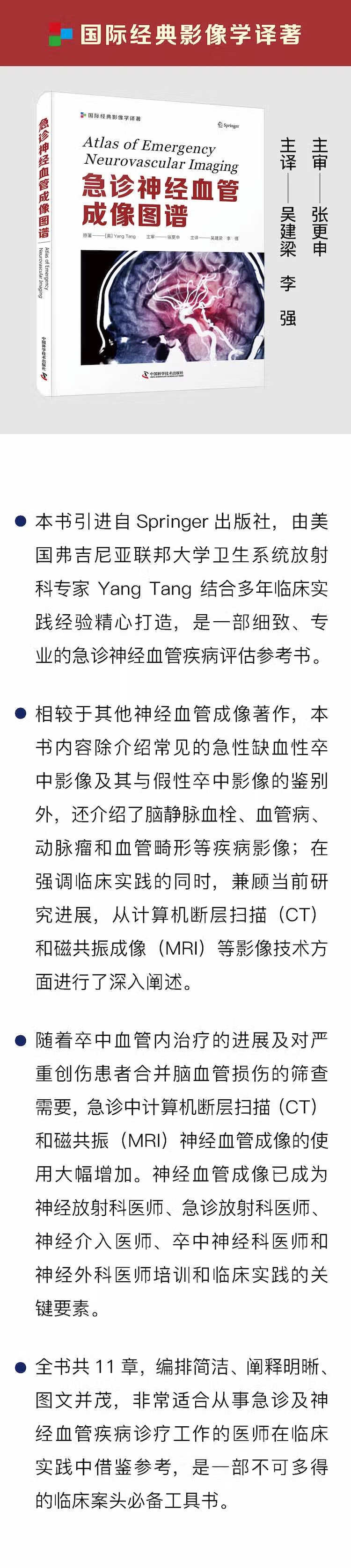 本书引进自 Springer 出版社,由美国弗吉尼亚联邦大学卫生系统放射科专家 Yang Tang 结合多年临床实践经验精心打造,是一部细致、专业的急诊神经血管疾病评估参考书。相较于其他神经血管成像著作,本书内容除介绍常见的急性缺血性卒中影像及其与假性卒中影像的鉴别外,还介绍了脑静脉血栓、血管病、动脉瘤和血管畸形等疾病影像;在强调临床实践的同时,兼顾Z新研究进展,从计算机断层扫描(CT)和磁共振成像(MRI)等影像技术方面进行了深入阐述。全书共 11 章,编排简洁、阐释明晰、图文并茂,非常适合急诊及神经血管疾病诊疗工作的同道在临床实践中借鉴参考,是一部不可多得的临床案头必备工具书。