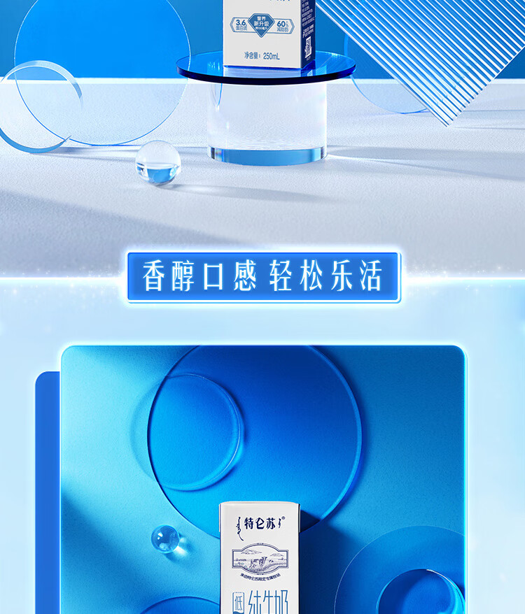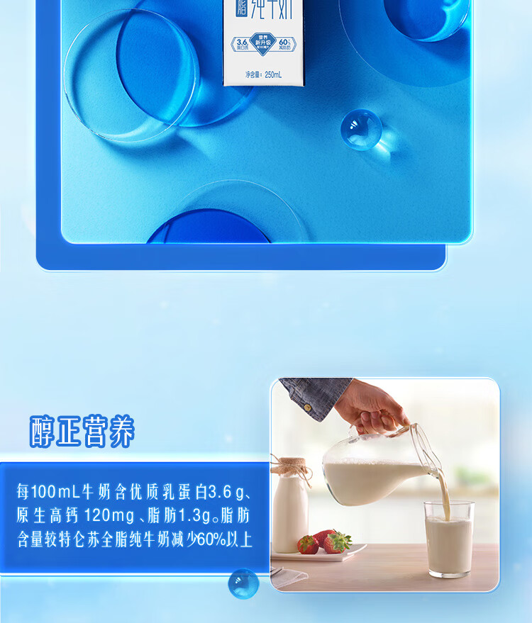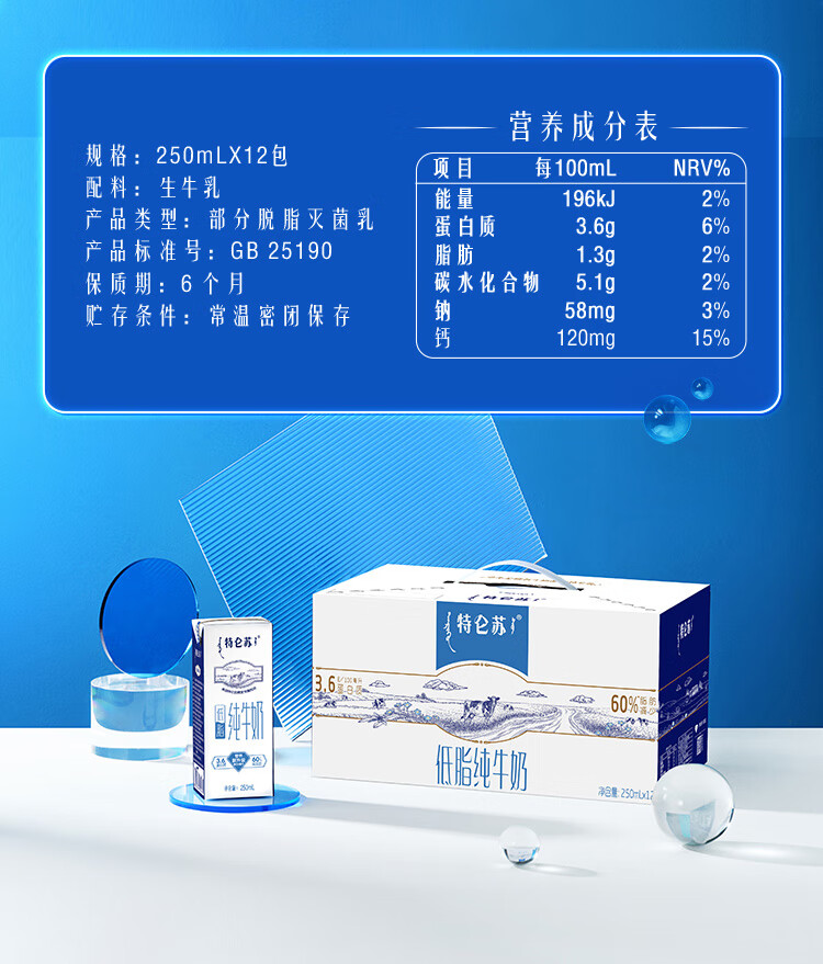 特仑苏低脂纯牛奶部分脱脂灭菌乳利乐苗条装250ml×12包