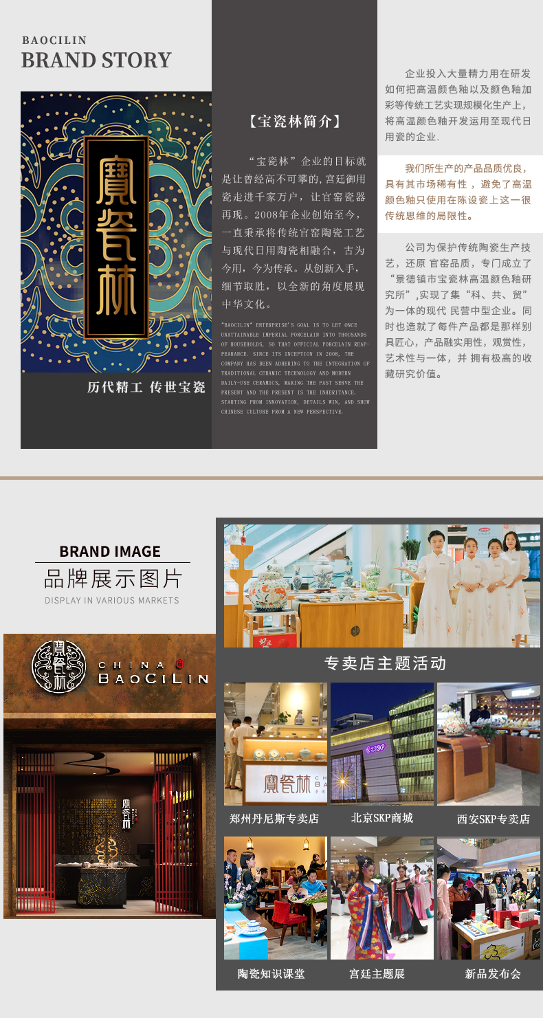 宝瓷林,2008年创立,是一家将传统清宫官窑制瓷技艺,移植于当代家居日用瓷品上的景德镇陶瓷骨干企业,是当下唯一一家代表“千年瓷都-景德镇”走向全球的陶瓷连锁品牌,被誉为陶瓷界的“国酒茅台”。