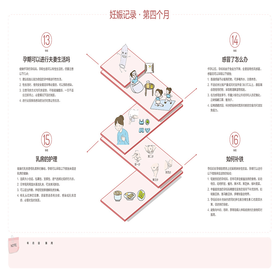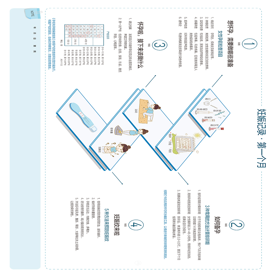 《科学孕育:我的怀孕月历》以孕期的月份为周期,以挂历的形式组织内容,为孕妈妈提供一个清晰、实用的孕期指南。在内容上,每页提供了每个孕周需重点关注的孕育知识或禁忌,配以轻松有趣的图片,用心引导孕妈妈了解和感受自己的身体变化,从而辅助孕妈妈;闯关,缓解孕妈妈的压力,抚慰孕妈妈的心情。同时每页最下方还提供了note板块,方便孕妈妈准爸爸记录更多关于宝宝的有趣动态,贴心而温馨。十月怀胎,在此过程中孕妈妈虽幸福却也辛苦,怀孕月历挂于墙体,不仅可时时提醒全家人多加关注孕妈妈,还可作为孕妈妈记录孕期变化的载体,具有深刻意义和较强的实用价值。