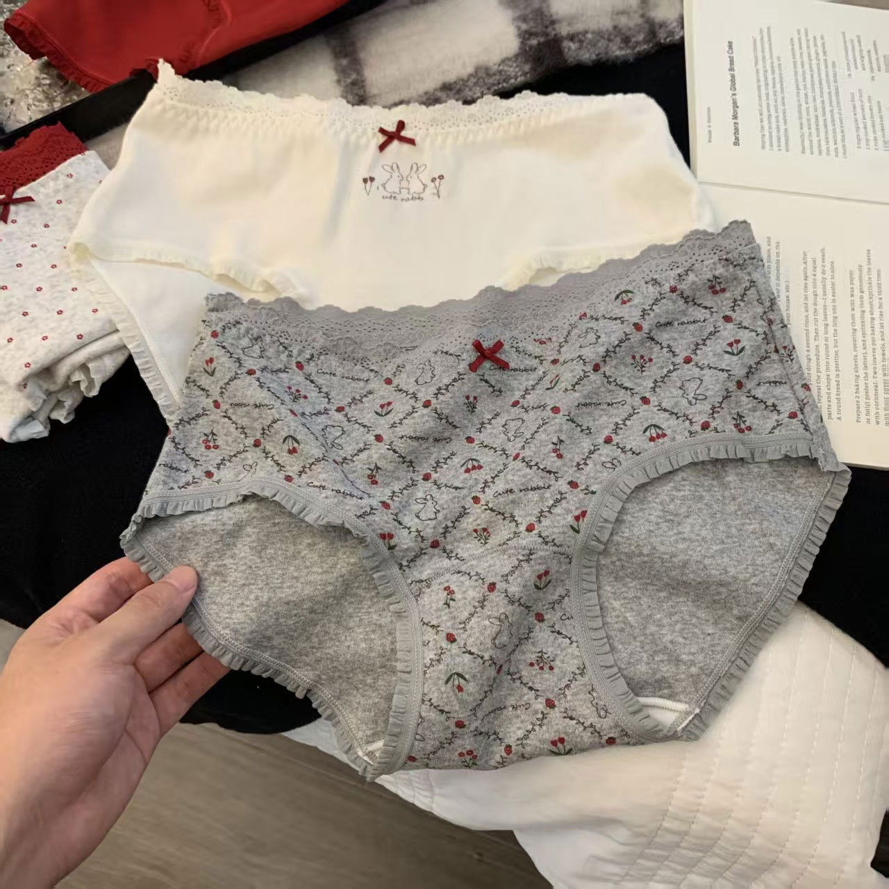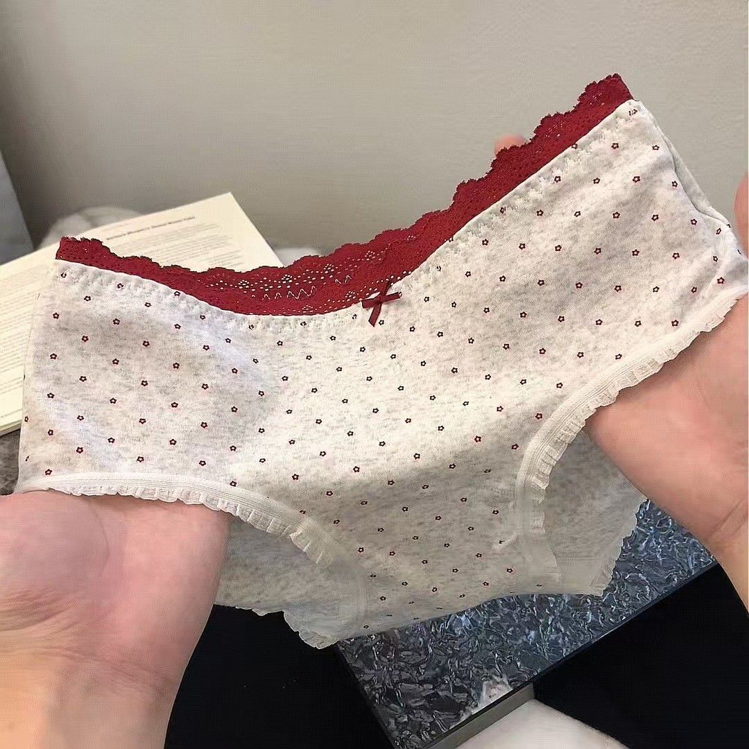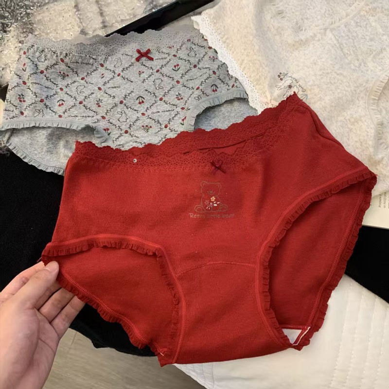 【云感贴身❗️韩系甜美内裤】磨毛质感,手感软糯亲肤棉,腰头拼接蕾丝,加长档吸湿透气,10A透气加长底裆可爱印花中腰包臀全棉内裤QQ