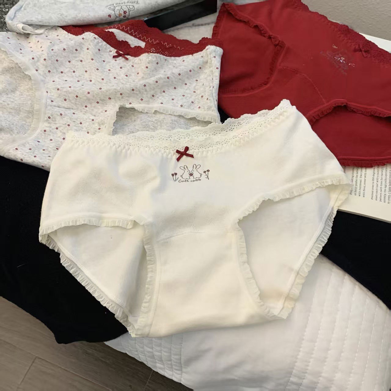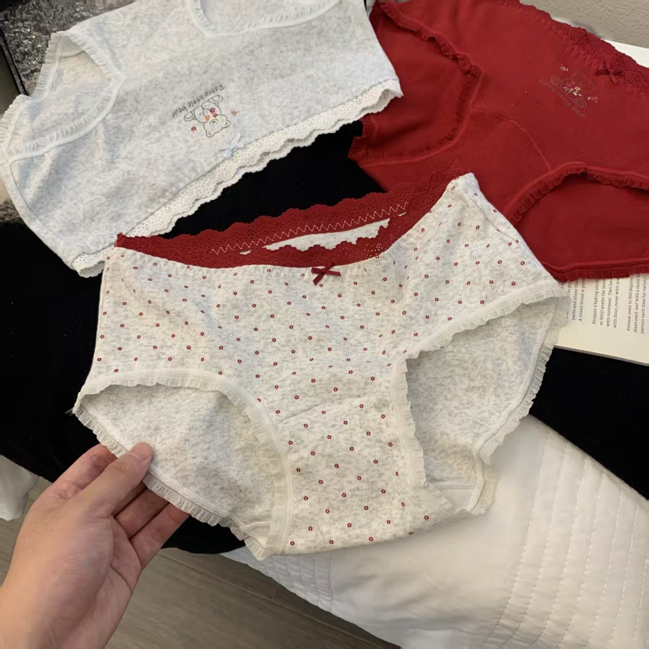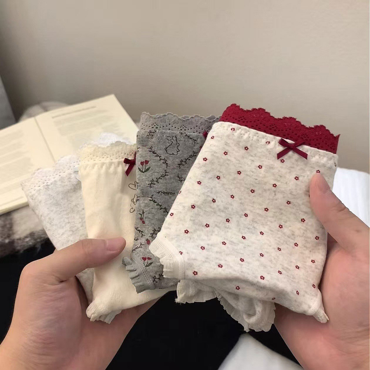【云感贴身❗️韩系甜美内裤】磨毛质感,手感软糯亲肤棉,腰头拼接蕾丝,加长档吸湿透气,10A透气加长底裆可爱印花中腰包臀全棉内裤QQ