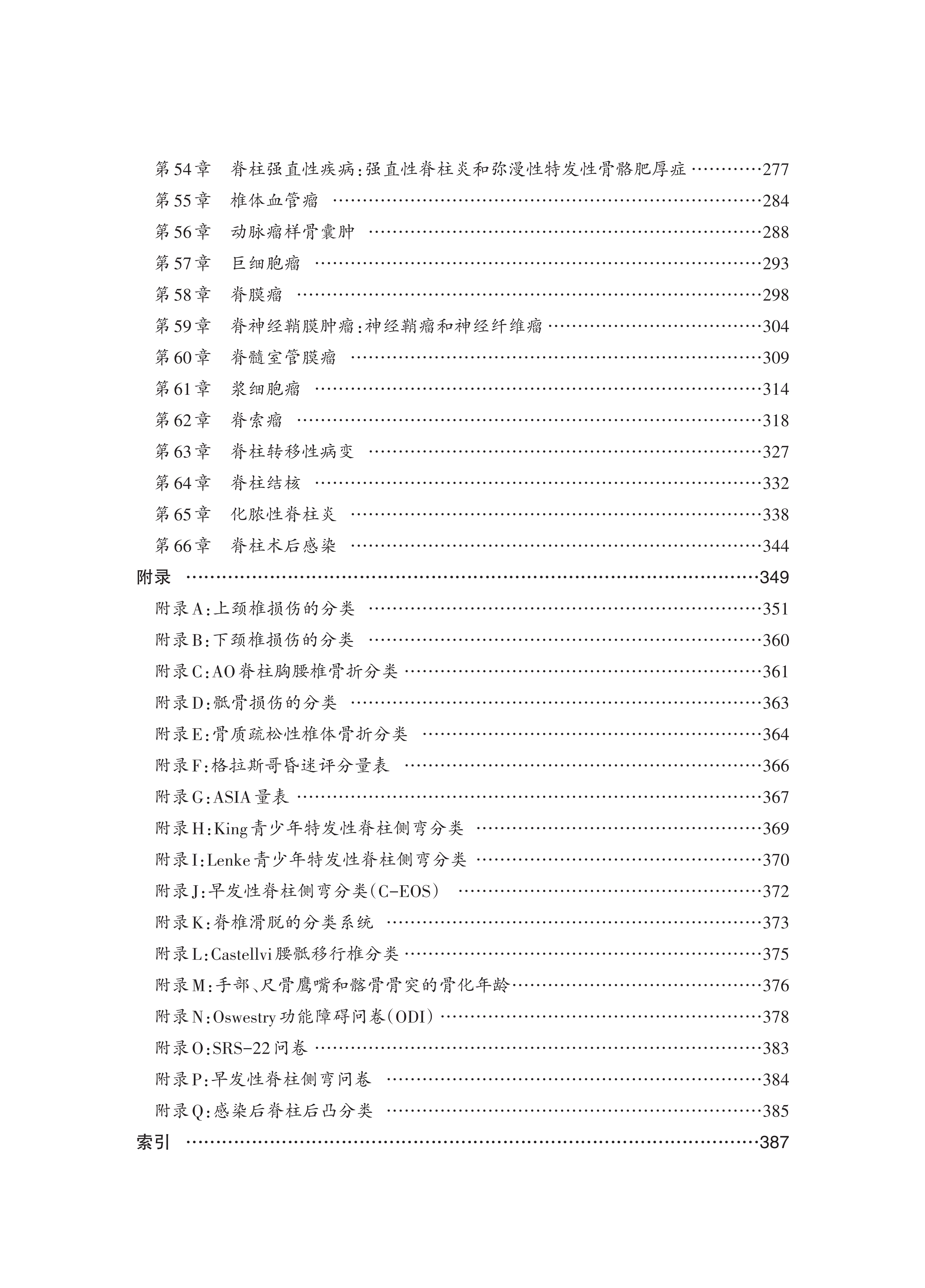 附录部分提供了不同脊柱损伤和疾病的分类标准,以及与临床实践相关的量表和问卷,能够为读者的临床工作带来帮助。
