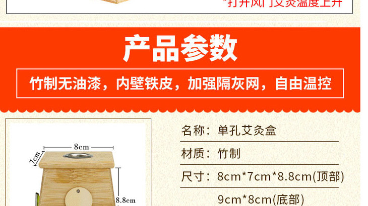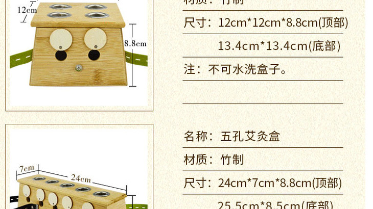 单孔竹制艾灸盒适用于:百会穴、大椎穴 、足三里...等单个穴位的艾灸;或者非常相近的2个穴位,比如“肚脐、气海穴、关元穴”之间的施灸。