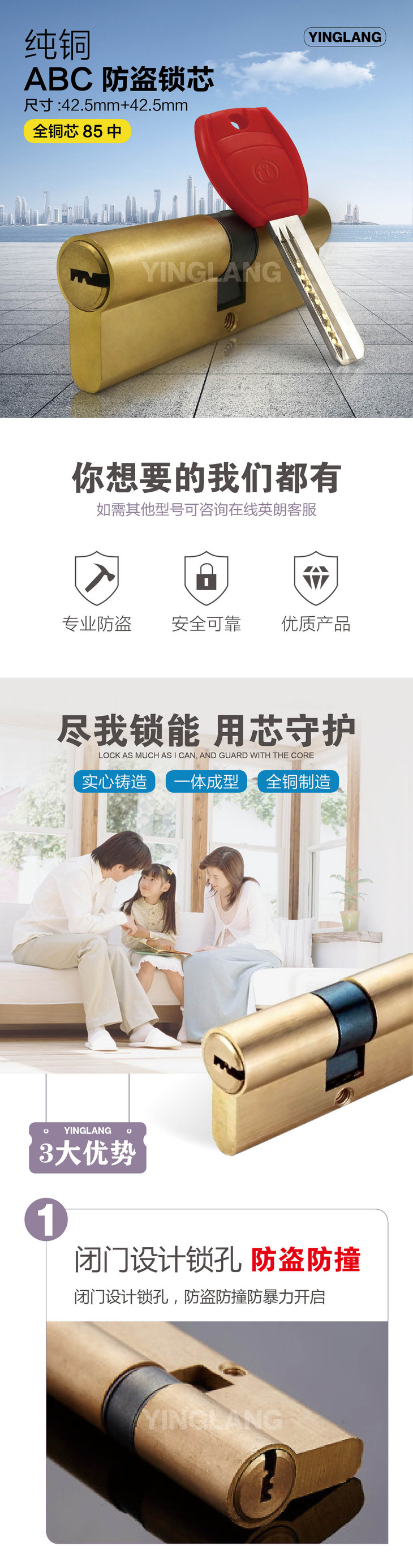 〖B415〗大柄ABC铜锁芯(85中)