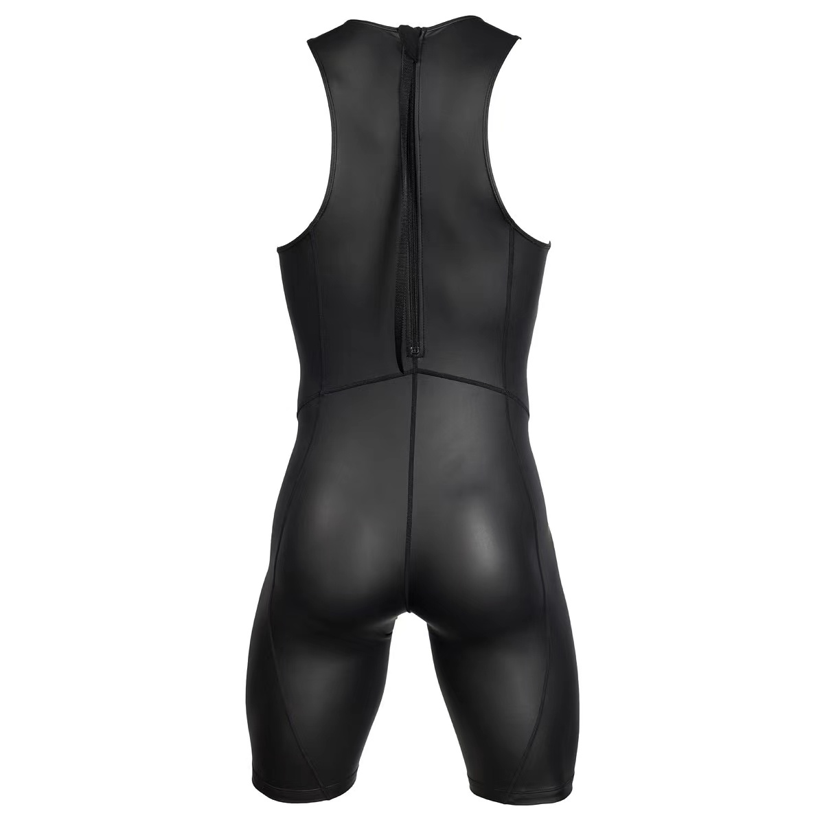1.全件衣服外边采用PU SKIN材料,保留了传统胶衣的外部特征。类似于竞速泳衣内的”鲨鱼皮“,非常有效地减少水阻。