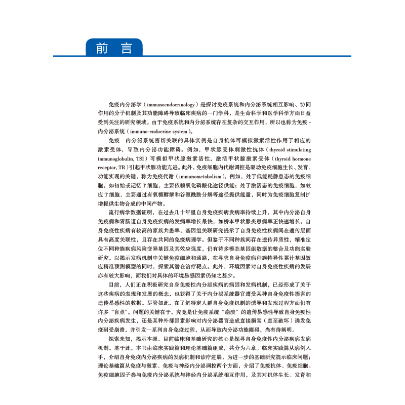 本书由临床实践篇和理论基础篇组成,共分为六章。临床实践篇从病例入手,介绍自身免疫内分泌疾病的发病机制和诊疗进展,为进一步的基础研究提示临床问题;理论基础篇从免疫与激素、免疫与神经内分泌调控两个方面,介绍了免疫抗体、免疫细胞、 免疫细胞因子参与免疫内分泌系统与神经内分泌系统相互作用,及其对机体生长、发育和功能调控的影响。