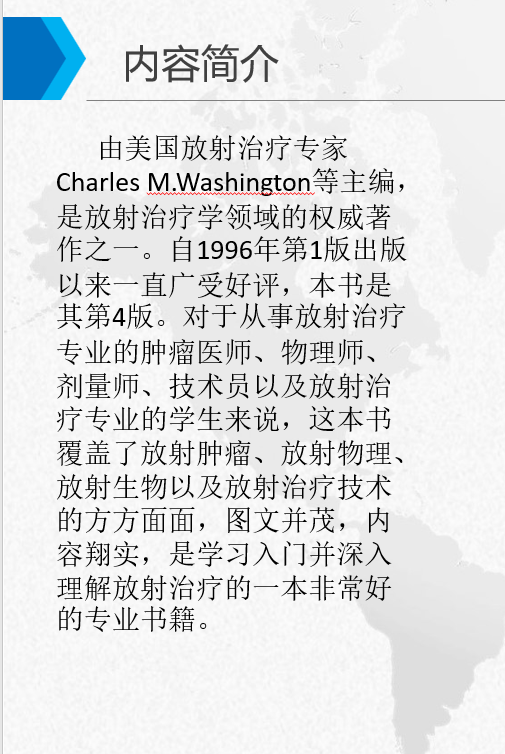 由美国放射治疗专家Charles M.Washington等主编,是放射治疗学领域的权威著作之一。自1996年第1版出版以来一直广受好评,本书是其第4版。对于从事放射治疗专业的肿瘤医师、物理师、剂量师、技术员以及放射治疗专业的学生来说,这本书覆盖了放射肿瘤、放射物理、放射生物以及放射治疗技术的方方面面,图文并茂,内容翔实,是学习入门并深入理解放射治疗的一本非常好的专业书籍。