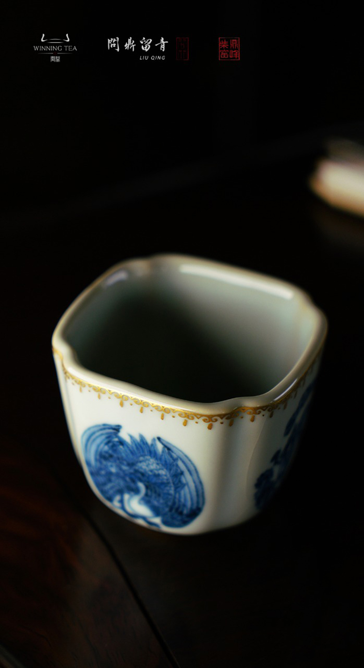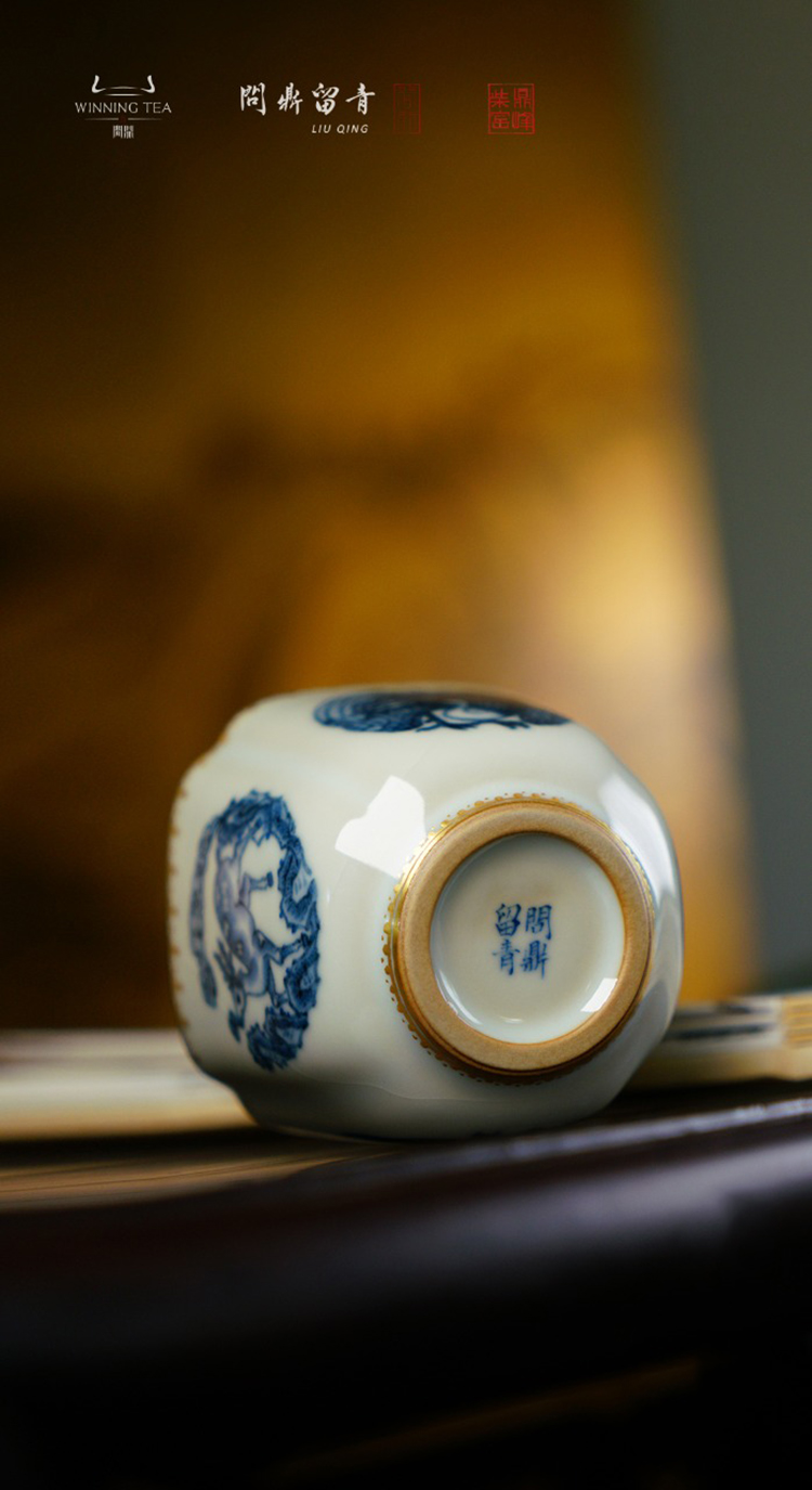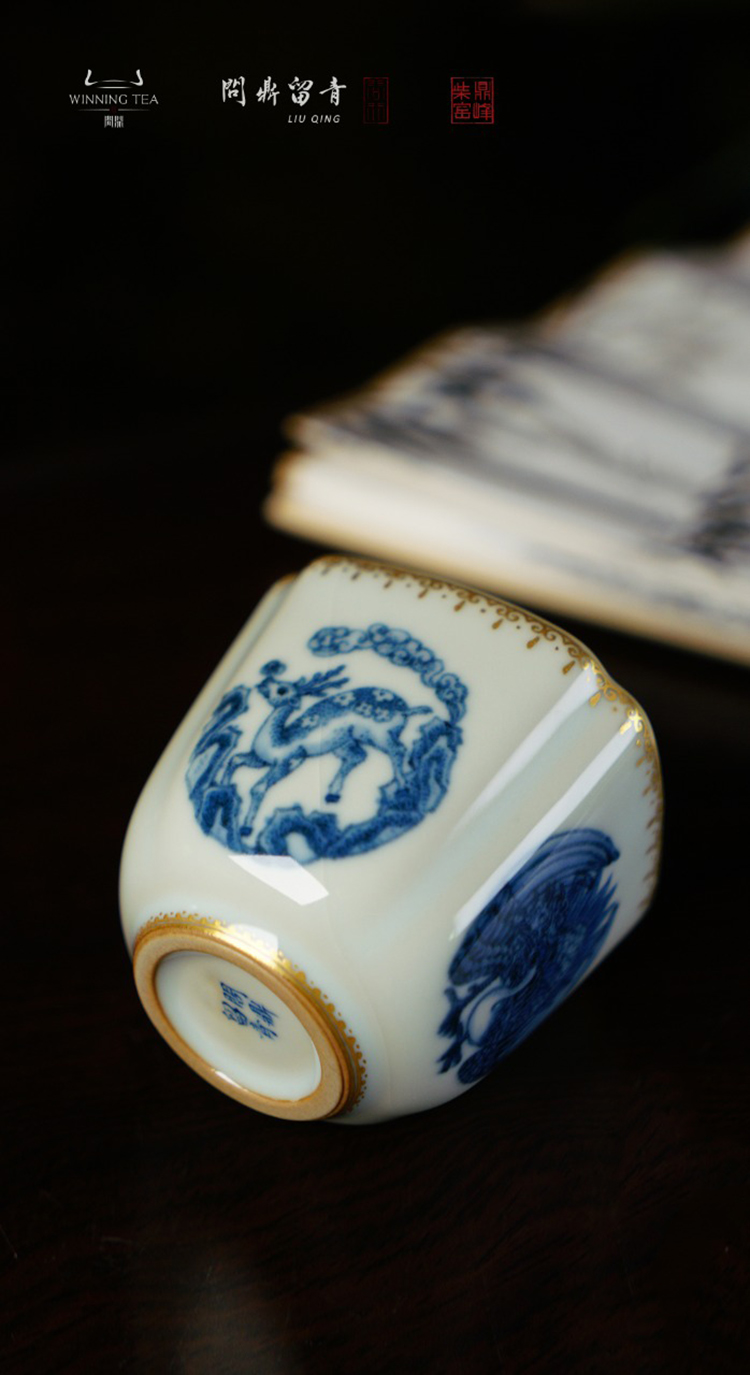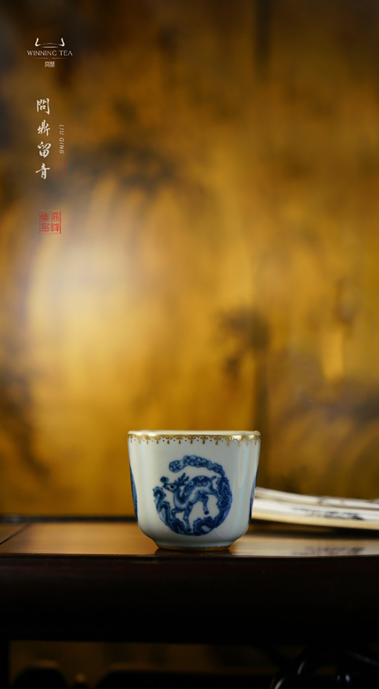 问鼎留青月白高四喜杯(青花斗金林深见鹿)