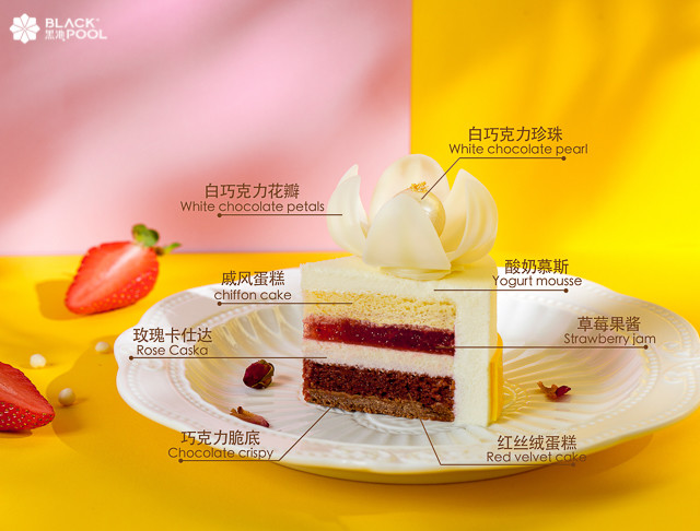 伊势鸡蛋、白砂糖、低筋粉、蛋白粉、大豆油、黄油、红丝绒蛋糕预拌粉、薄脆片、嘉利宝白巧克力33.1%、嘉利宝57.7%黑巧克力、50%浓郁榛子酱、巧克力风味酱、卡仕达预拌粉、玫瑰露酒、英士顿草莓果肉果酱、青柠汁、铁塔芝士、卡士有机酸奶、铁塔淡忌廉、柠檬巧克力