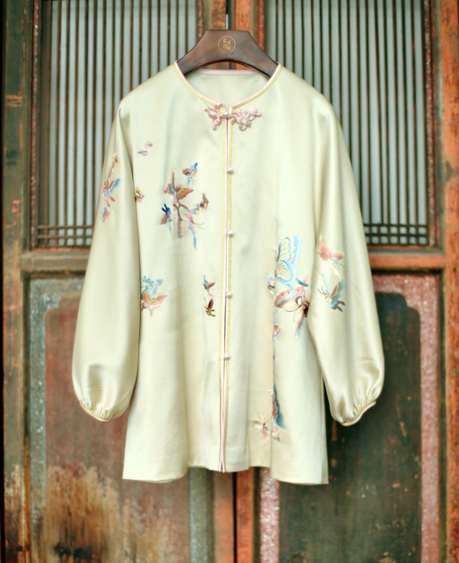 盛唐牡丹大师系列-卢梅红 | 重缎真丝手绣对襟外套-香槟色(盛唐牡丹与非遗传承人卢梅红联名系列)