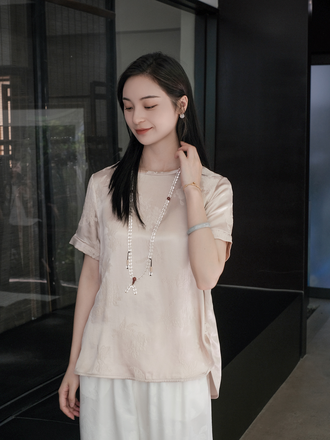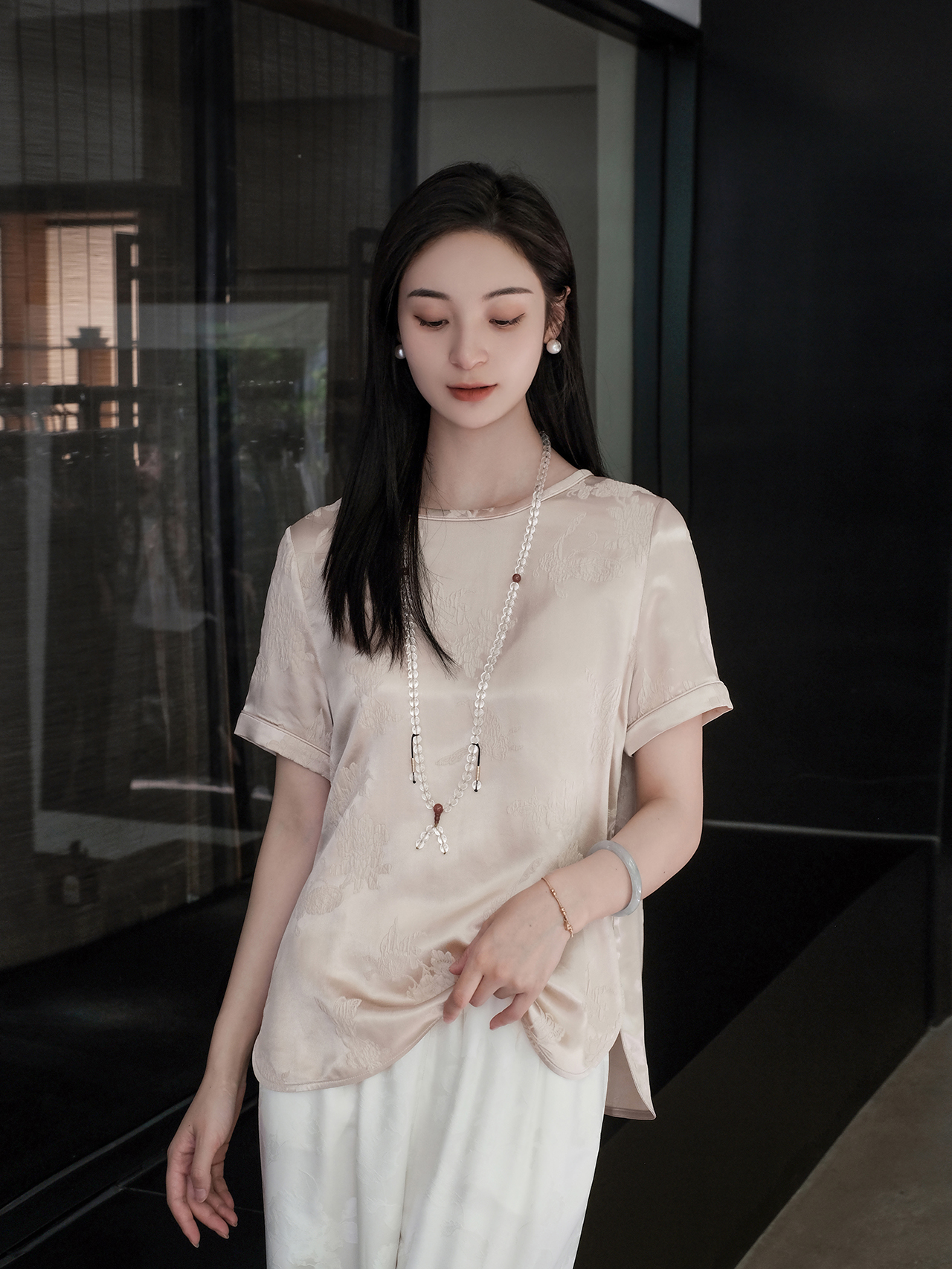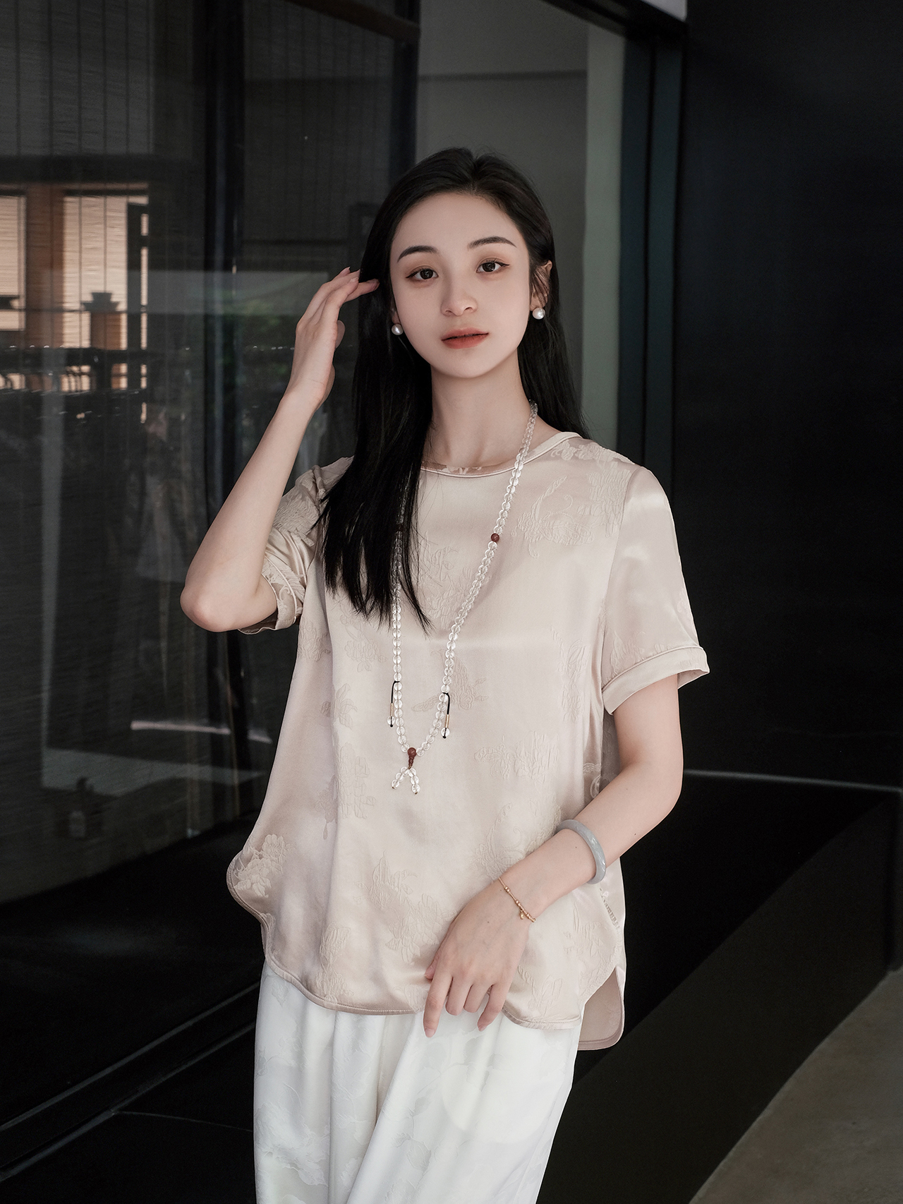 盛唐牡丹 |真丝压花圆领女上衣-黑色