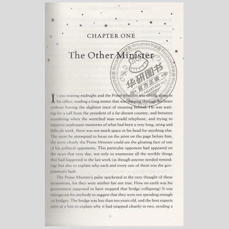 It was nearing midnight and the Prime Minister was sitting alone in his office, reading a long memo that was slipping through his brain without leaving the slightest trace of meaning behind. He was waiting for a call from the President of a far distant country, and between wondering when the wretched man would telephone, and trying to suppress unpleasant memories of what had been a very long, tiring, and difficult week, there was not much space in his head for anything else. The more he attempted to focus on the print on the page before him, the more clearly the Prime Minister could see the gloating face of one of his political opponents. This particular opponent had appeared on the news that very day, not only to enumerate all the terrible things that had happened in the last week (as though anyone needed reminding) but also to explain why each and every one of them was the government’s fault.