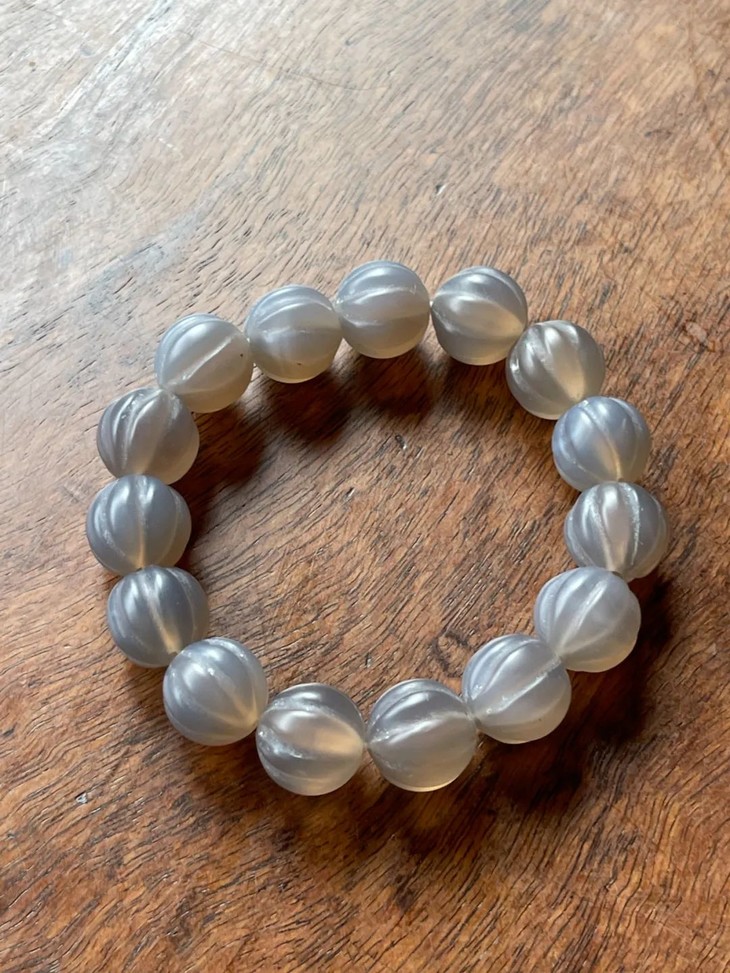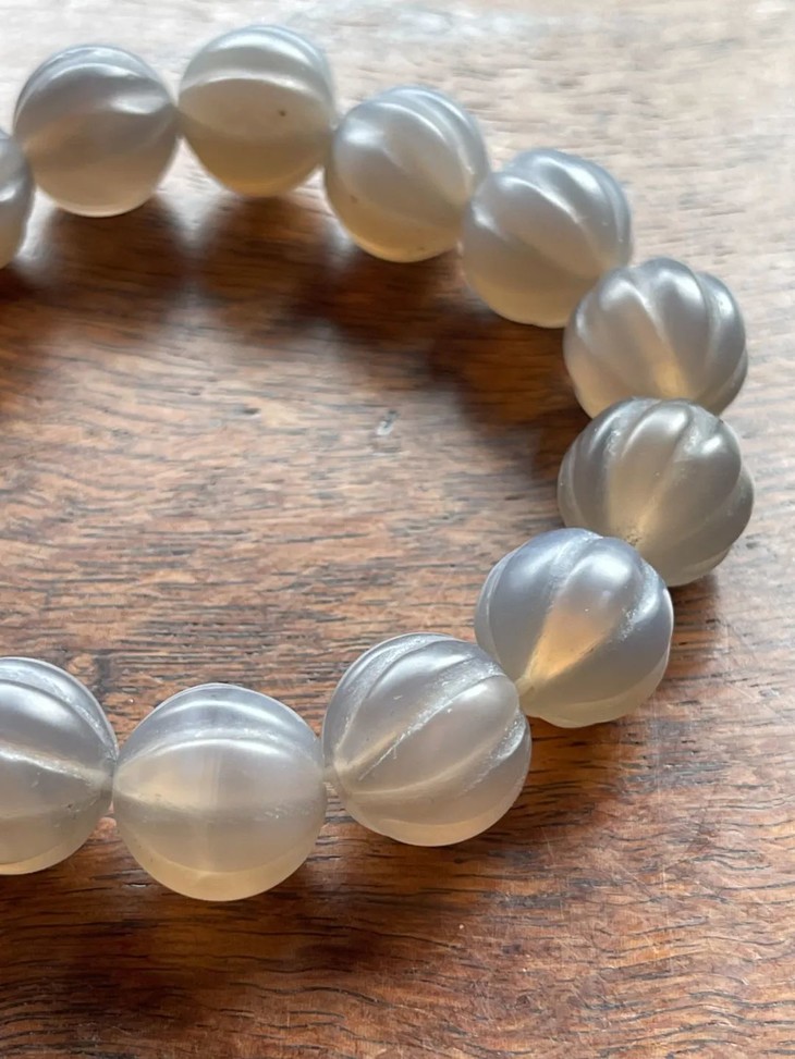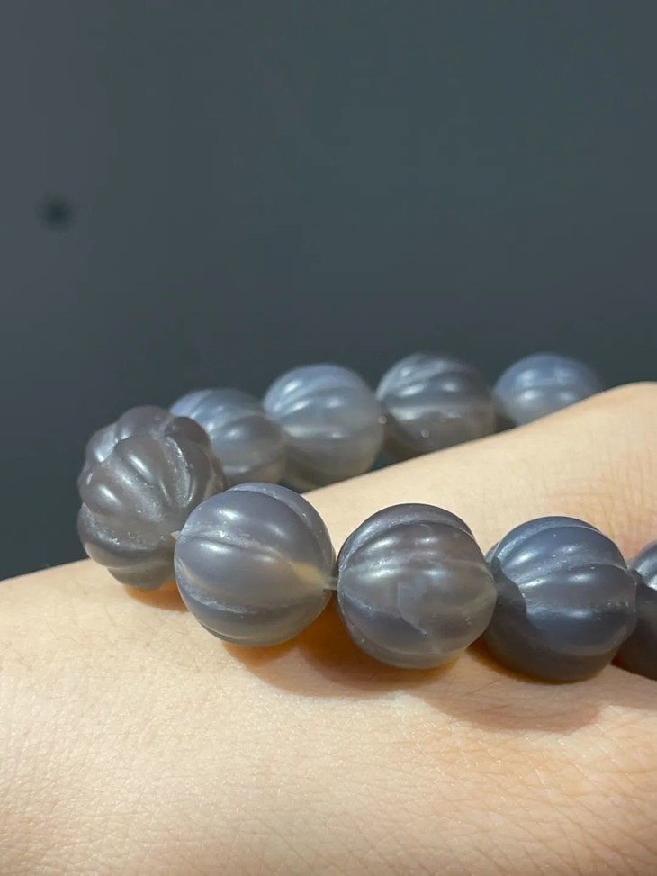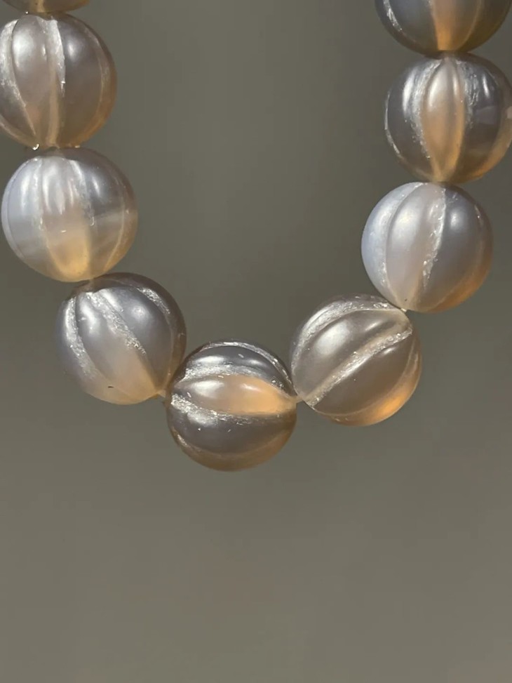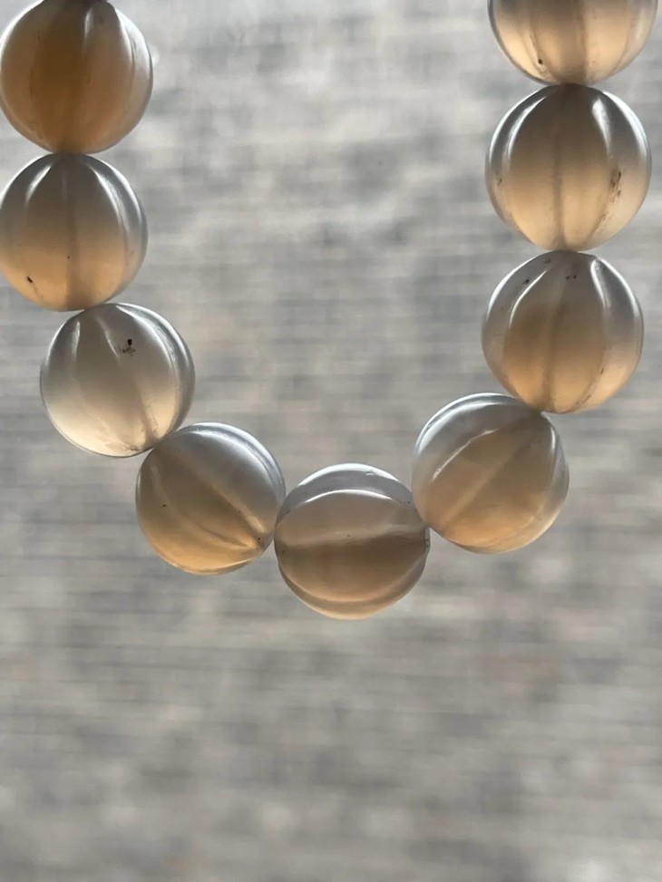 这是一组质地透明色泽柔美,缠丝纹理隐约可见的藕色冰糖鱼脑冻玛瑙瓜棱珠手链,质地晶莹通透,淡藕色的天然冰糖鱼脑冻玛瑙,琢磨成瓜棱型珠共十五粒,色泽柔美、质地温润,半通透纯粹无瑕,缠丝纹理隐约可见,老风化痕与包浆皮壳温润如玉,珠型独特、精緻细腻、孔道内沿磨损圆润,以弹性伸缩线串成手链。
