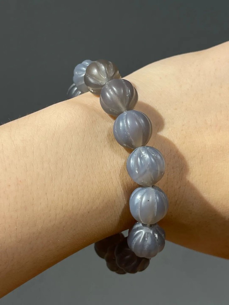 此组鱼瑙冻玛瑙瓜棱珠手链,藕色鱼脑冻玛瑙色泽柔美温润,纹理自然流畅,瓜棱珠型独特、质地纯净、半通透细腻,入手即可佩戴,整体风格特别新潮时尚,或可利用此组美丽的珠子融入新潮首饰设计,珠型独特,纹理鲜明淡雅,绝不落俗套。