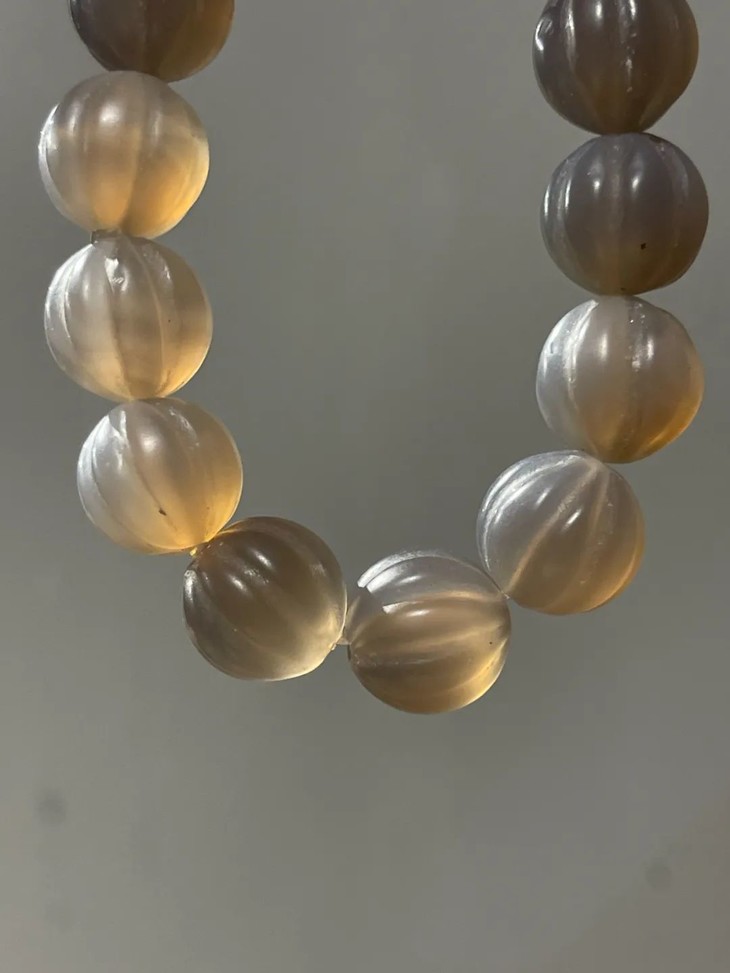此鱼瑙冻玛瑙瓜棱珠手链,除表面沟槽内风化痕与孔沿小磕碰之外,全串保存完好。