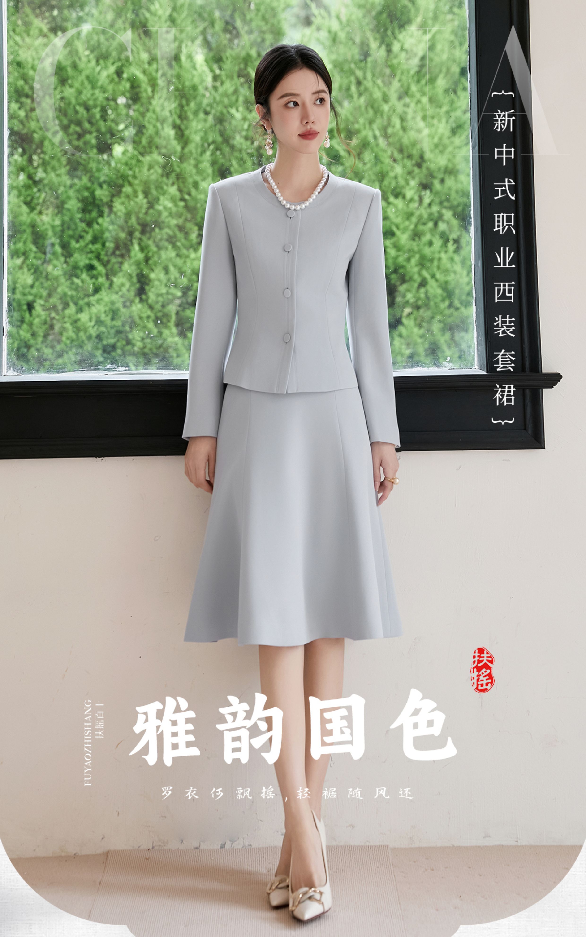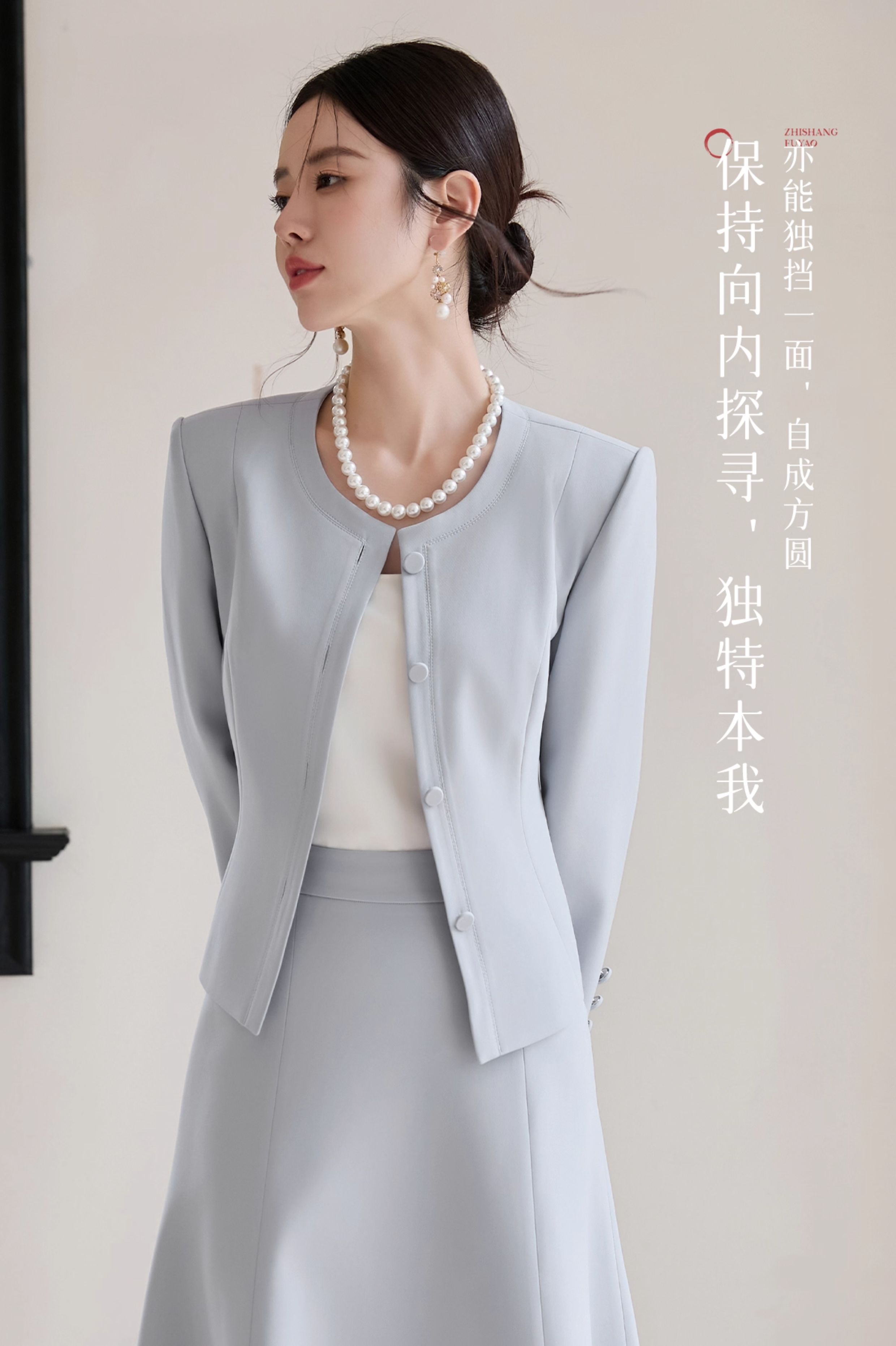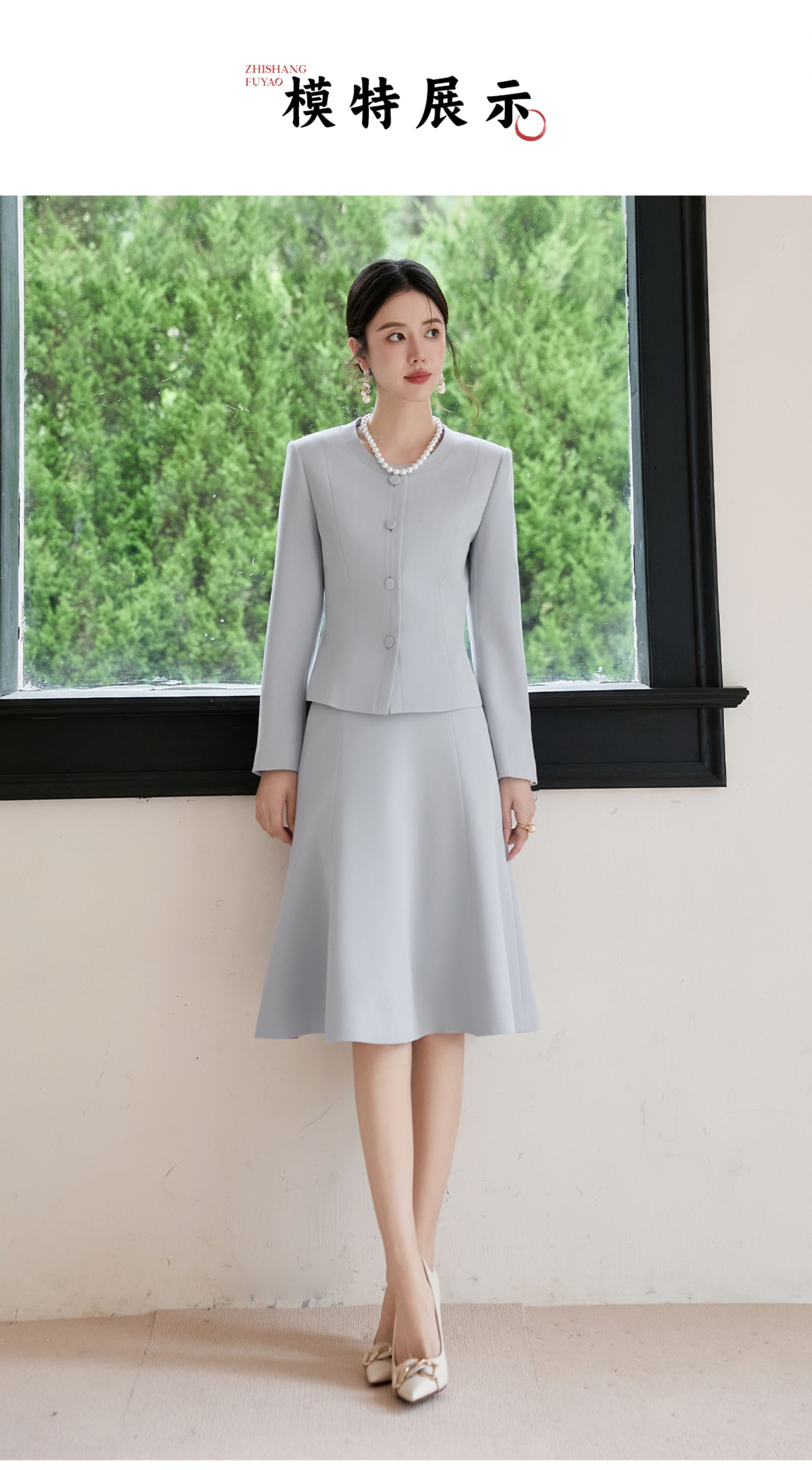 FUYAO扶摇 醋酸时尚套装女2025秋季蓝色圆领气质小香风西装两件套