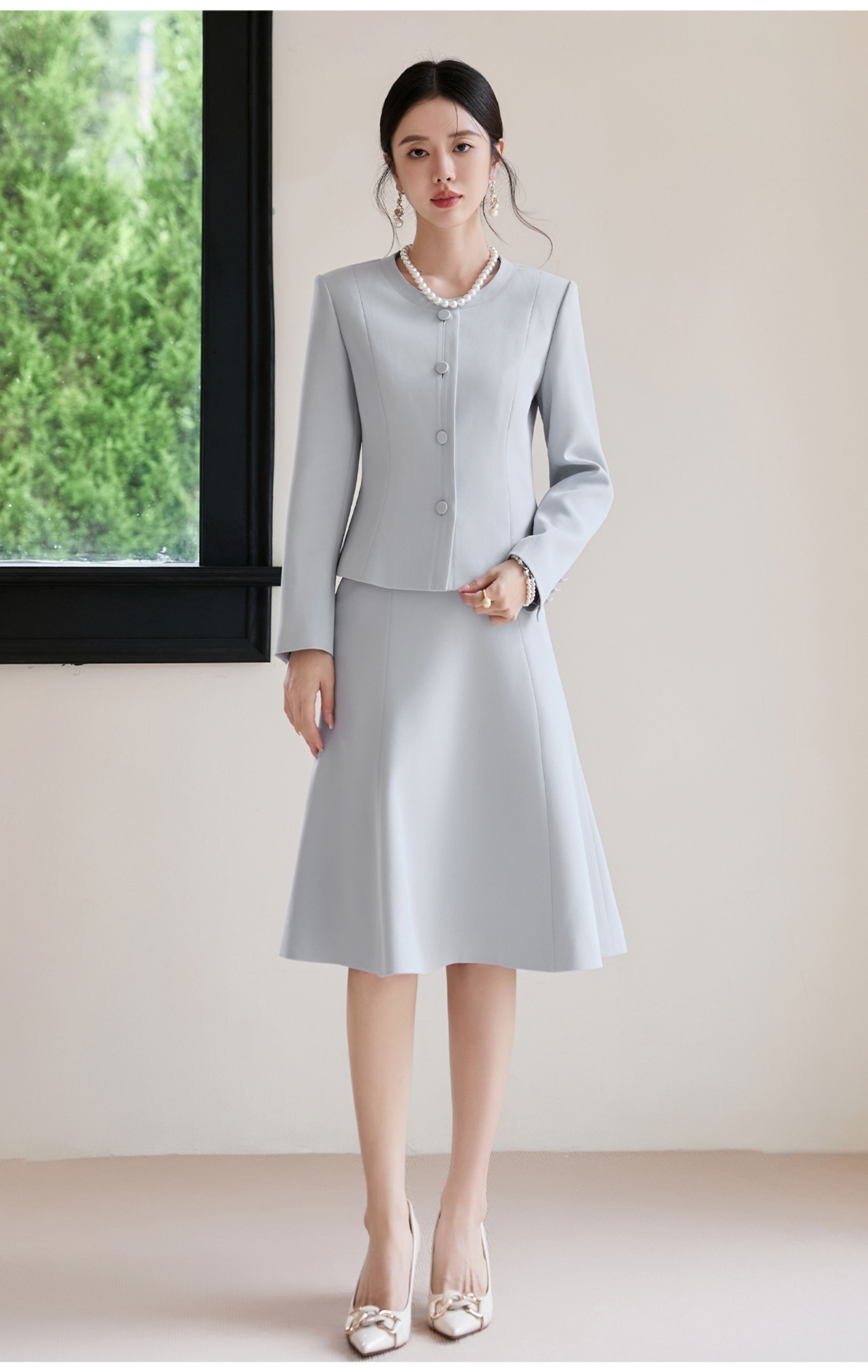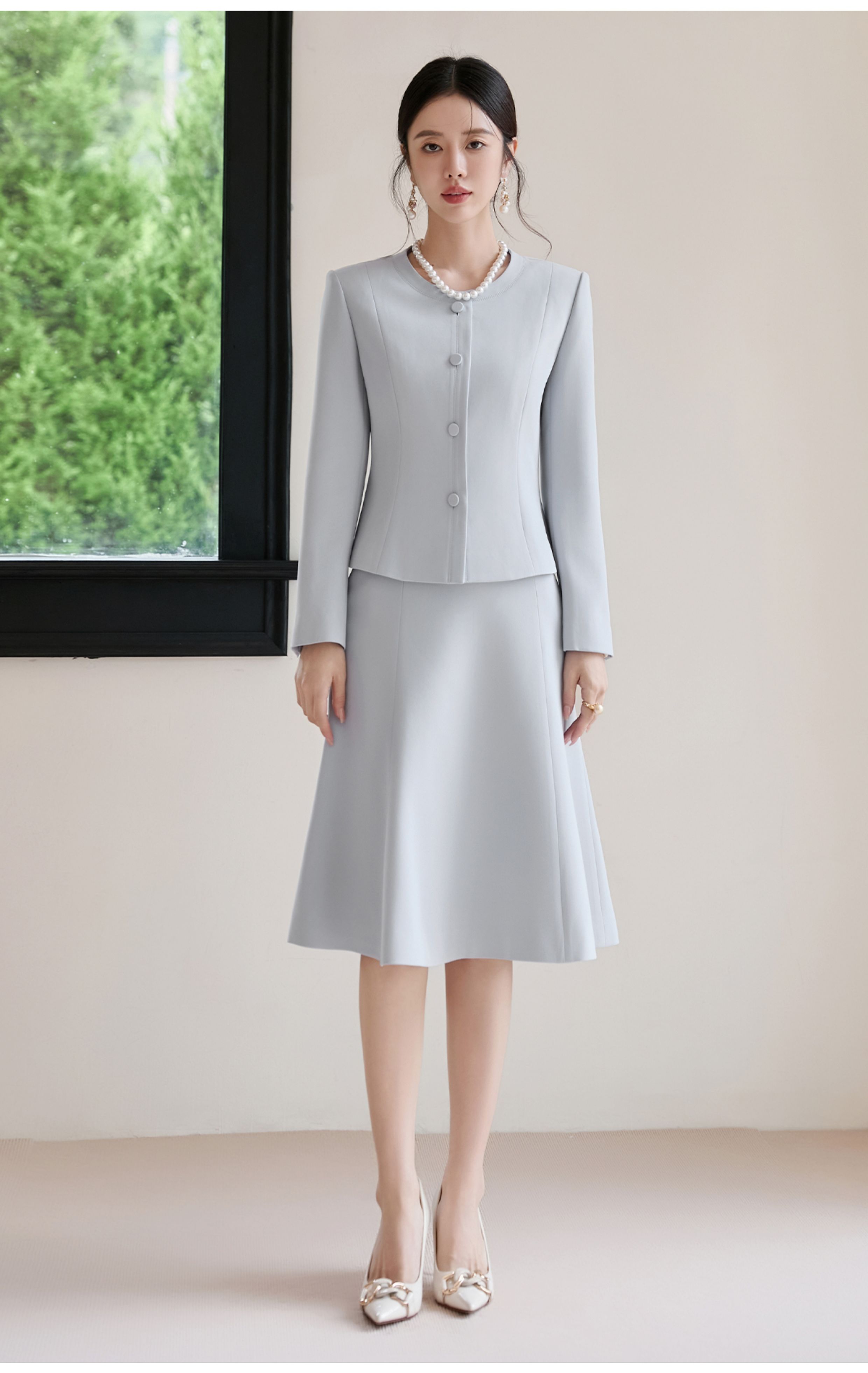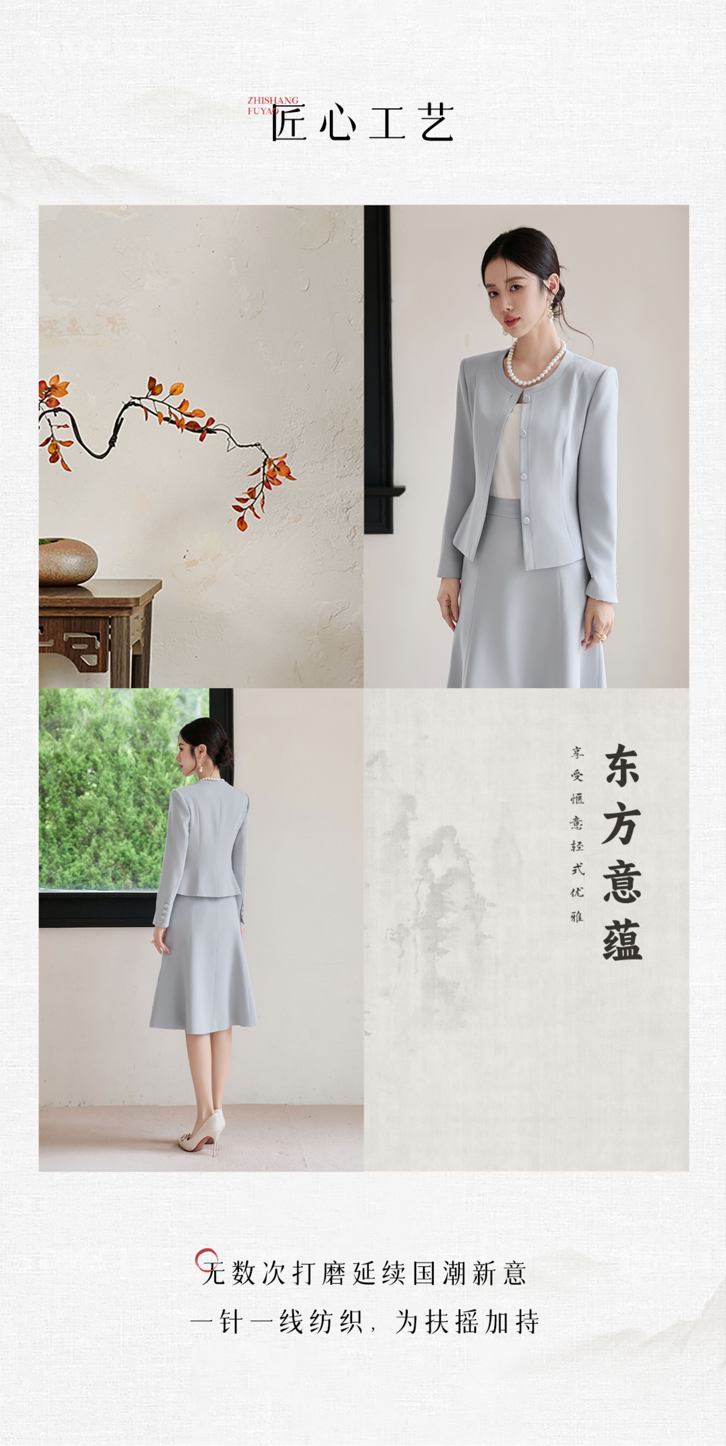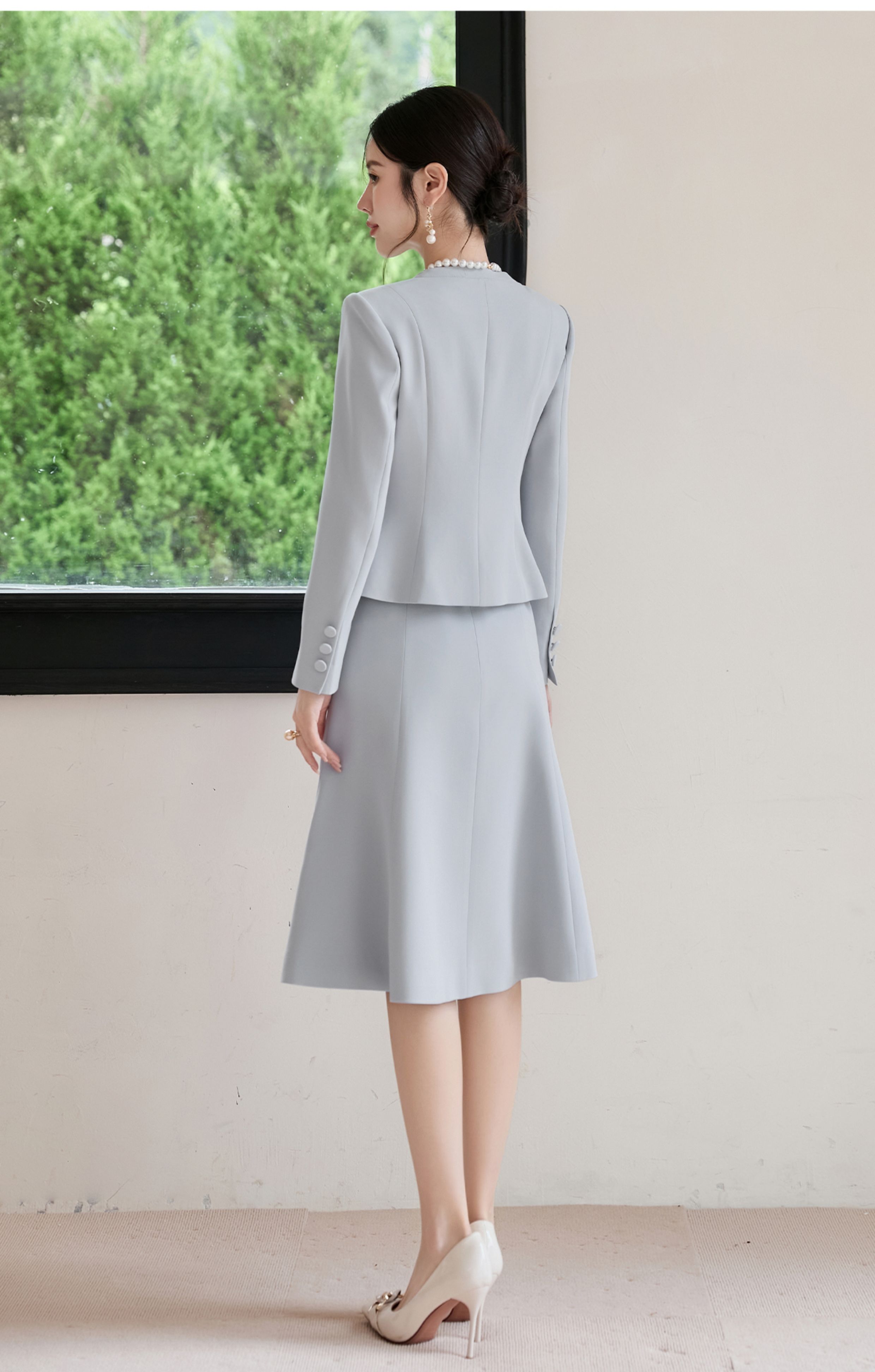 FUYAO扶摇 醋酸时尚套装女2025秋季蓝色圆领气质小香风西装两件套