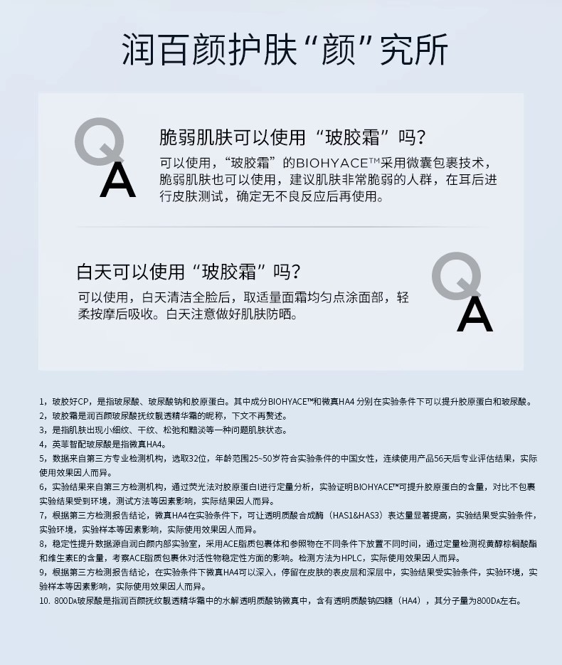 润百颜(BIOHYALUX)作为华熙生物旗下专研玻尿酸(学名透明质酸)的核心品牌,主要涵盖医疗美容、功能性护肤品两大业务板块,EC线下诊所也会用到他家的针剂。润百颜产品的核心原料透明质酸,都的华熙生物自有生产,不仅获得美国DMF登记号,还于2019年第四次顺利通过美国FDA的现场检查。基于华熙生物所独有的透明质酸生产专利技术,润百颜的原料在不同分子量透明质酸的复配上具有技术优势。