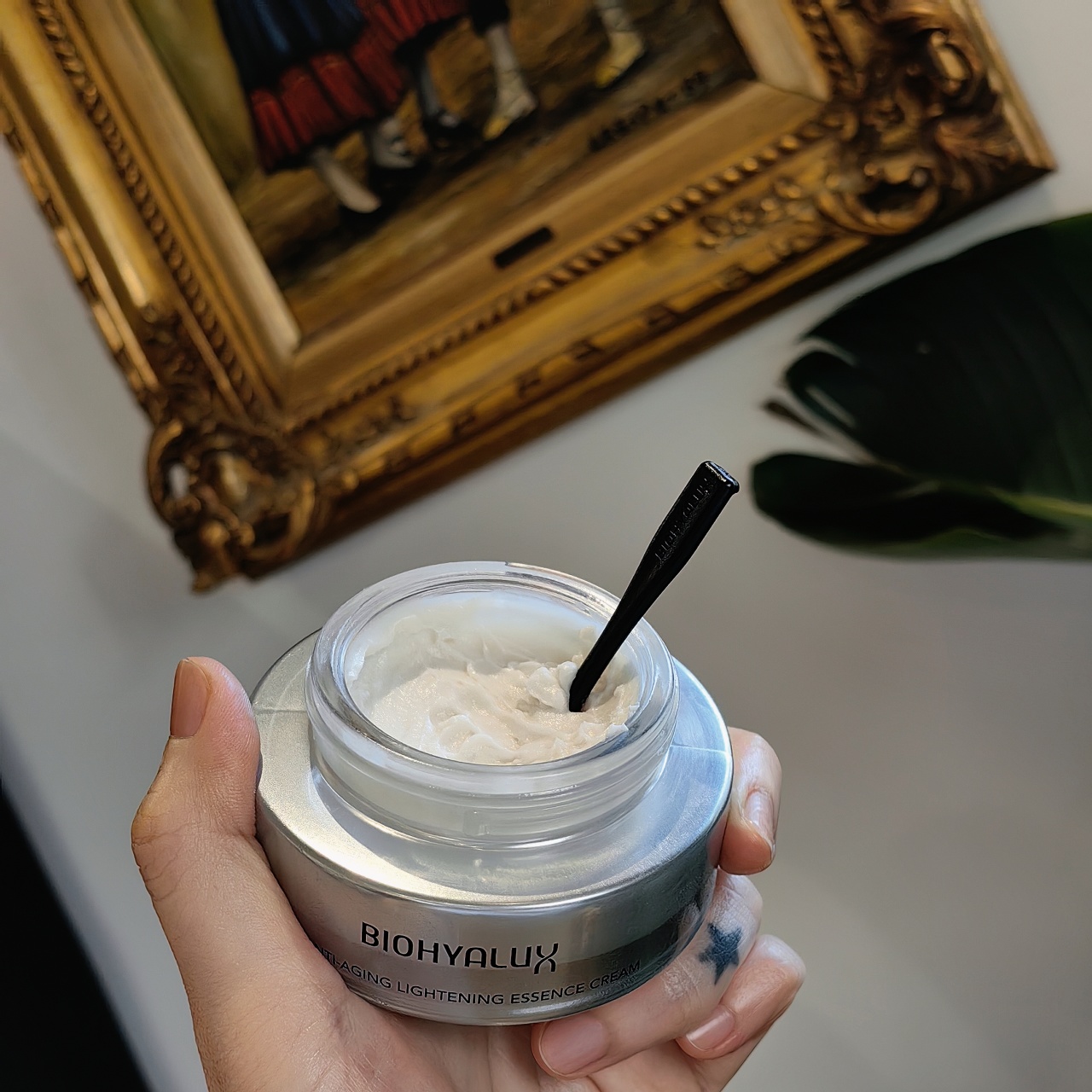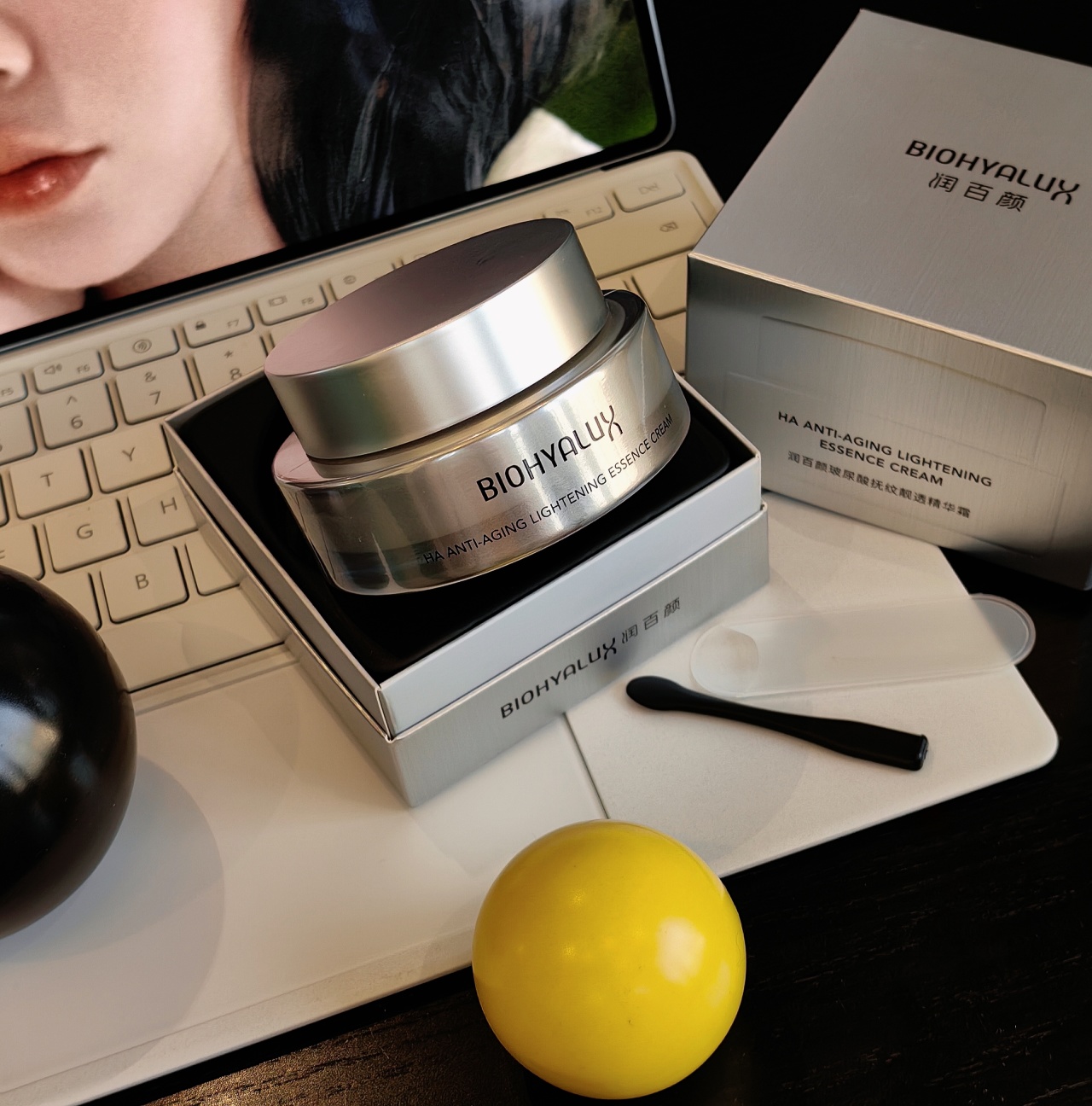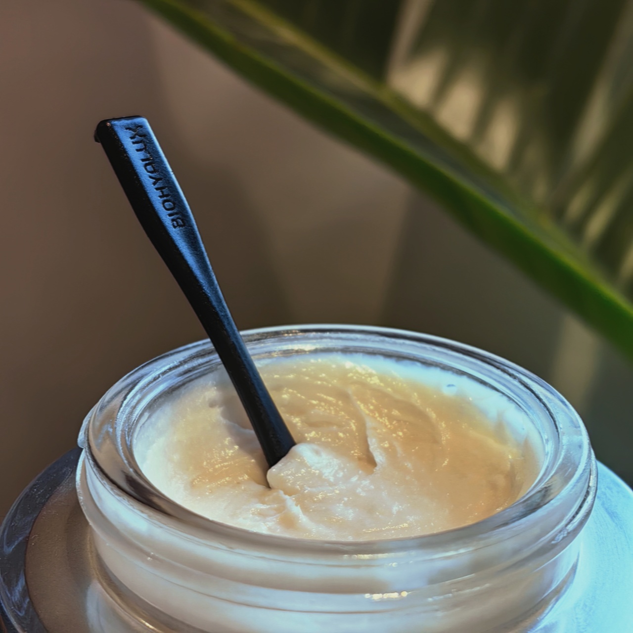 玻胶霜的质地很怪,渣渣的,像浓稠的豆乳,很厚,但肤感很好,至少我这种爱油油保湿感的是很喜欢啊!只要用配的黑色小勺,挖出一点点精华霜,两粒黄豆大小就可以均匀涂满全脸了,延展性很强,上脸后也是润润,感觉脸蛋子像吸满了水一样!而且还有一层保护膜,我涂手后,真的是忍不住搓来搓去,非常嫩滑滑,很像之前润百颜套盒里面霜的感觉,但又是Plus的,加倍的感觉!