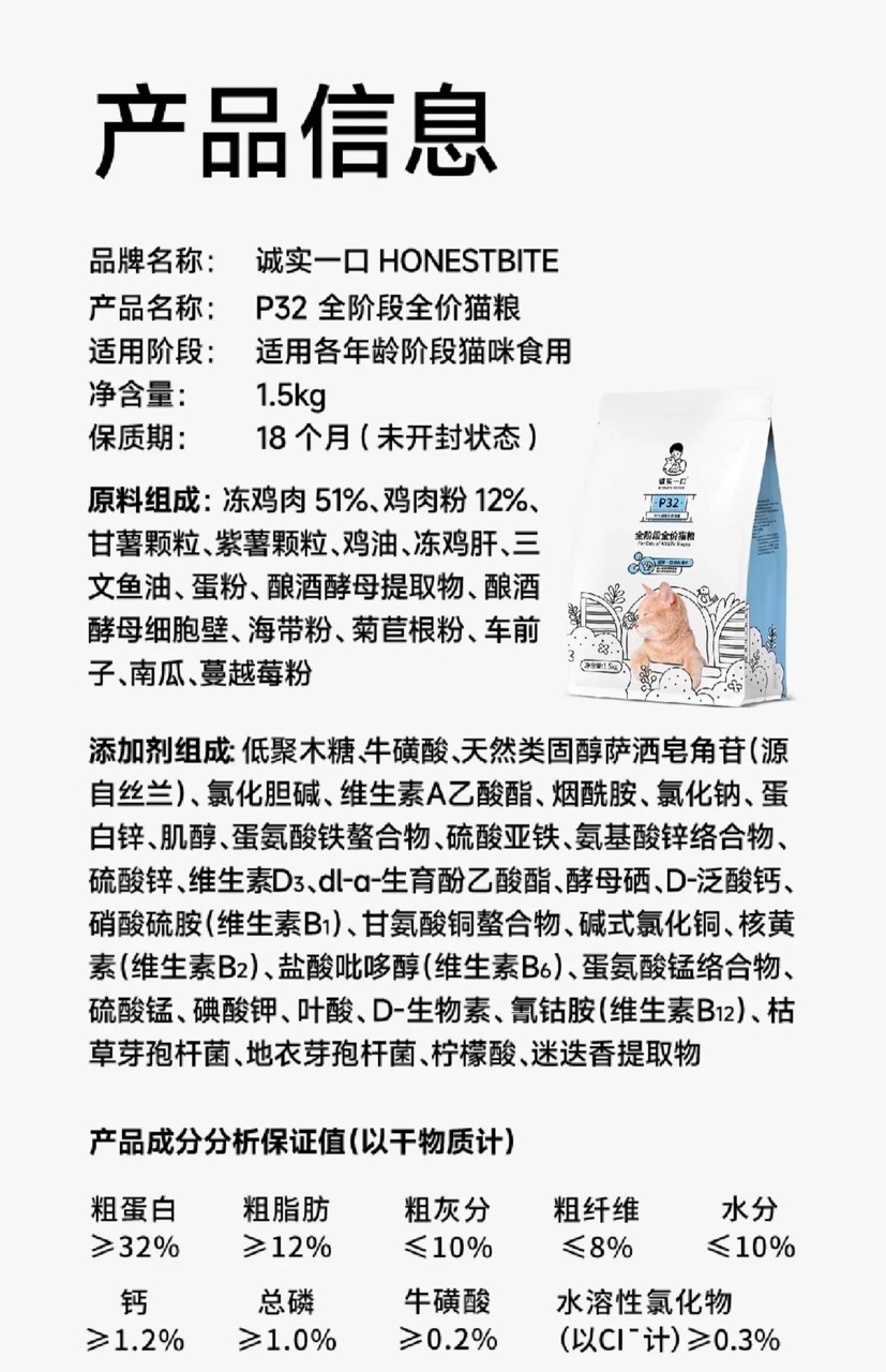 诚实一口P32天然无谷全期全价低敏通用成猫鸡肉猫粮1.5kg