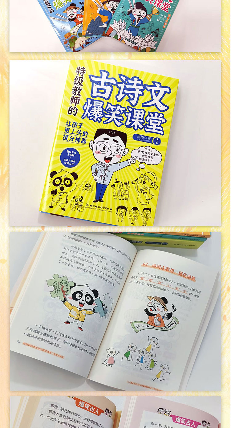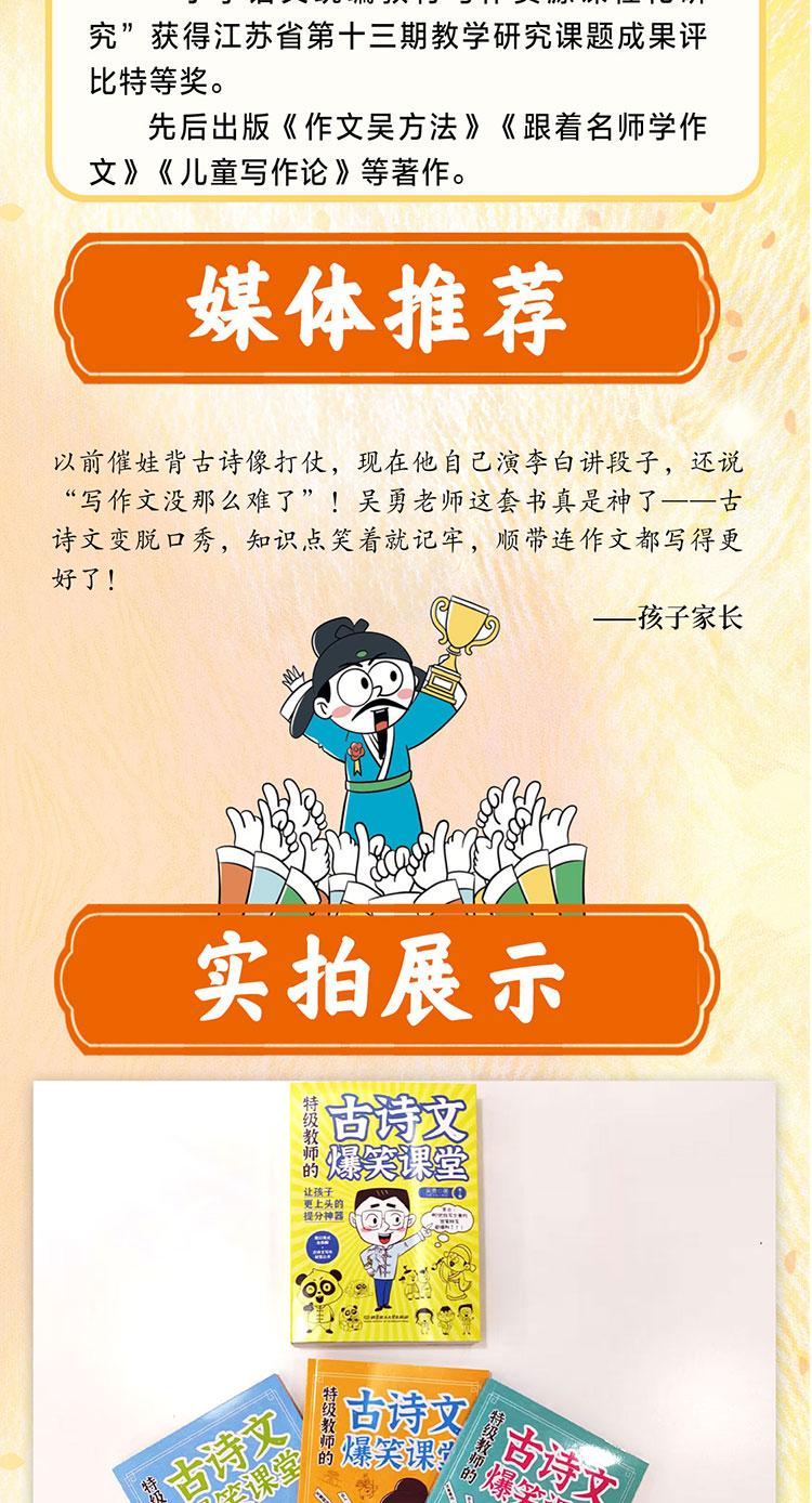 以前催娃背古诗像打仗,现在他自己演李白讲段子,还说lsquo;写作文没那么难了rsquo;!吴勇老师这套书真是神了古诗文变脱口秀,知识点笑着就记牢,顺带连作文都写得更好了!孩子家长