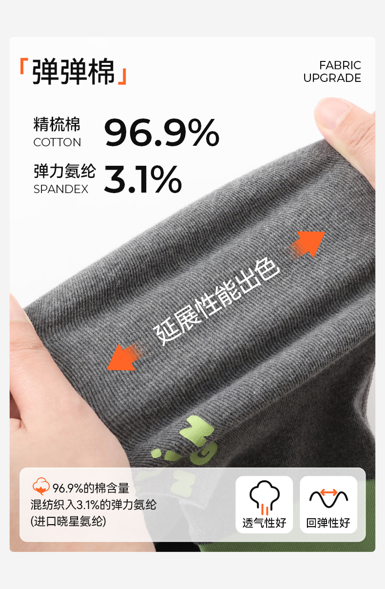 96.9%非常高的棉含量,混纺织入3.1%的弹力氨纶(进口晓星氨纶),上身柔软包裹不紧绷,膝盖不易鼓包。棉纤维的天然属性,又决定了亲肤和透气性,让孩子穿的舒适,出汗也不粘腻。