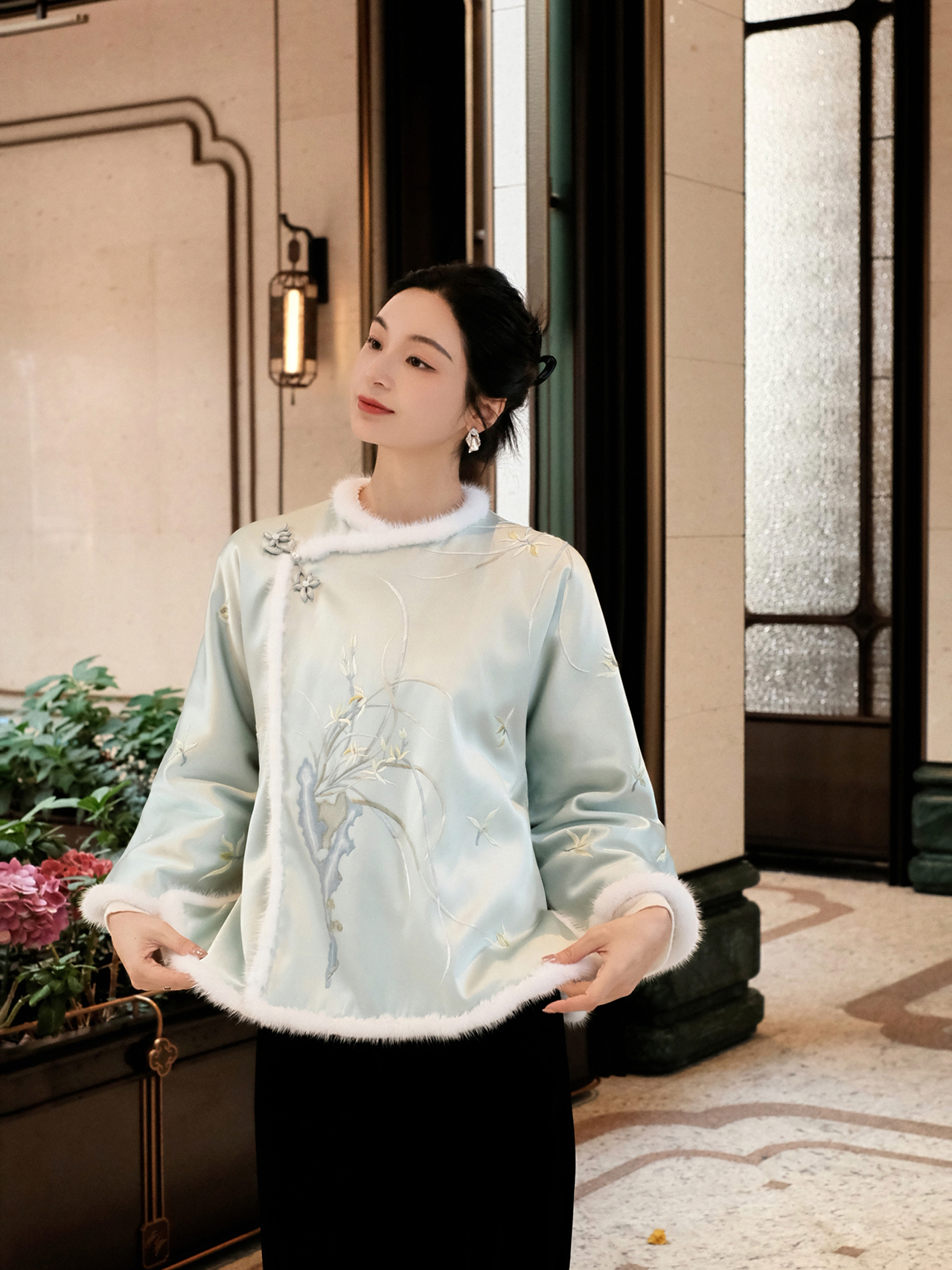 大师系列| 青色重缎真丝手绣兰花水貂棉外套