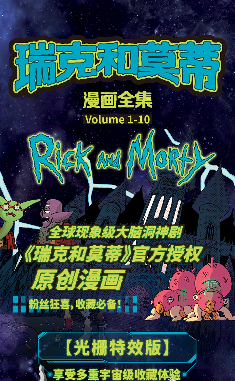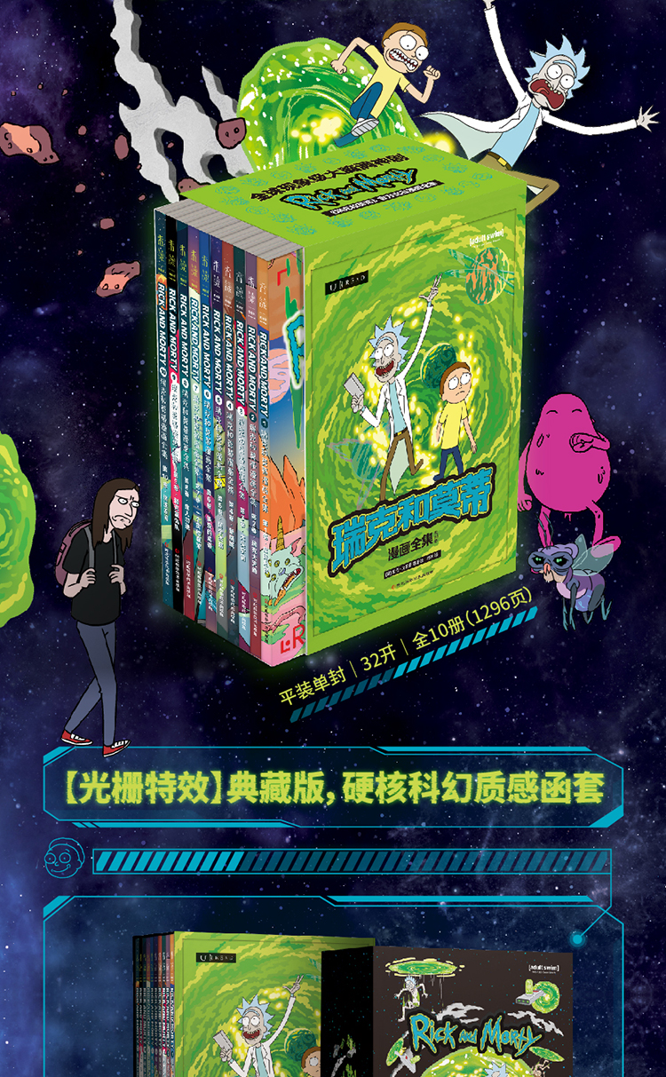 瑞克和莫蒂漫画全集(光栅特效典藏版,函套平装全10册),赠贴纸随机一款(50枚)。深吸一口气,潜入瑞克和莫蒂的疯狂宇宙!